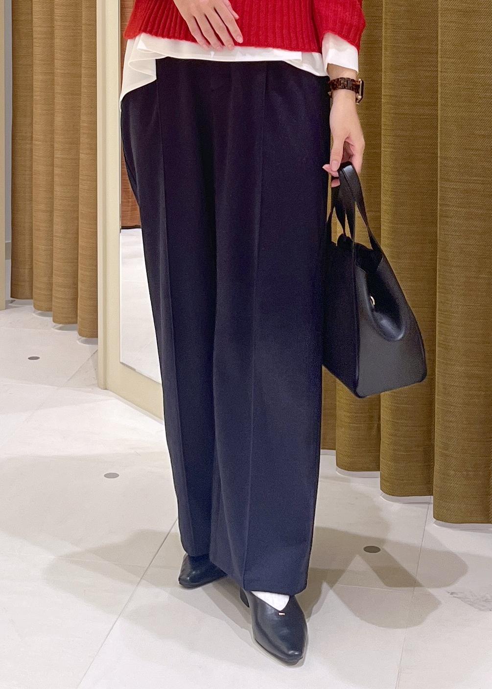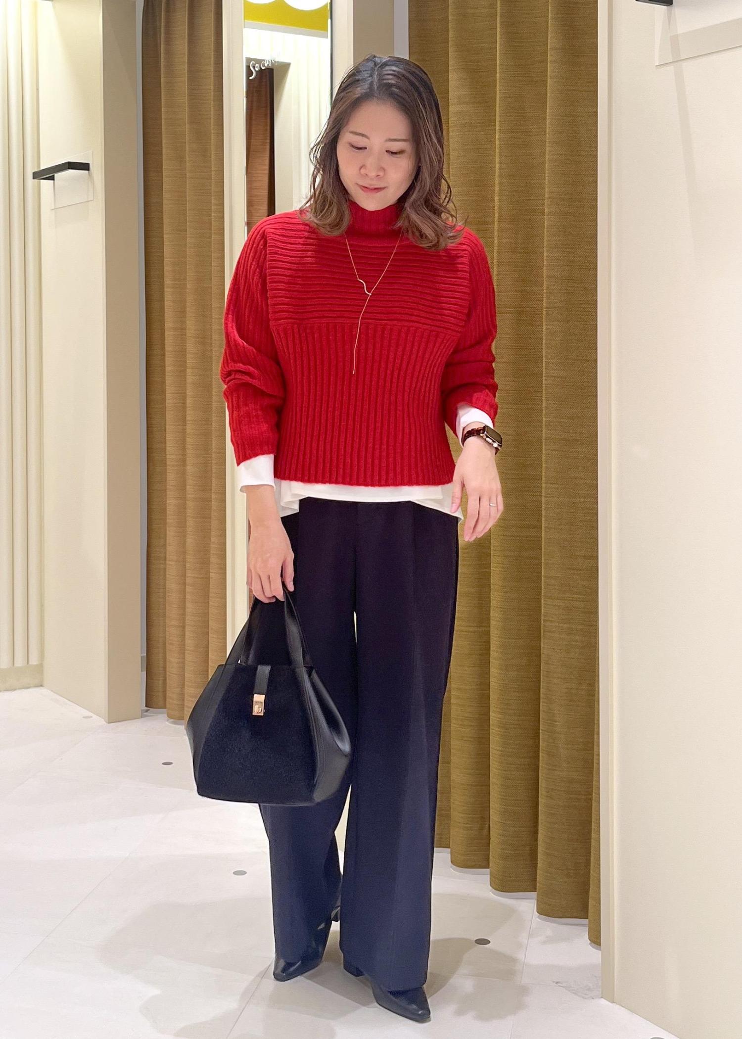 鮮やかな赤のカラーニットも、ネイビーのパンツやジャコットで合わせるときちんと見えも叶います。
