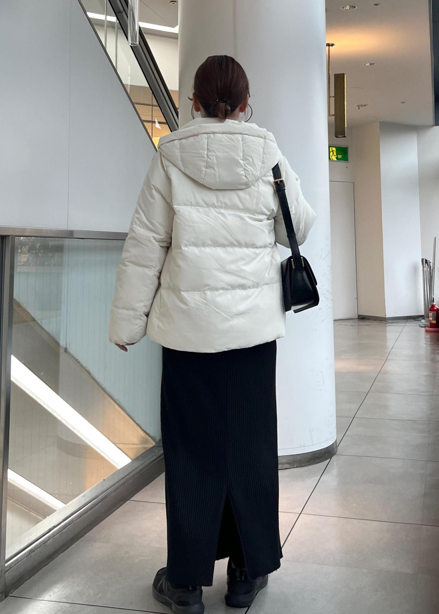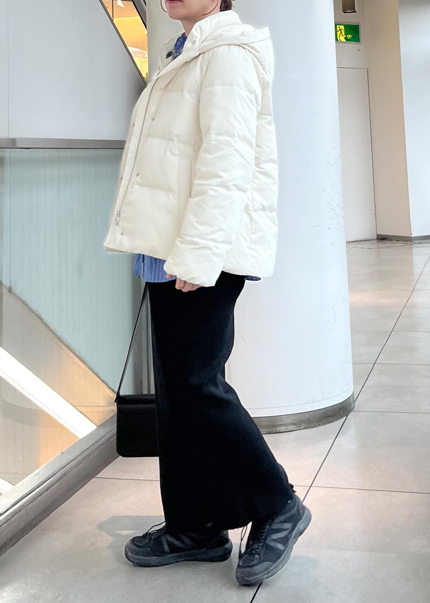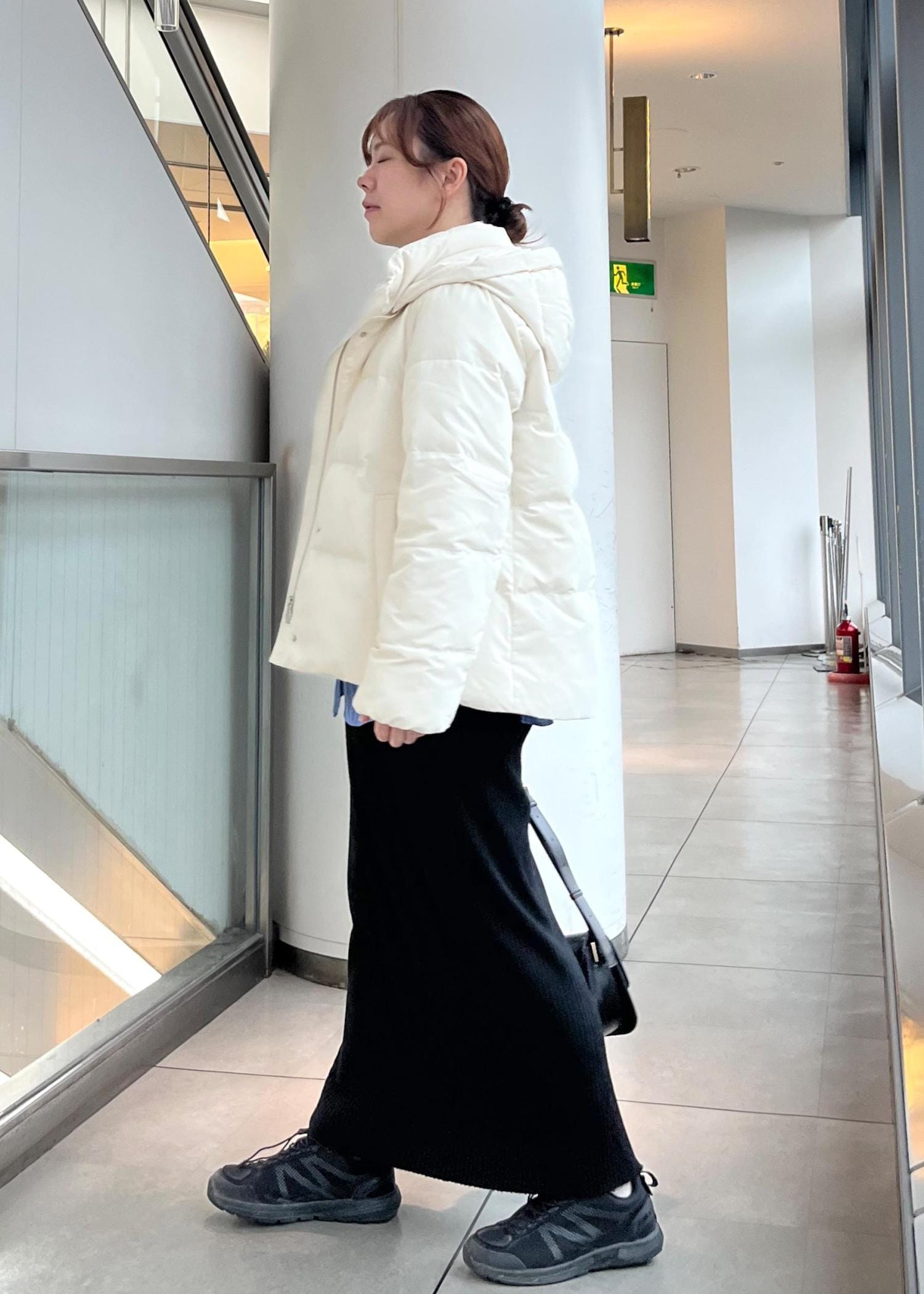 とても軽くて暖かく着用でき、中のダウンが詰まりすぎていないのでシルエットがキレイです。 -