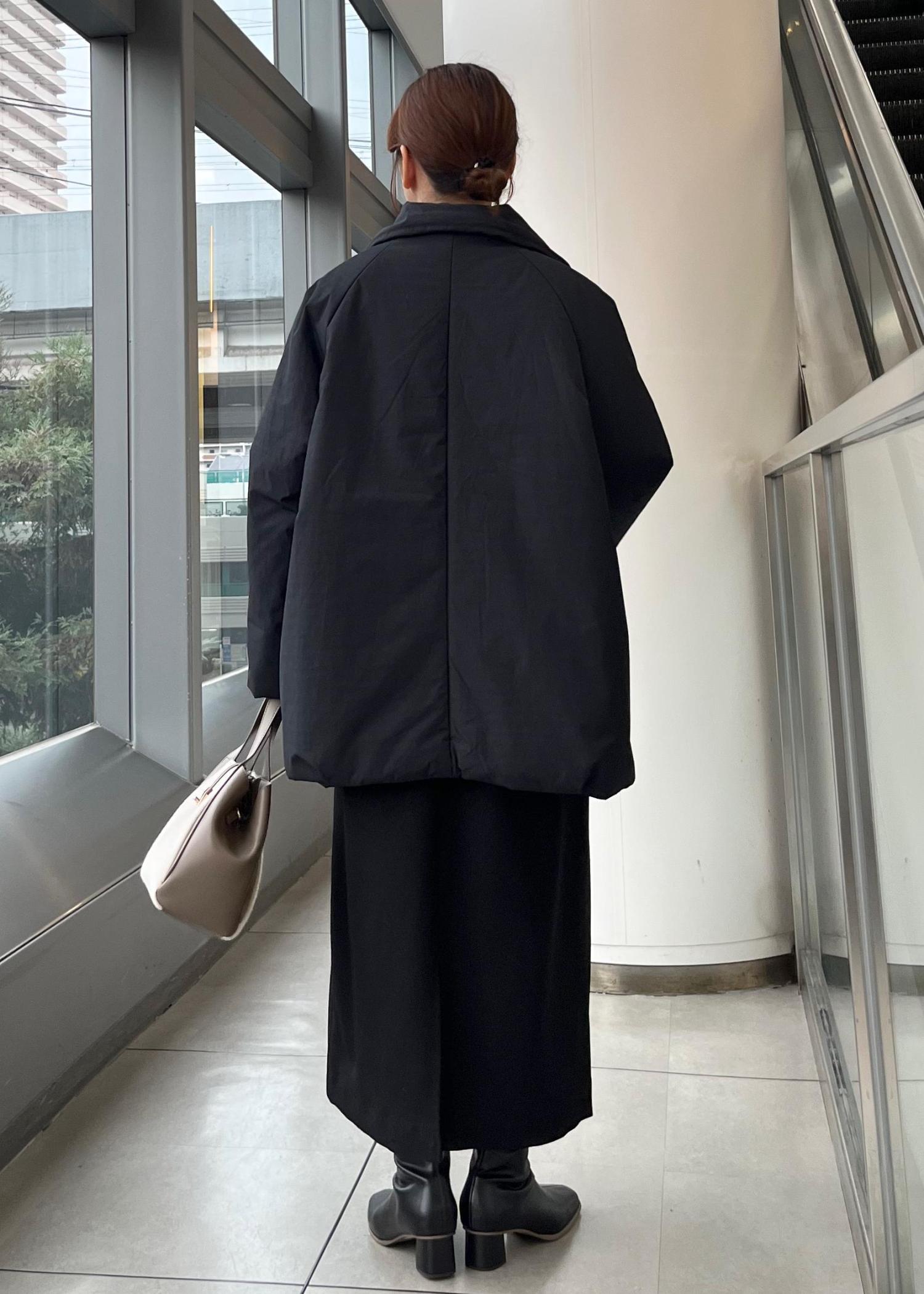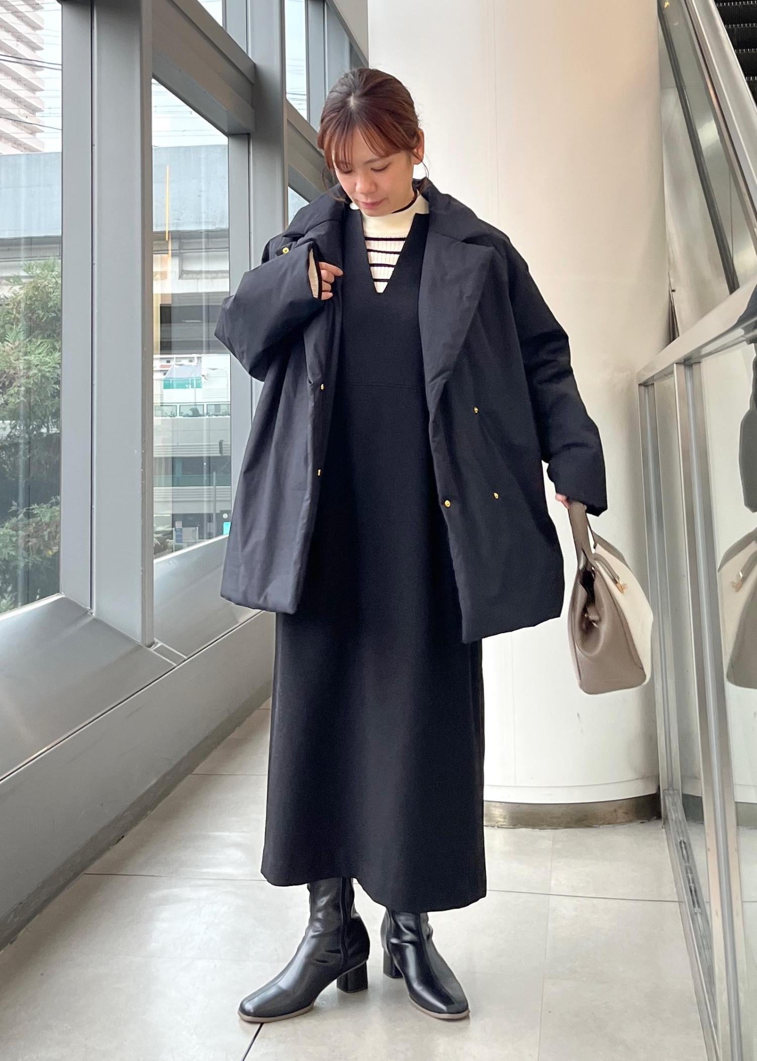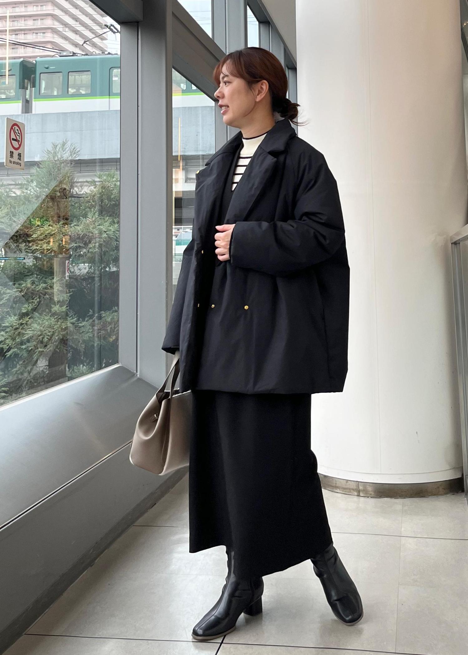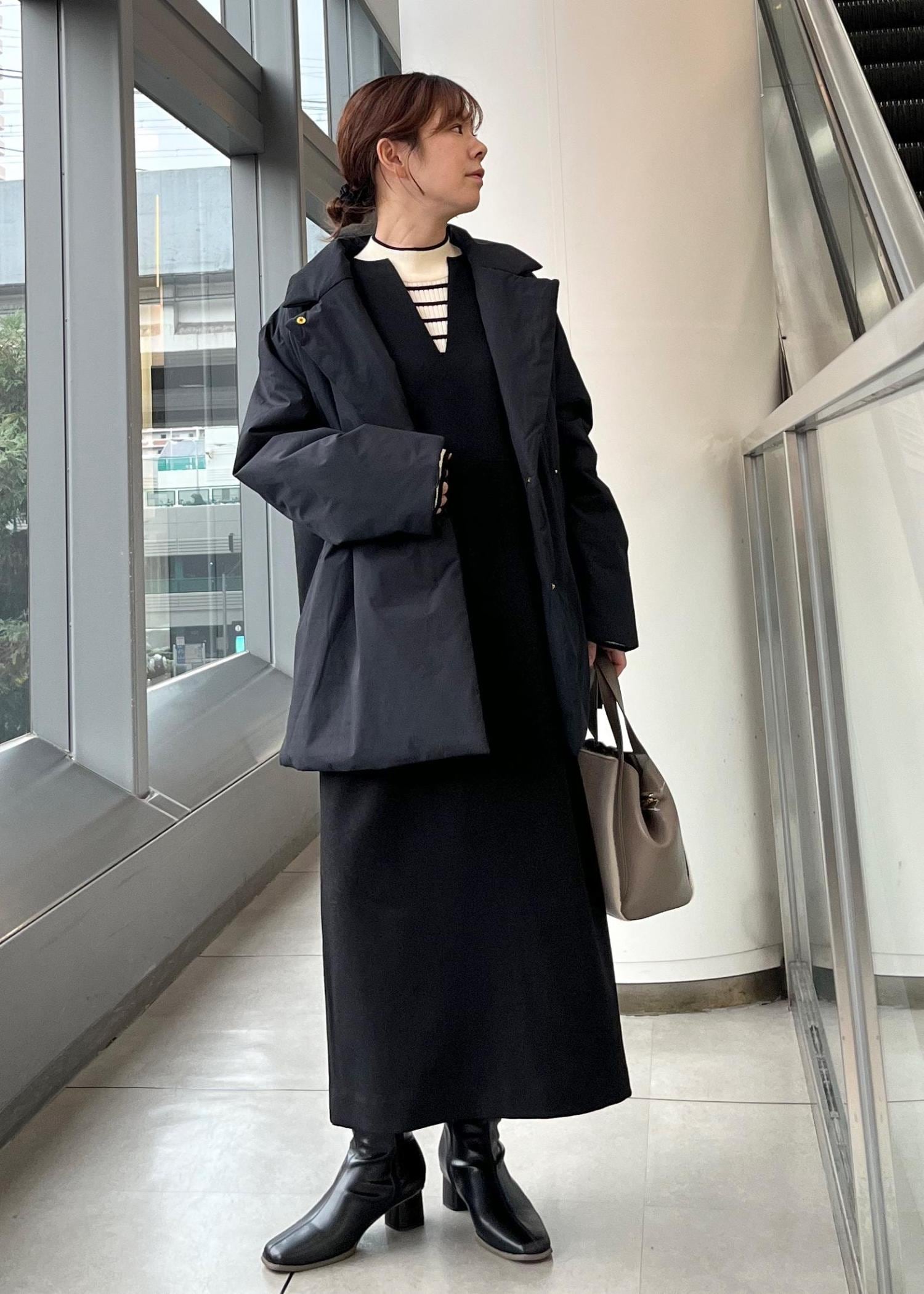 お尻がすっぽり隠れる着丈のコクーンシルエット。ワンピース合わせでもバランス良く着れました。 -