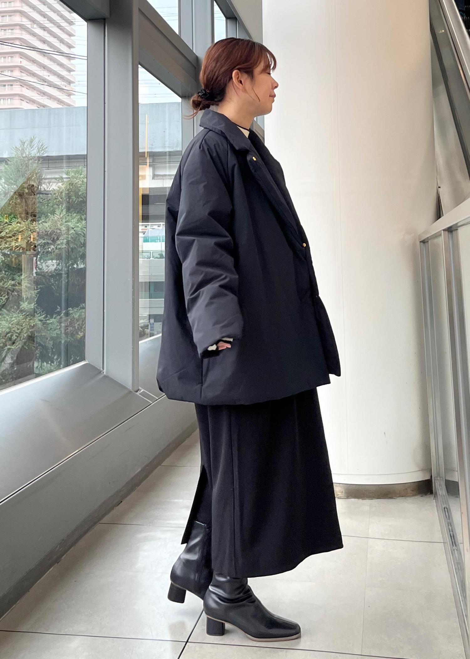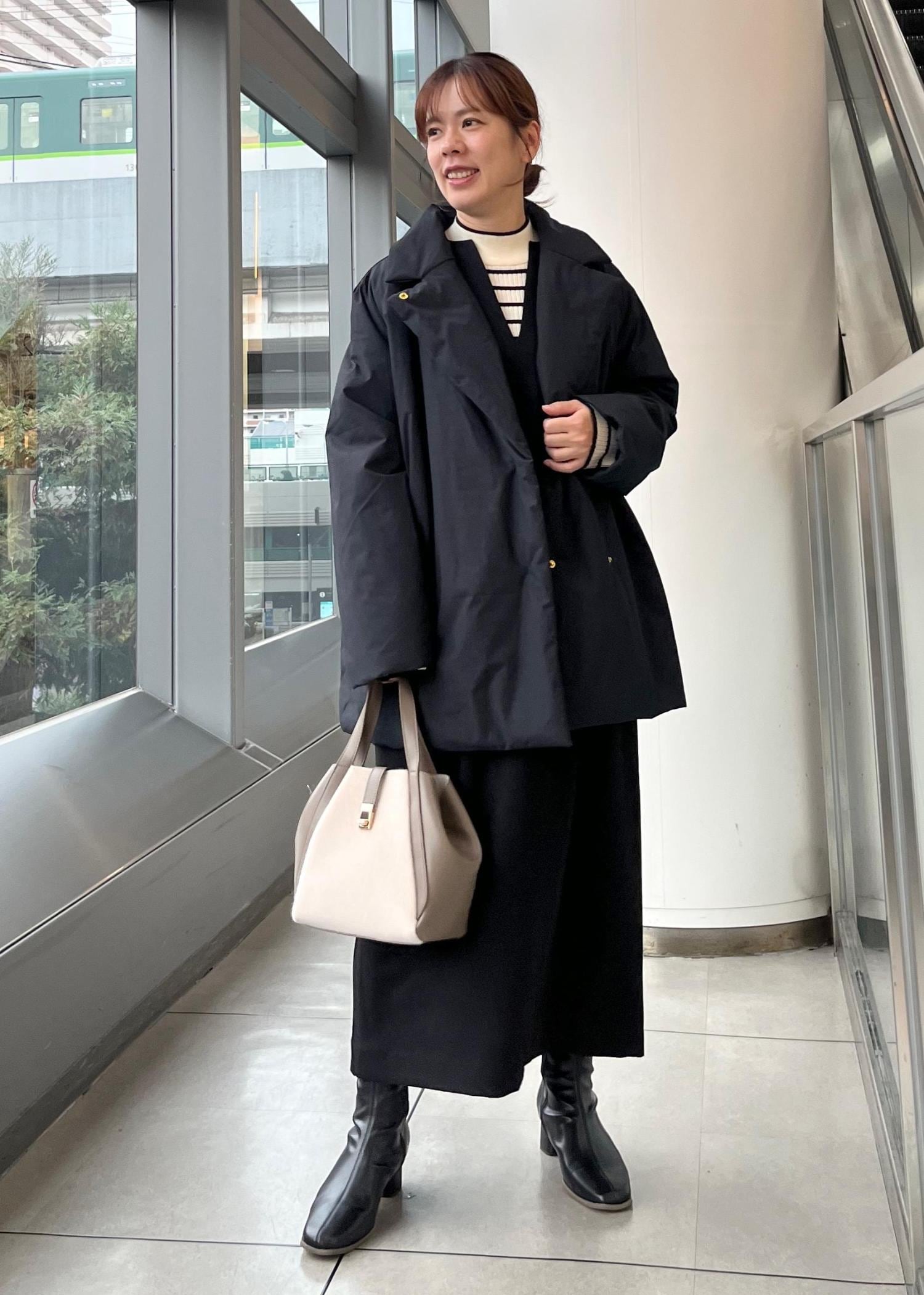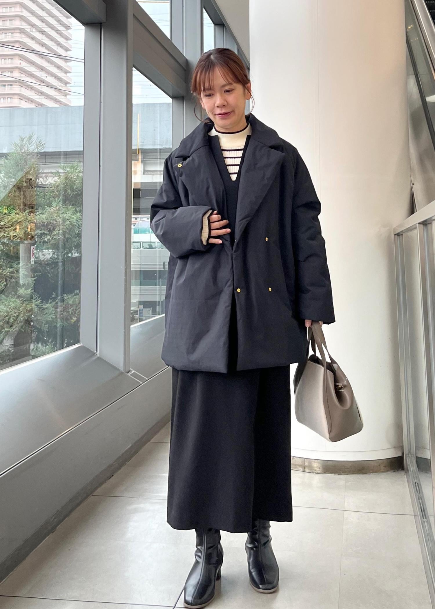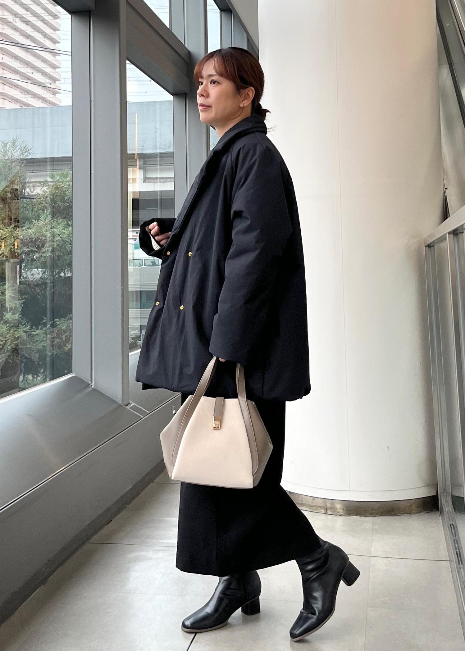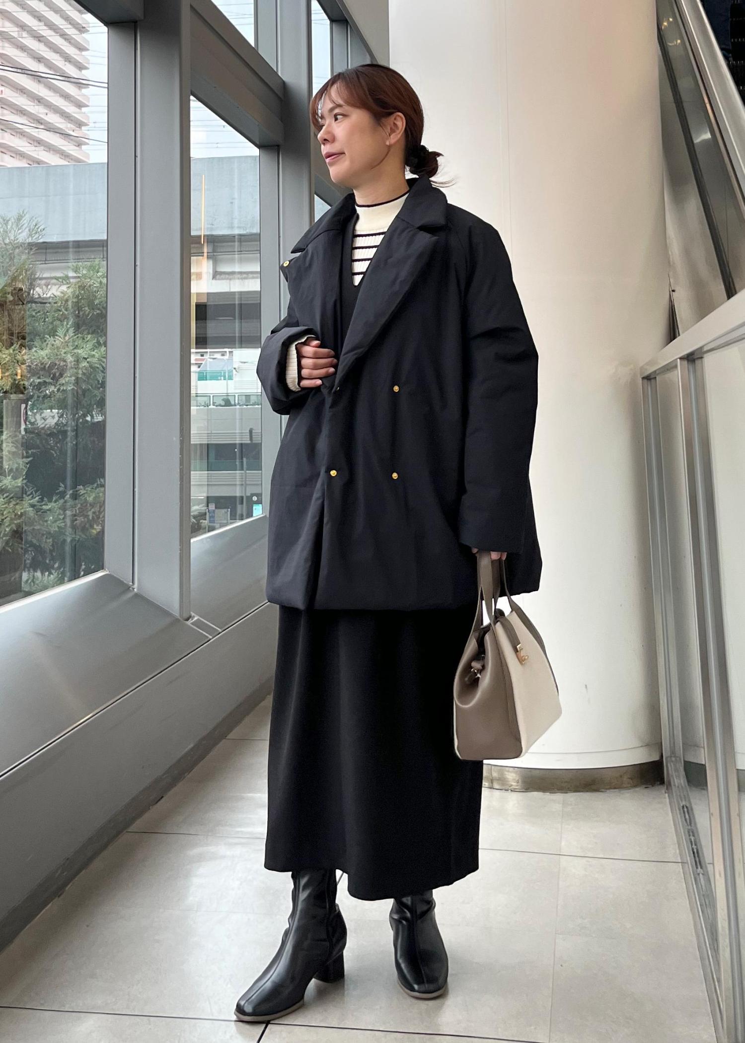 お尻がすっぽり隠れる着丈のコクーンシルエット。ワンピース合わせでもバランス良く着れました。 -