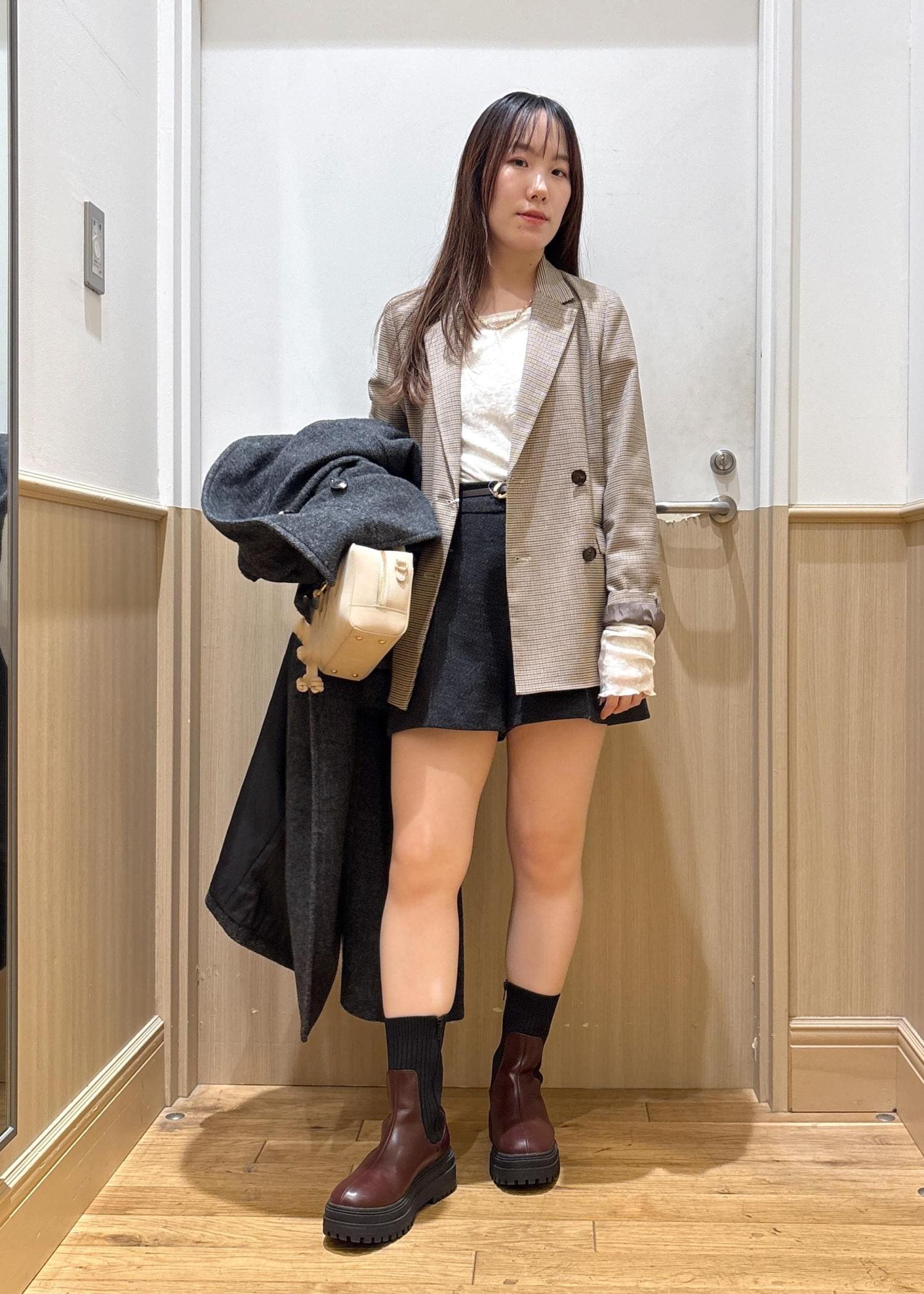 Sサイズでも中にニットを着込めるくらいゆとりがあります。袖とベルトを絞ればすっきり着用できます!