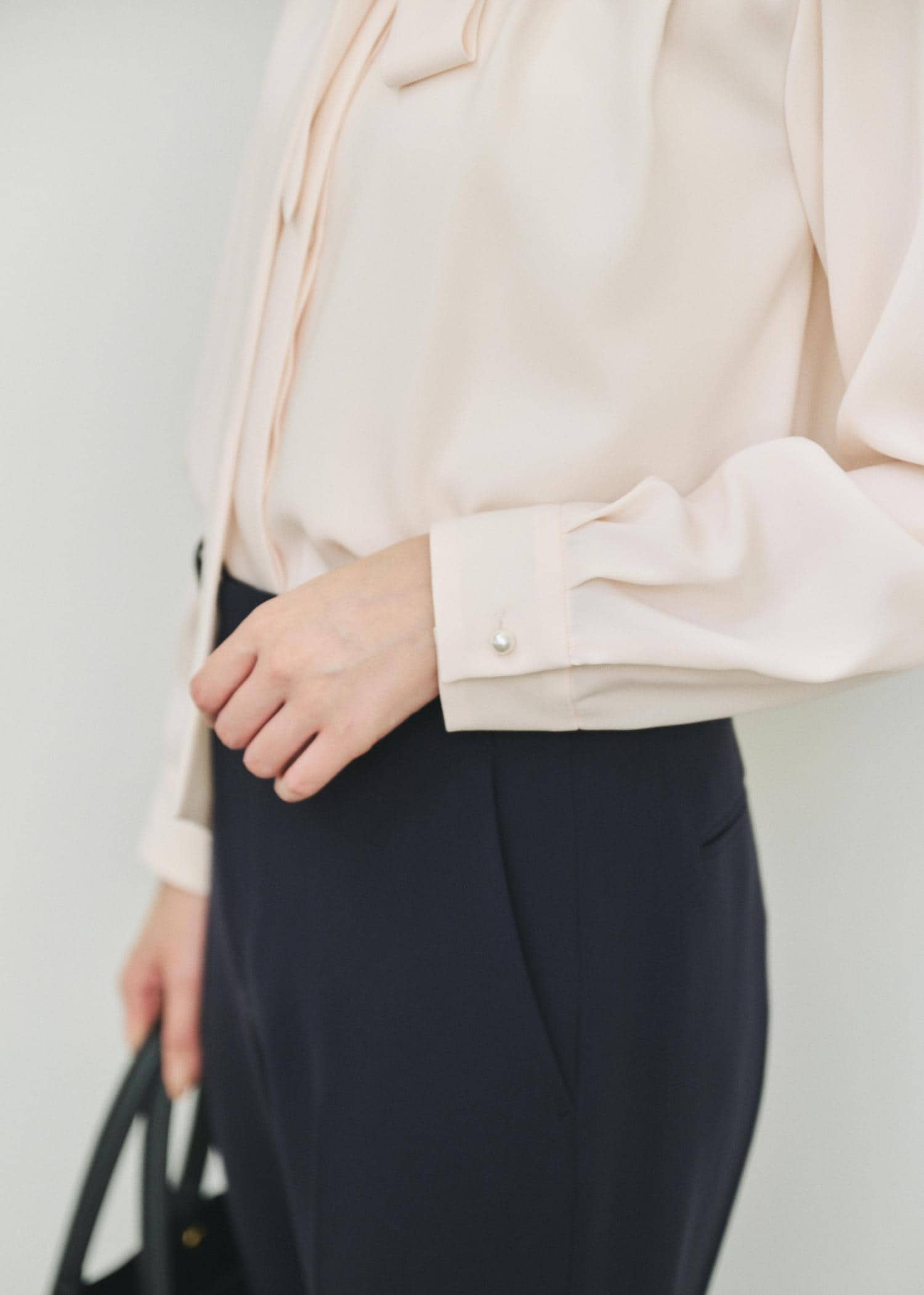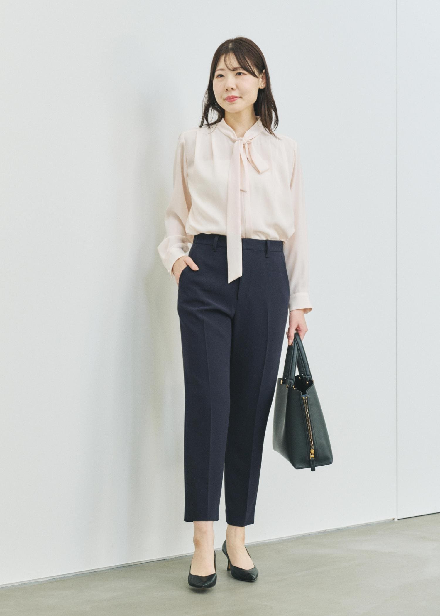 柔らかくしなやかなボウタイブラウスと綺麗なラインを作ってくれるテーパードパンツを合わせたスタイリングです。