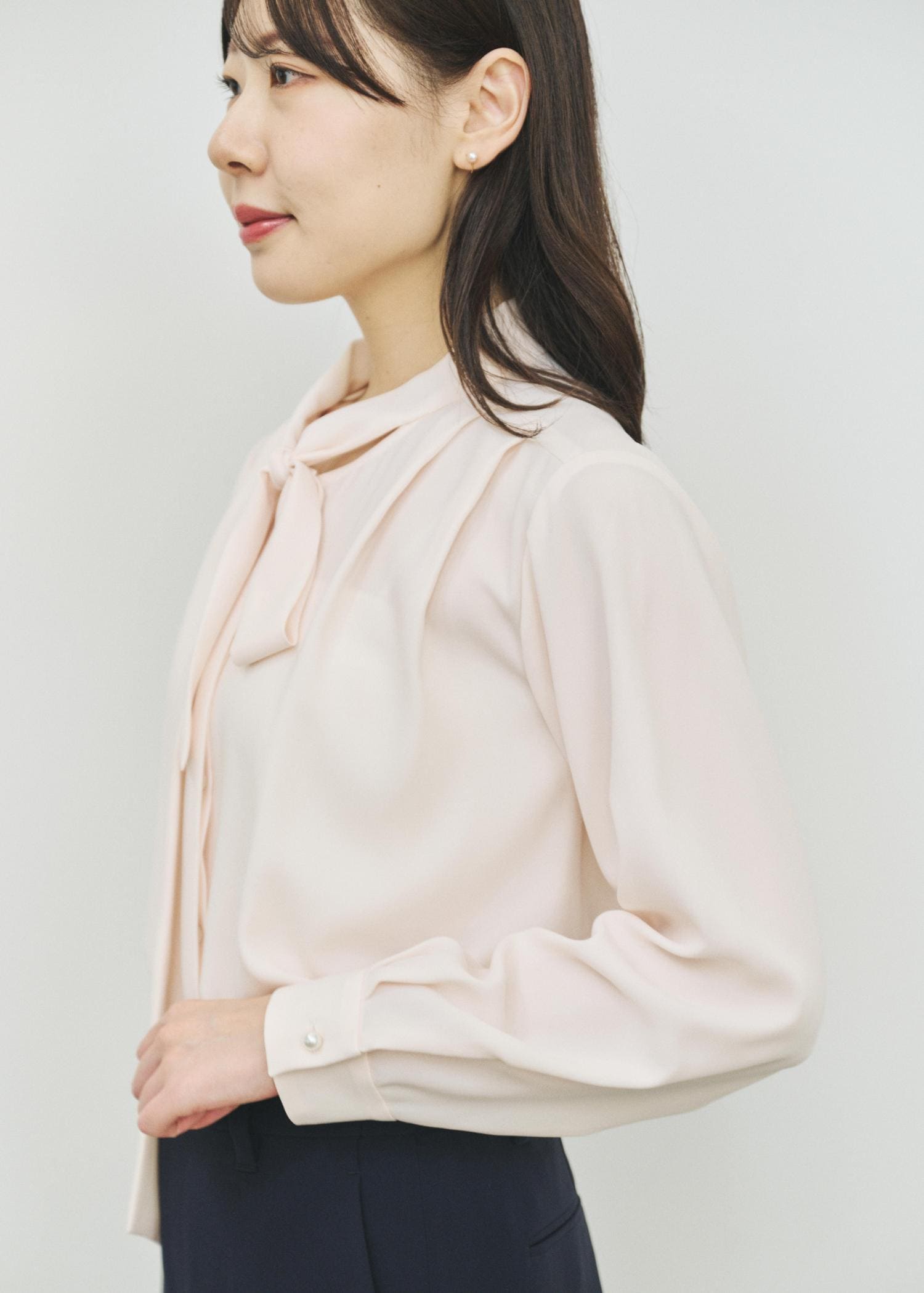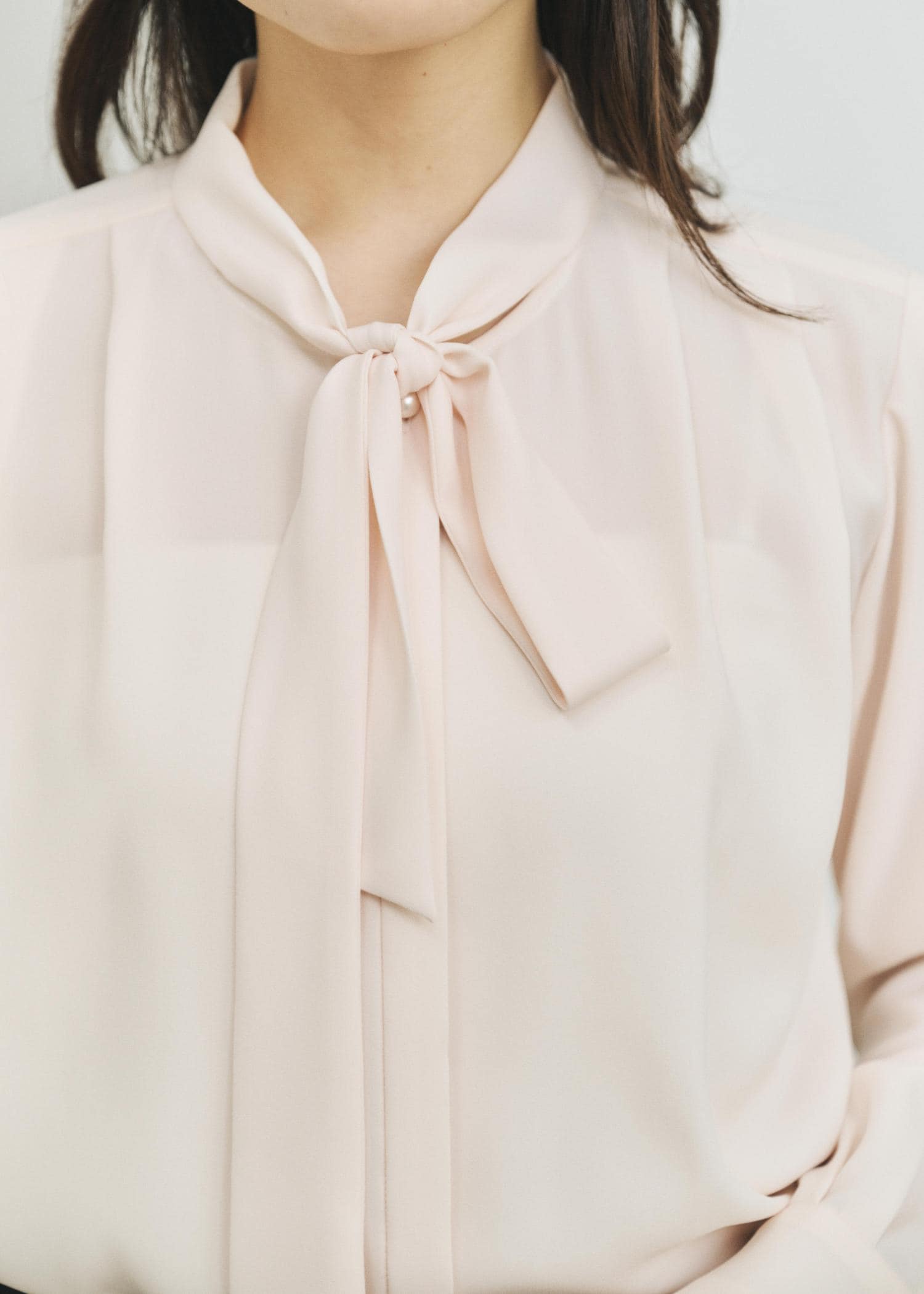 肌のトーンを明るく見せてくれるピンク味のあるベージュカラーのブラウスは、パールボタンがさり気なく装飾されており、女性らしいフェミニンな印象をプラスしてくれます。