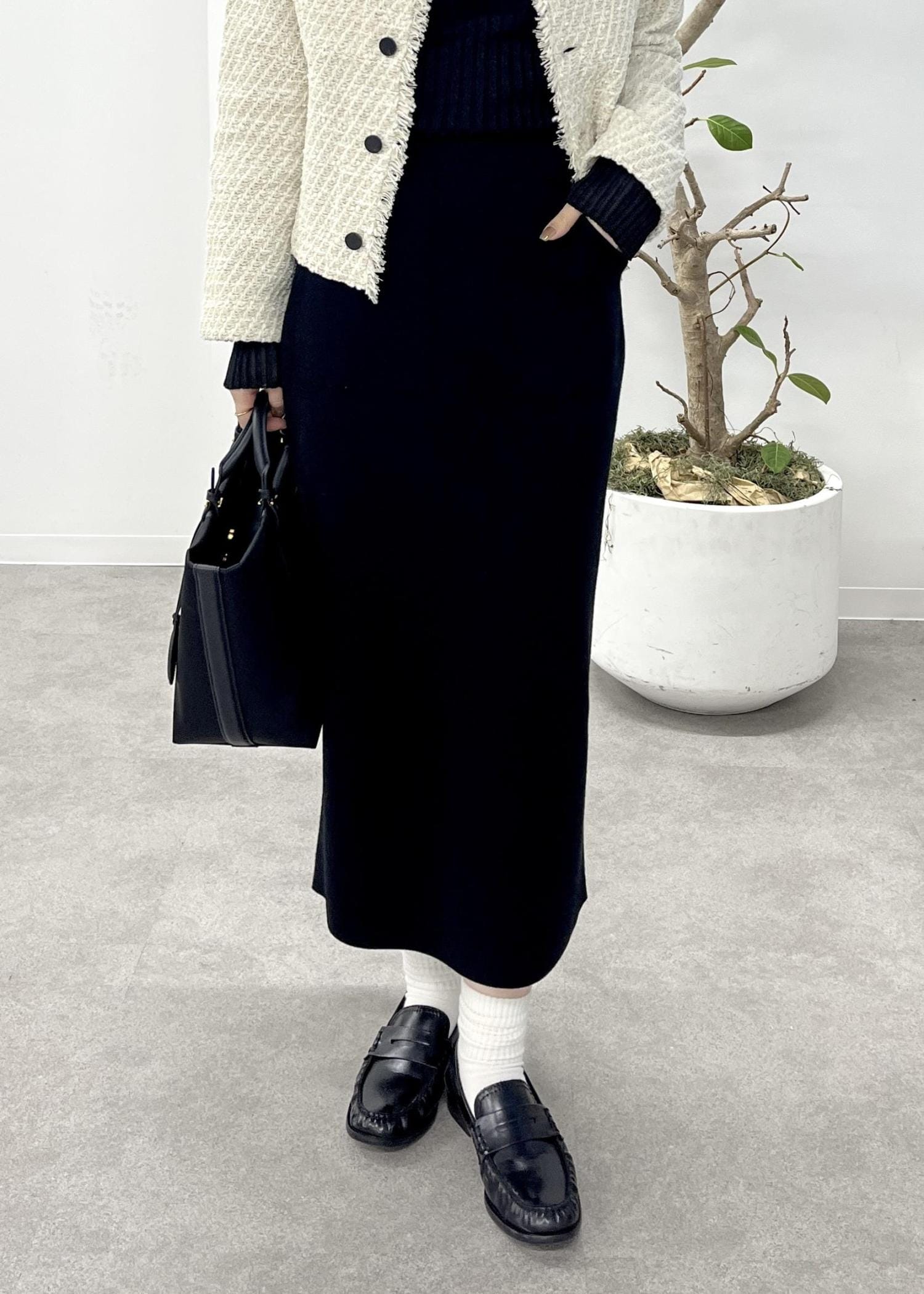 着丈はふくらはぎ下くらい。ニット素材なのでヒップラインは少し拾います。