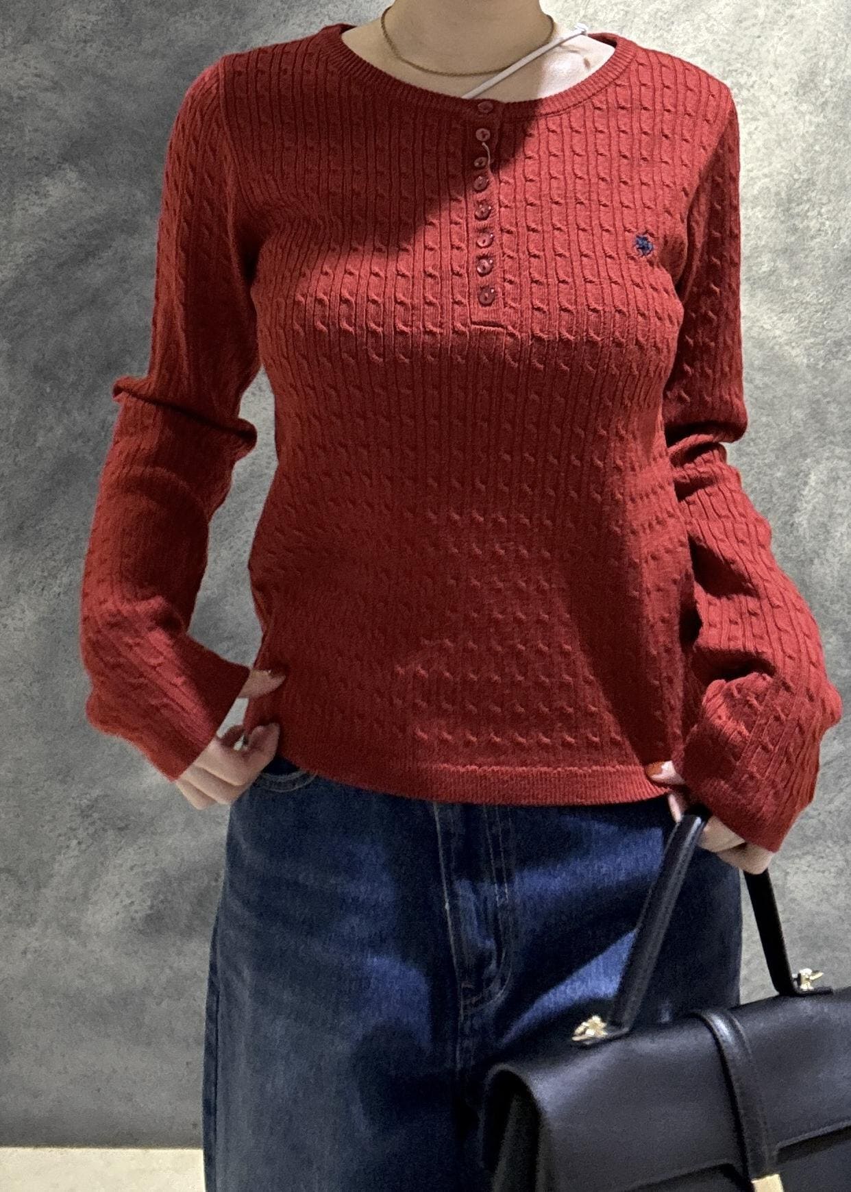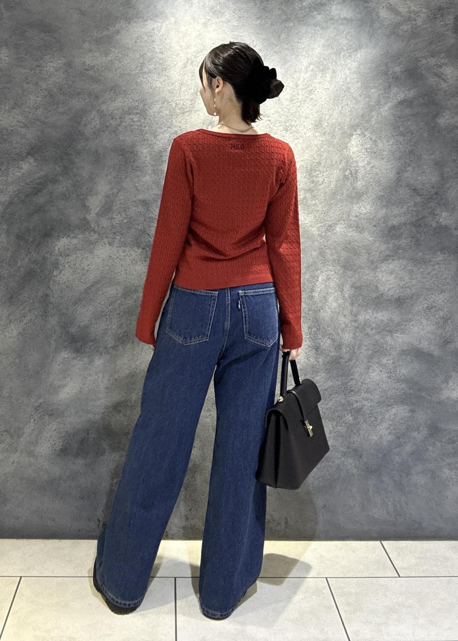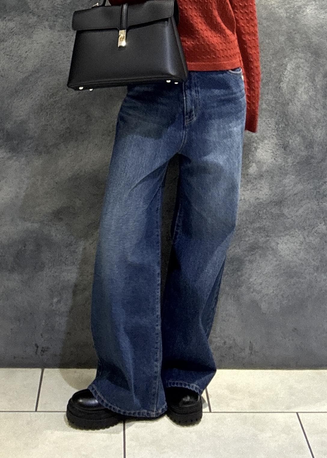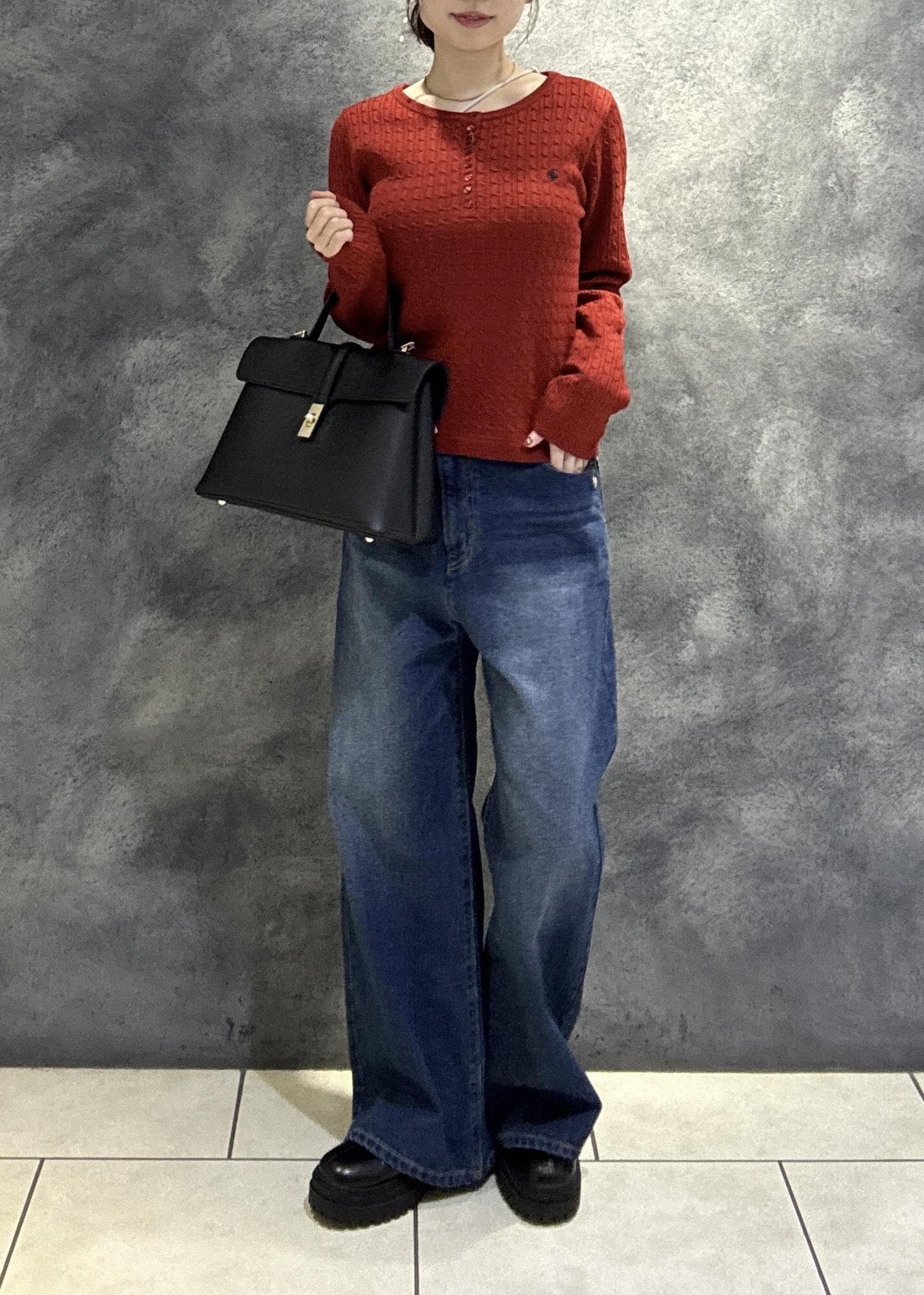 深い赤に濃いめのデニムが秋冬らしさを出してくれます!