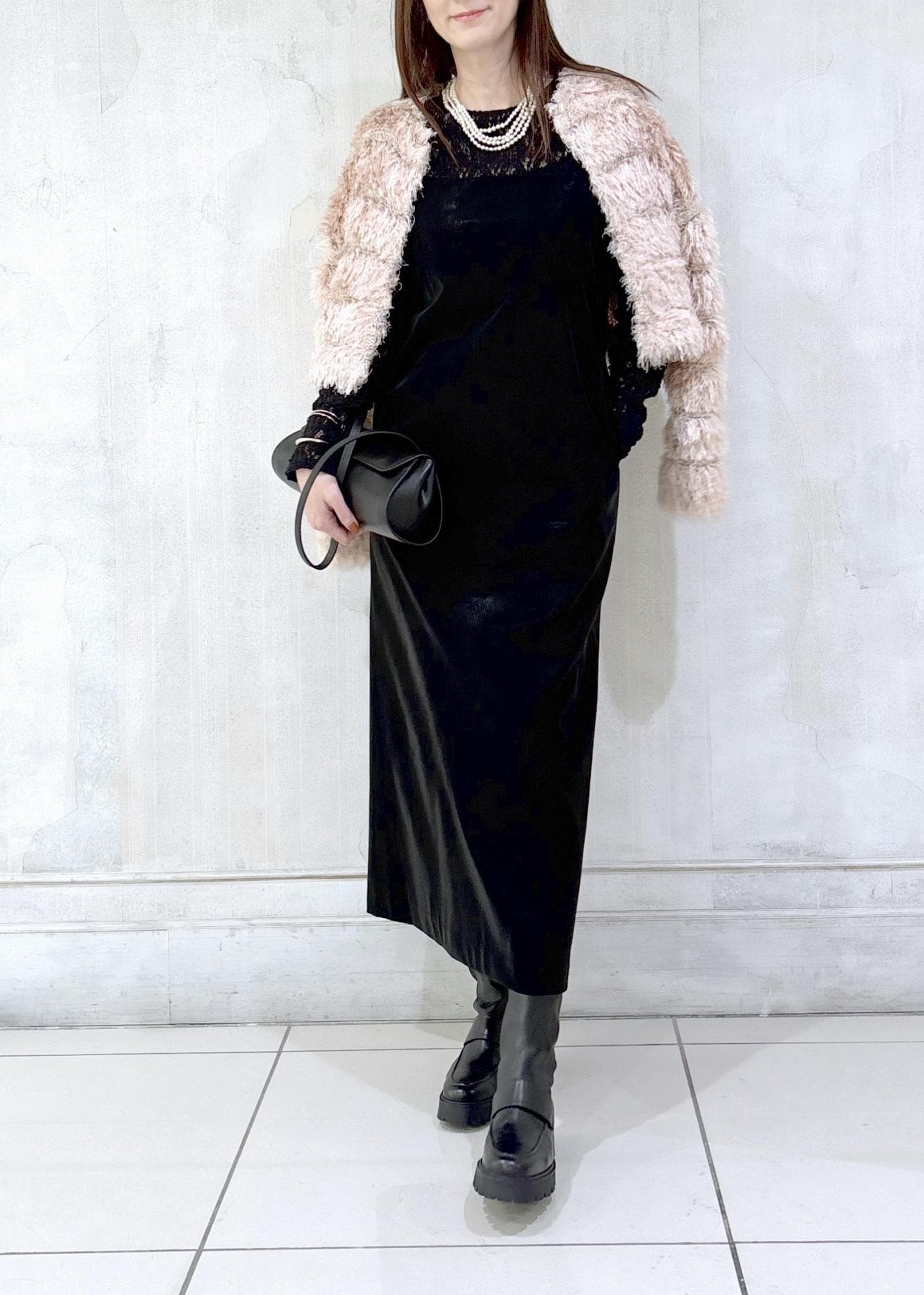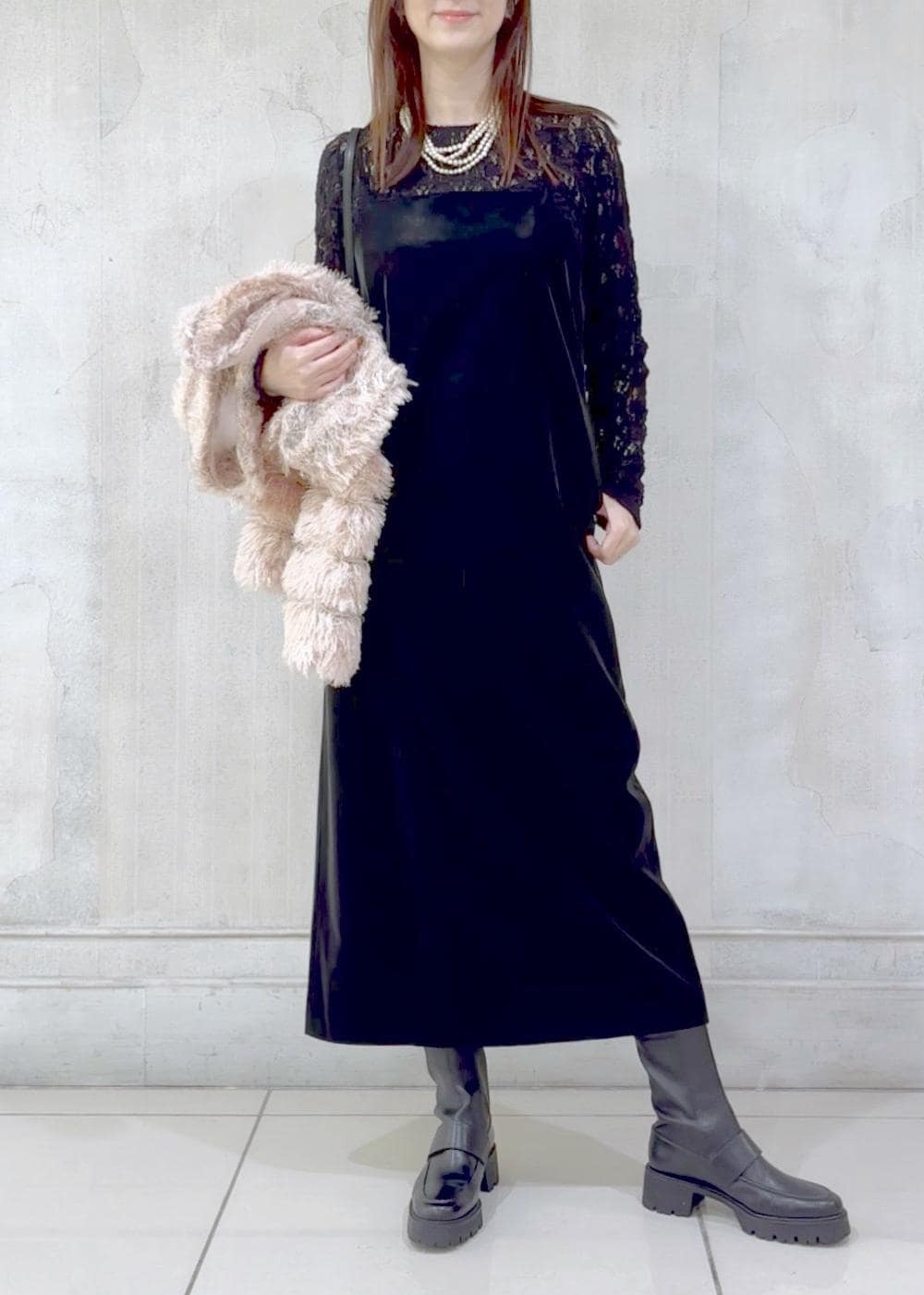 SALON adam et ropéパールレザーライクキャミワンピースブラック / F¥29,700レビュー程よい光沢感と上品な素材感が