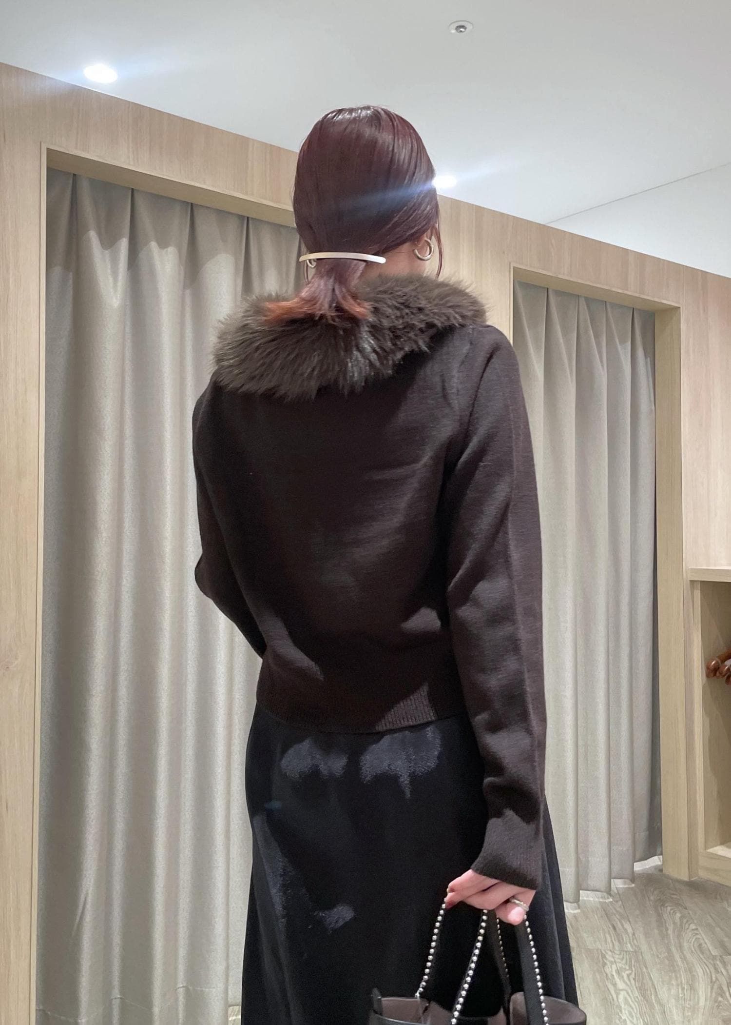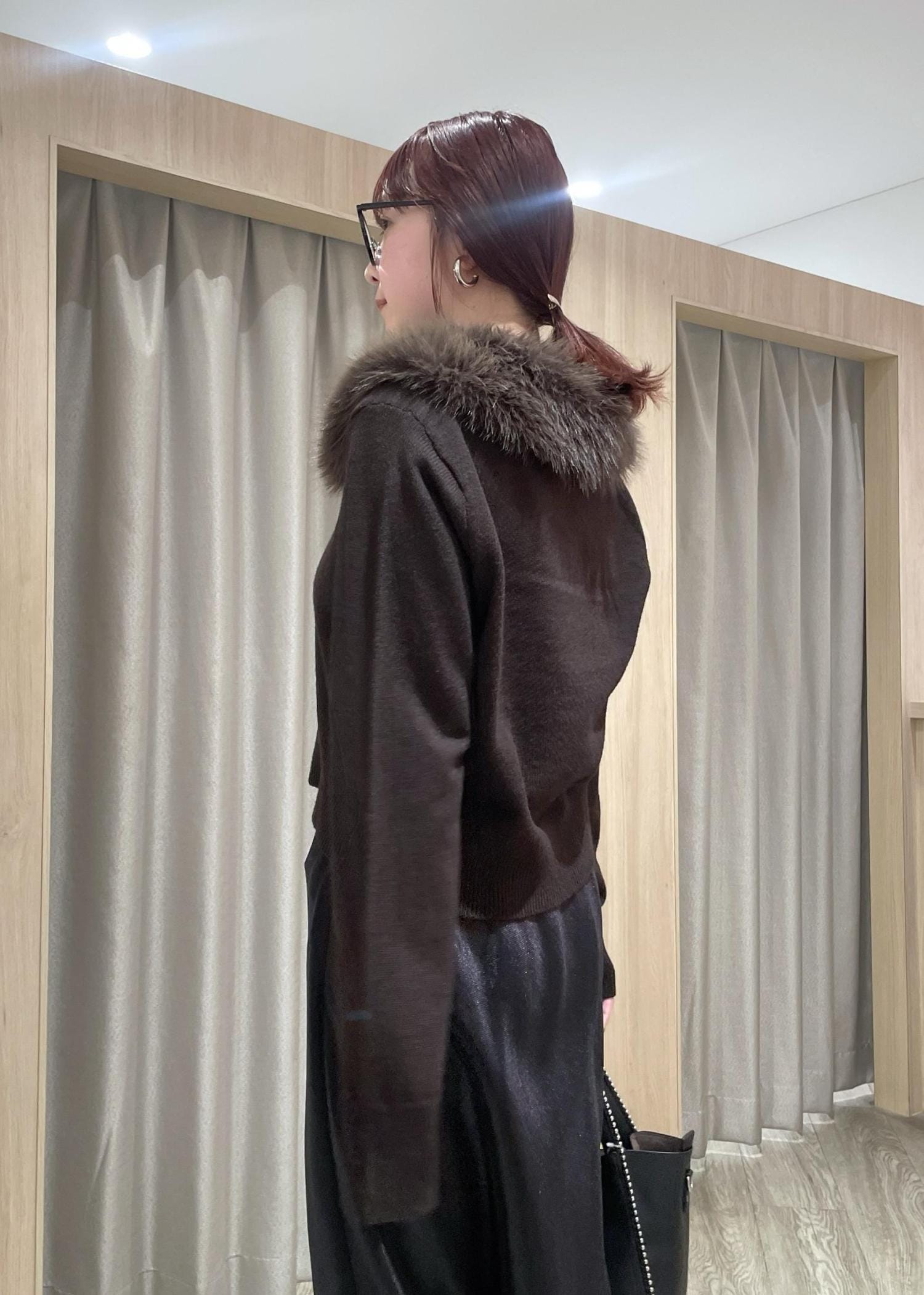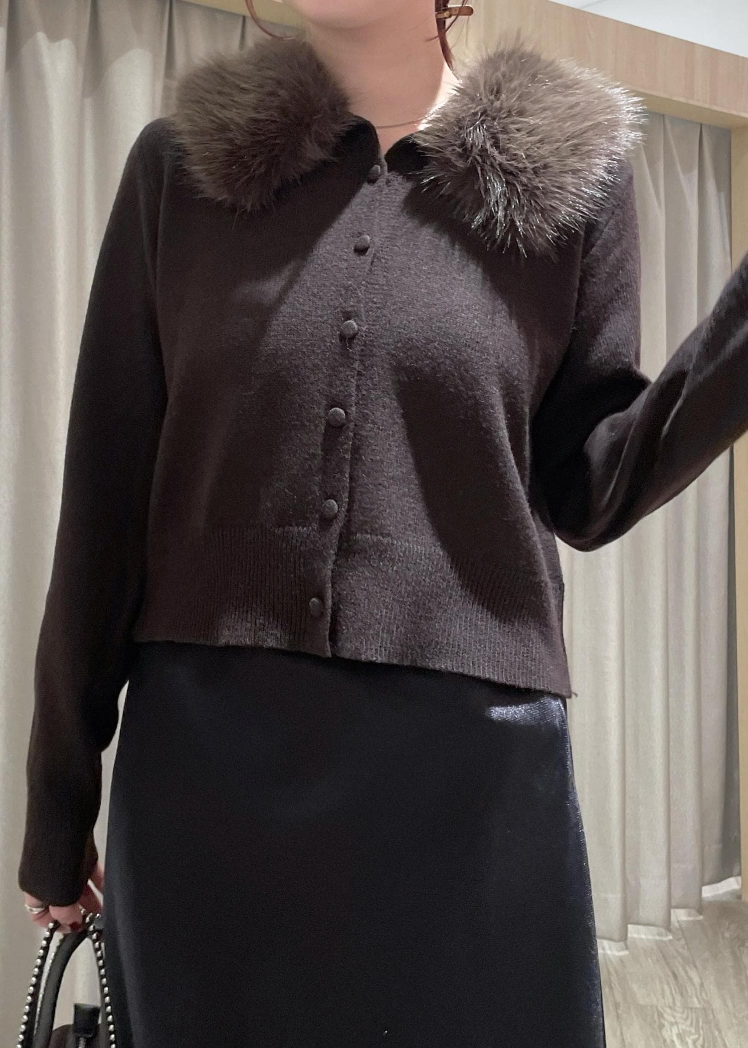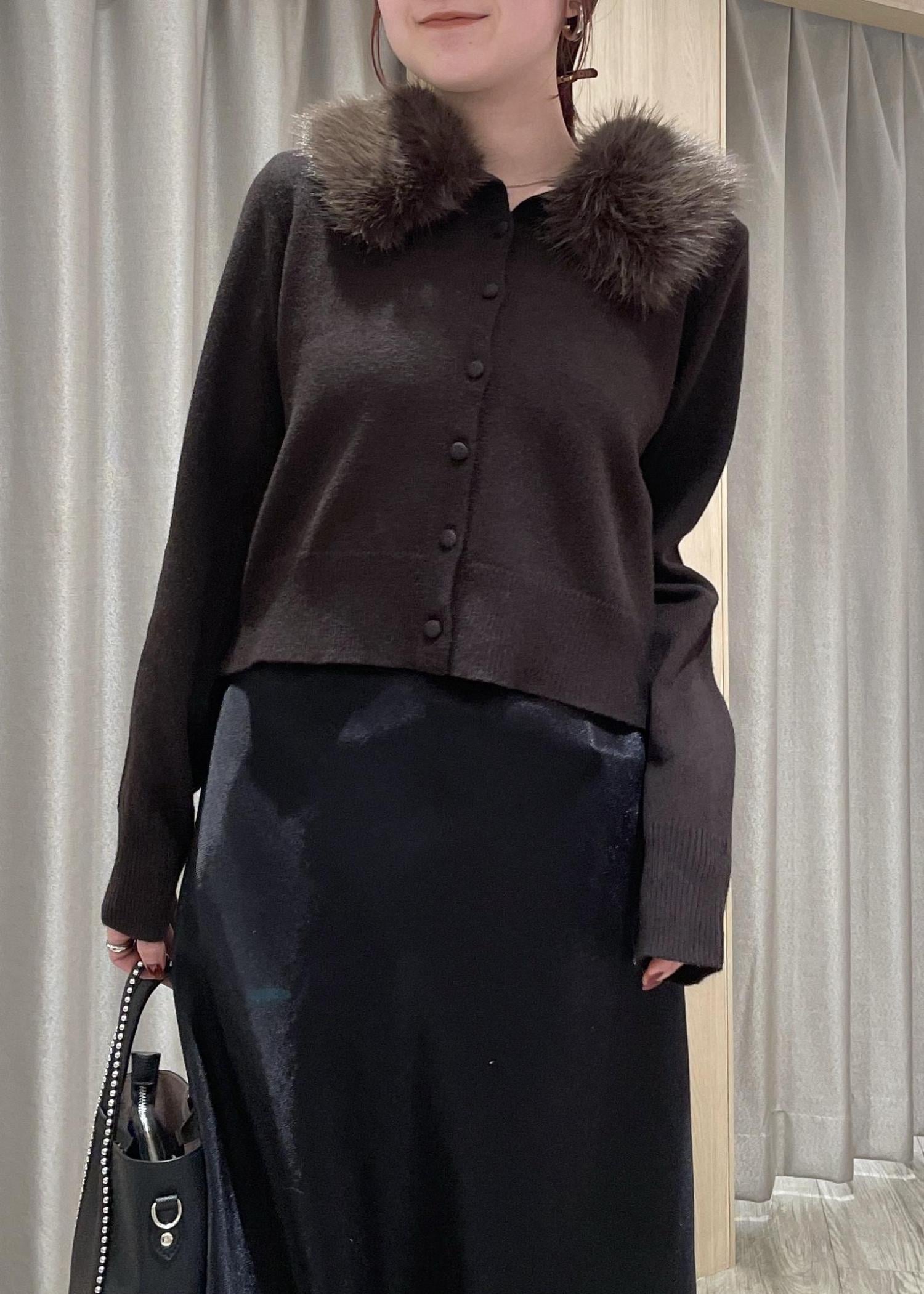 VIS衿ファー取り外しカーディガンダークブラウン / F¥6,589レビュー着回し力抜群なニット♡コンパクトなサイズ感でボトムは選ばず合わせやすいです。衿ファー無しだとシンプルなポロニットに、お仕事などのきちんとした場面にも◎ファーは程よいボリューム感で詰まりすぎてないので顔周りもスッキリと。マフラー代わりになる暖かさもあります!