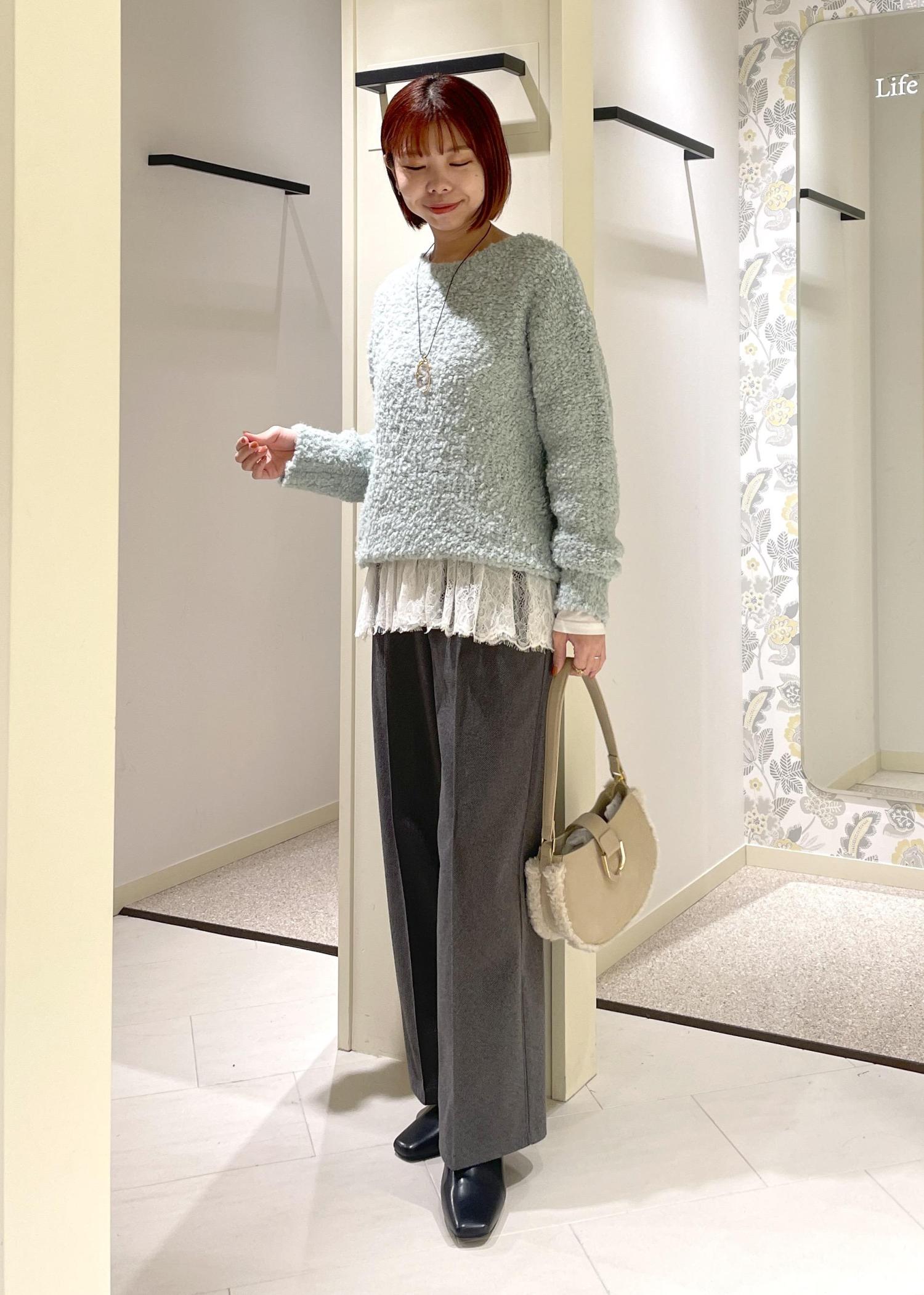 柔らかなグリーンカラーのブーグレーニットにレースキャミソールをレイヤードしたトレンド感のあるレイヤードコーデ。