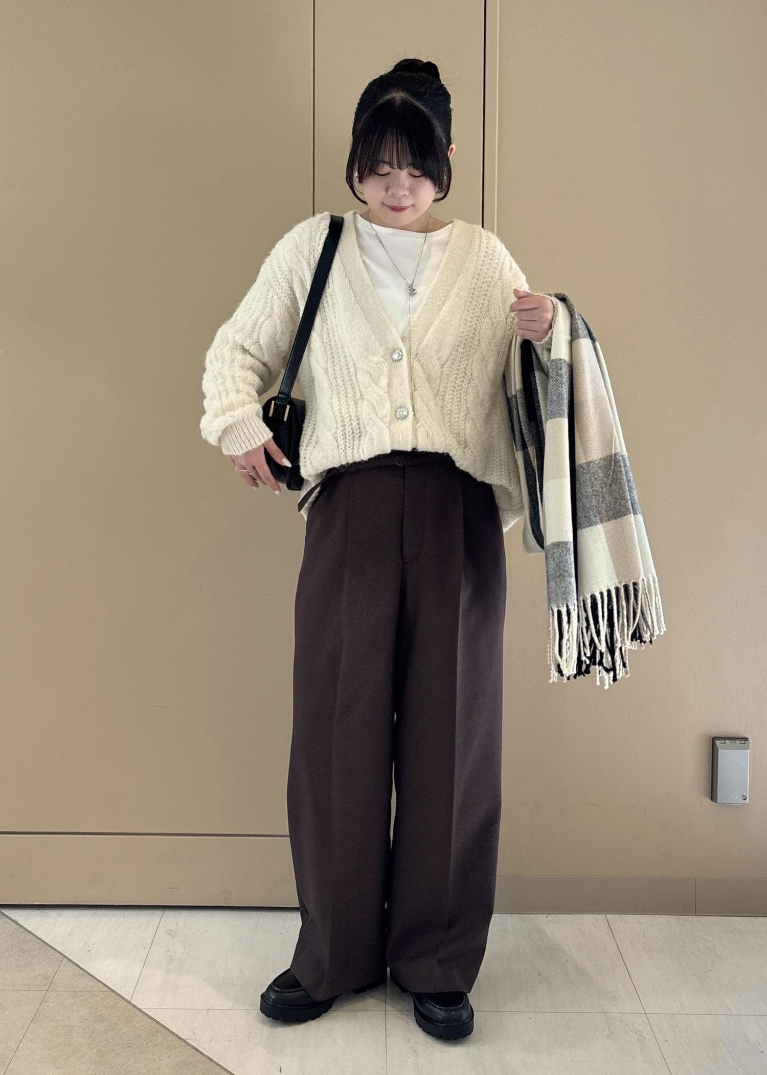 シャギーニット×フレアスカートのフェミニンなアイテムをモノトーンでまとめて大人かわいいコーディネートに。