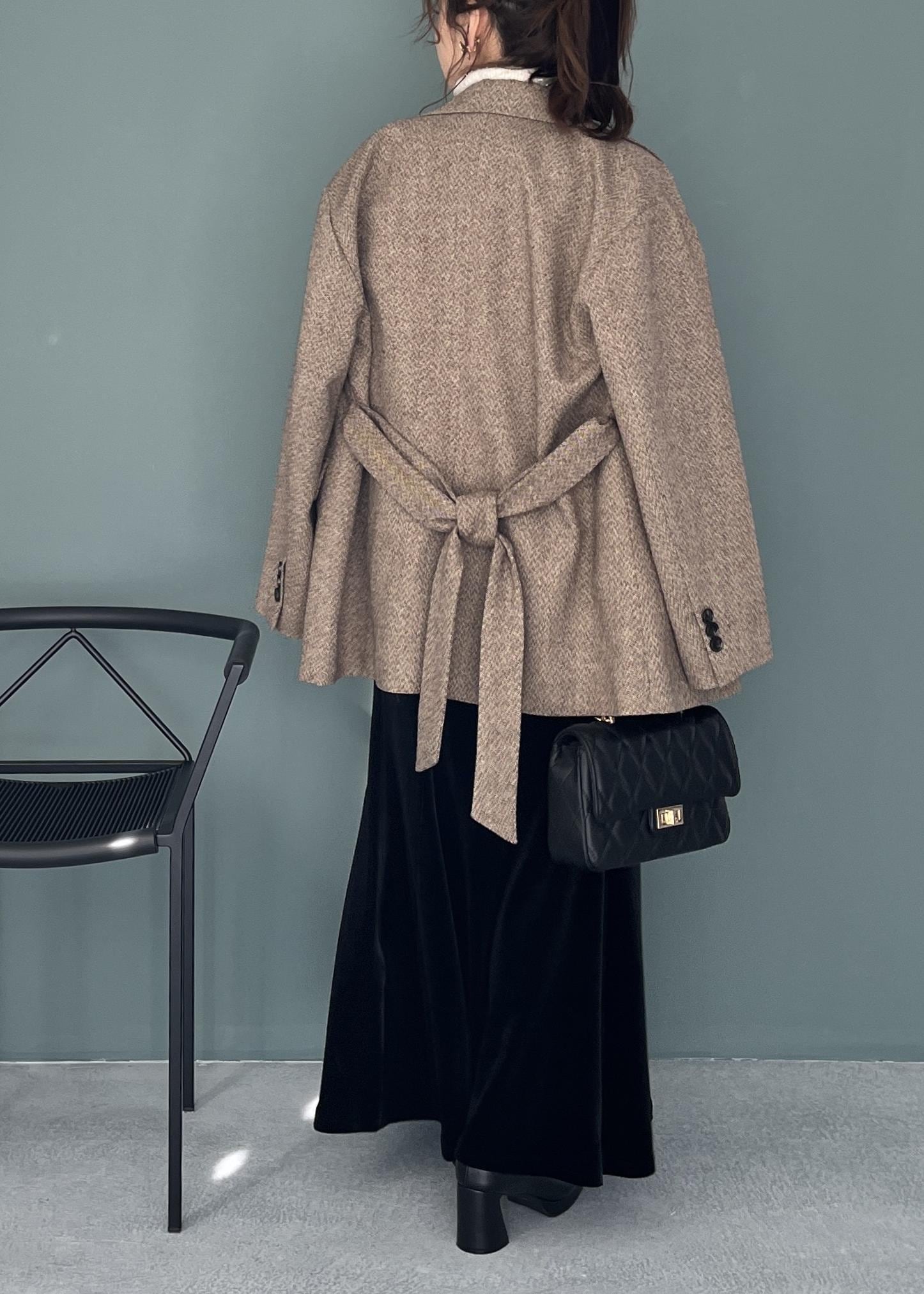 VISヘリンボーンツイードベルテッドジャケット/セットアップ対応ベージュ系 / F¥9,999レビュー152cmでFサイズ着用し、着丈はお尻がすっぽり隠れる長め丈。オーバーサイズなので肩幅はやや広めで落ちる感じ。程よく肉厚な素材感なので、形がとってもキレイ。張り感とまでではないけれど、オチ感とも違って上品な大人の見え方なジャケットです。小柄さんは後ろに抜いて着るのがお勧めです。