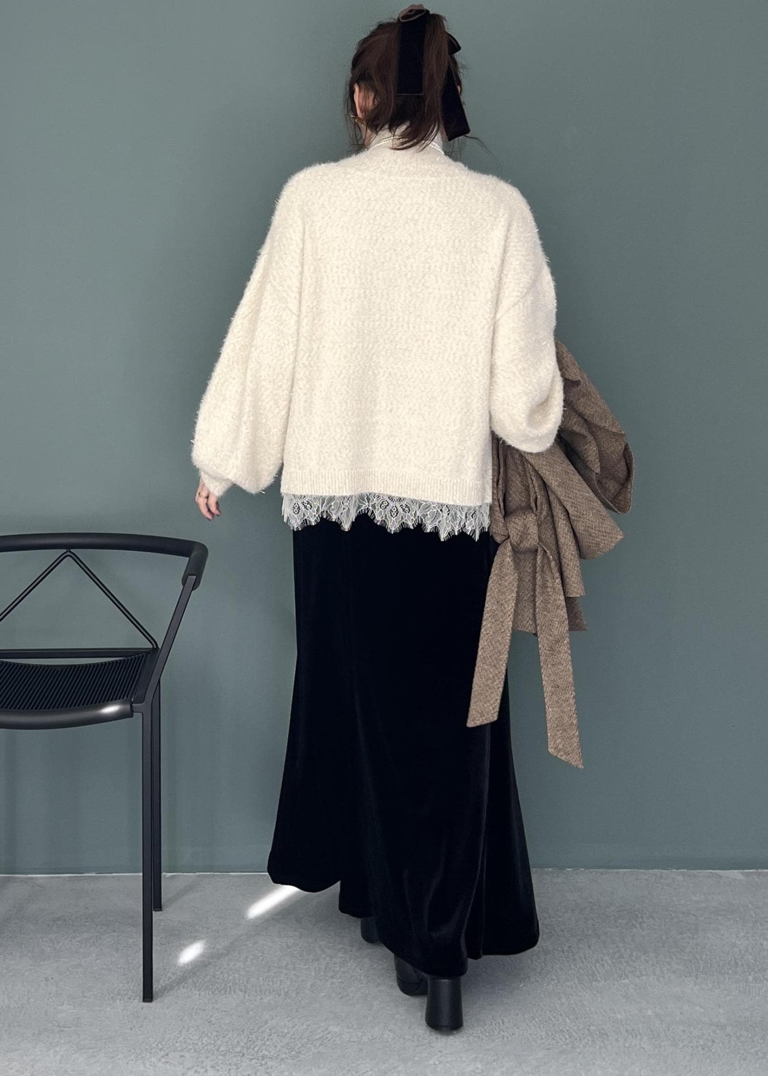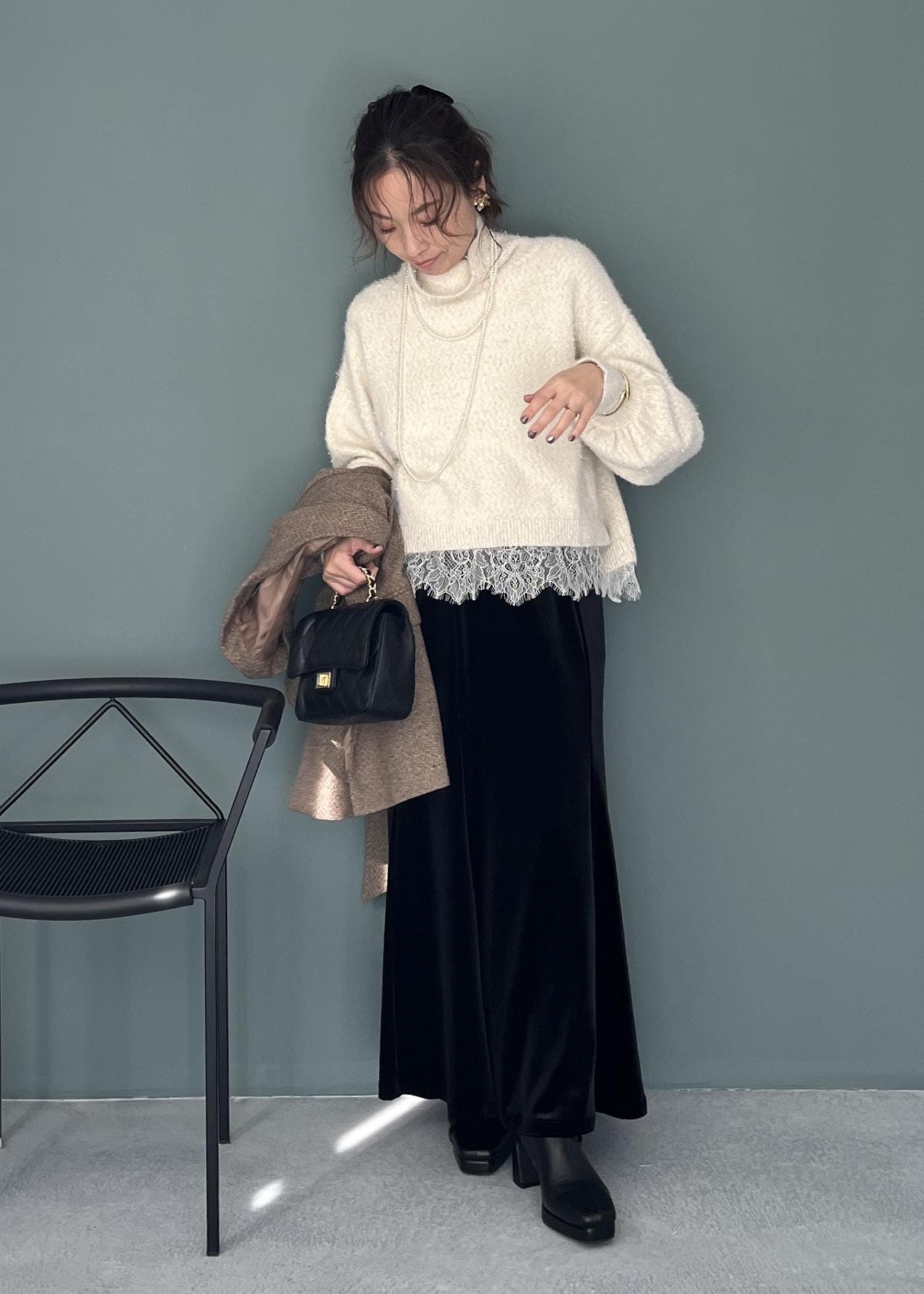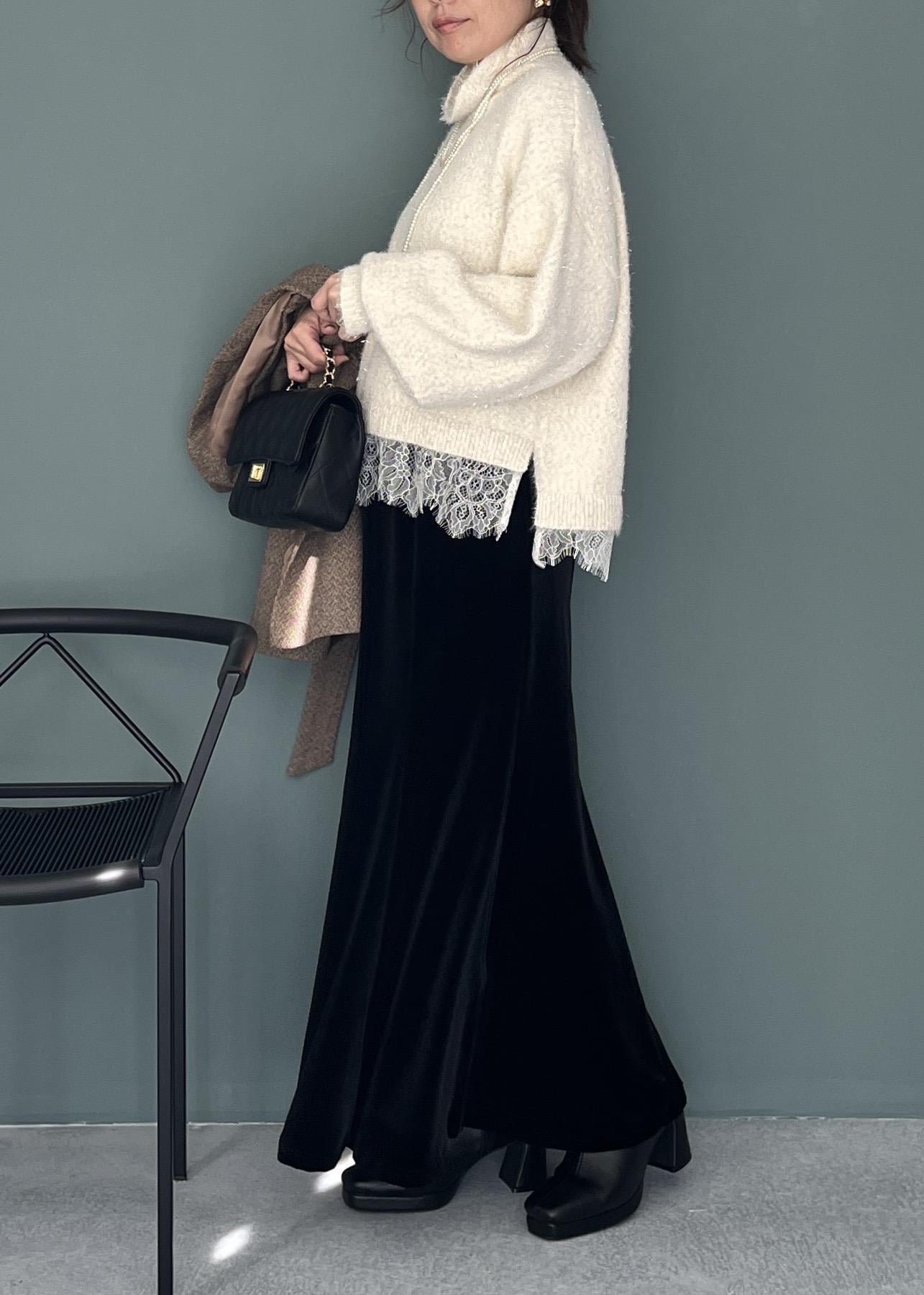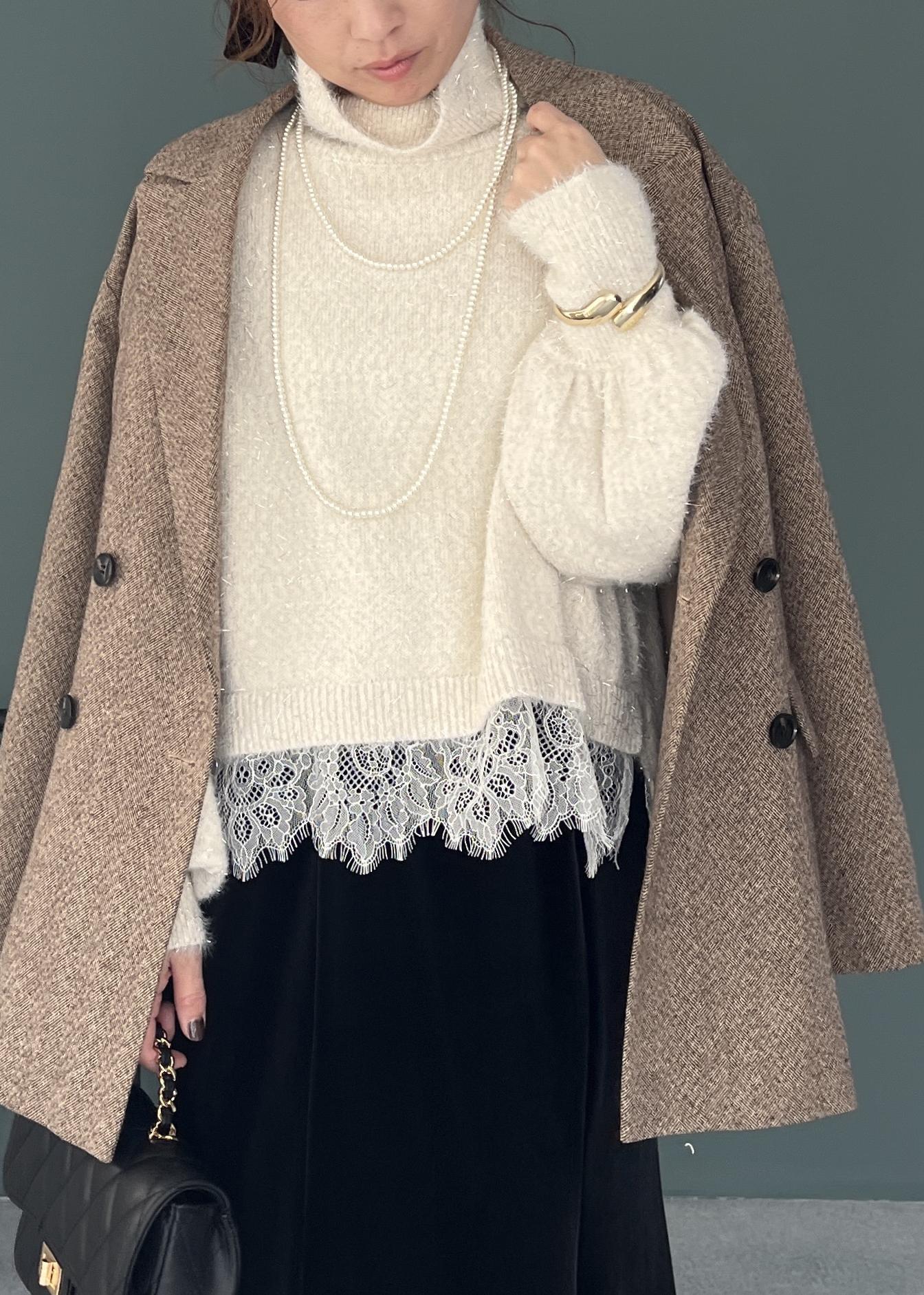 ふわっと柔らかいタートルニットにレースをのぞかせて、ほんのり華やかさをプラス。