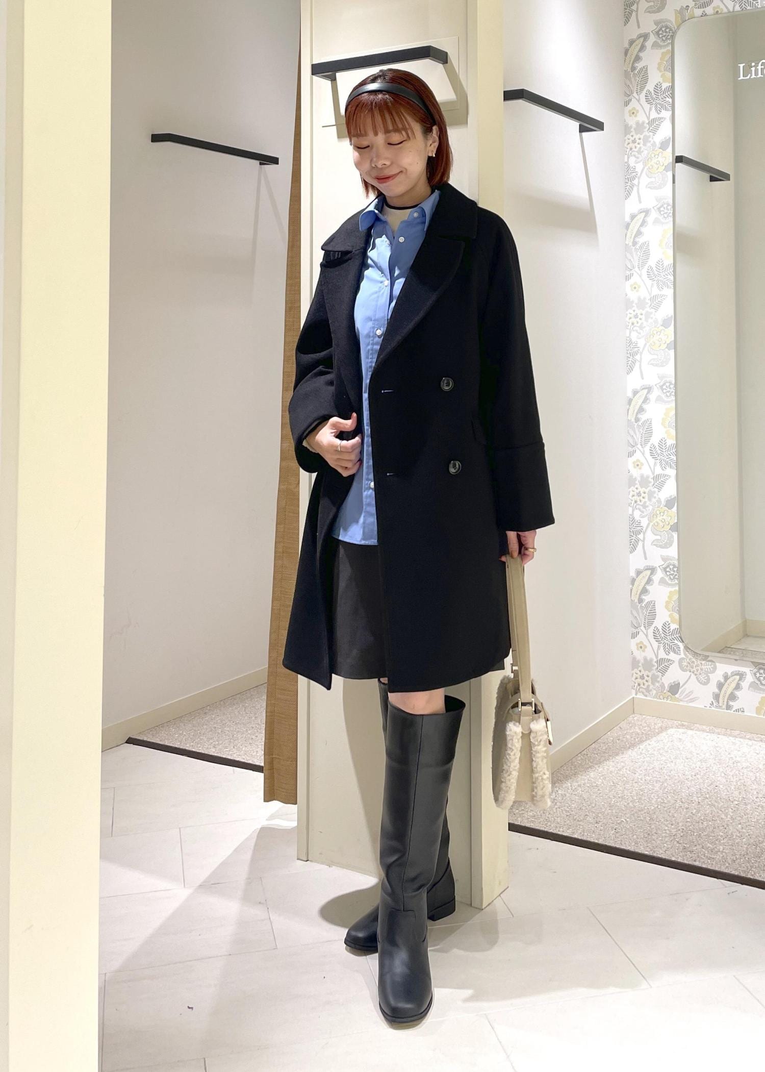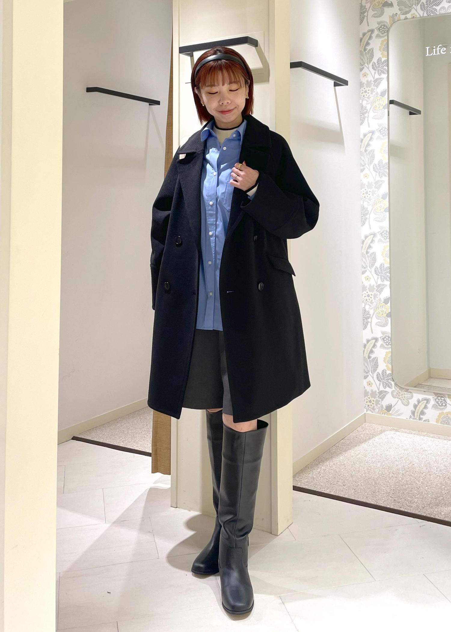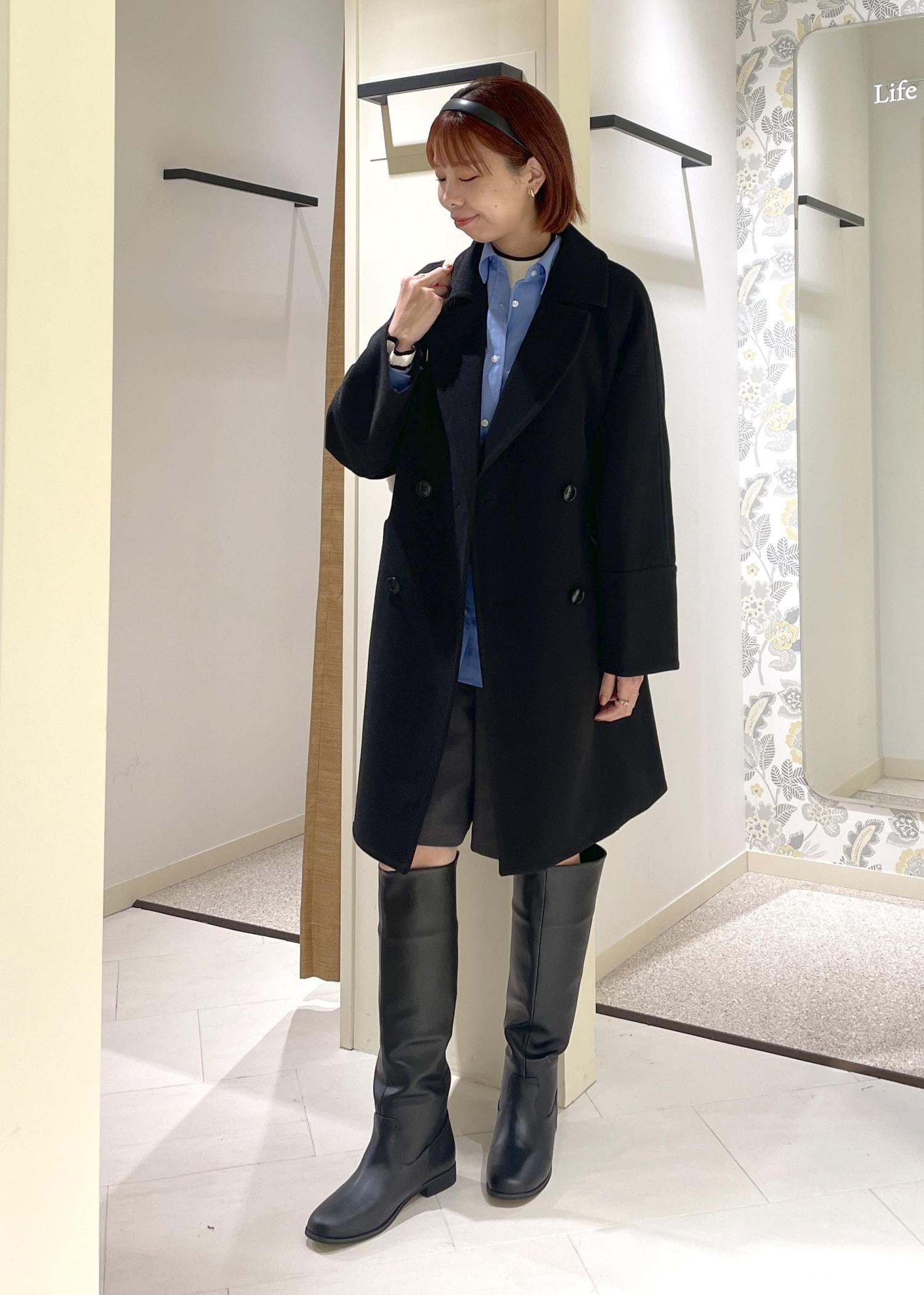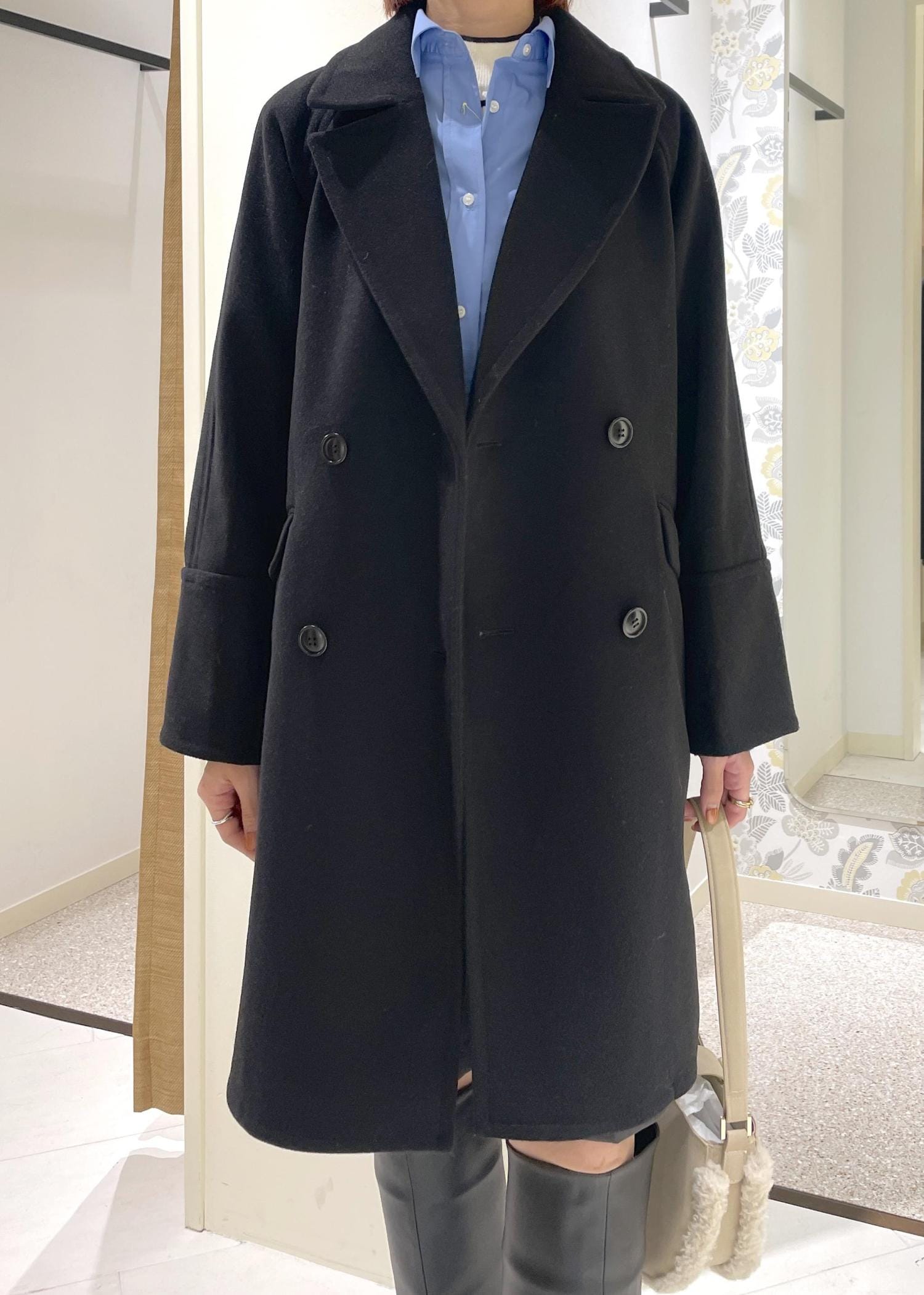 ブラックのオーバーPコートに、ブルーシャツを合わせたトレンド感のあるコーディネート