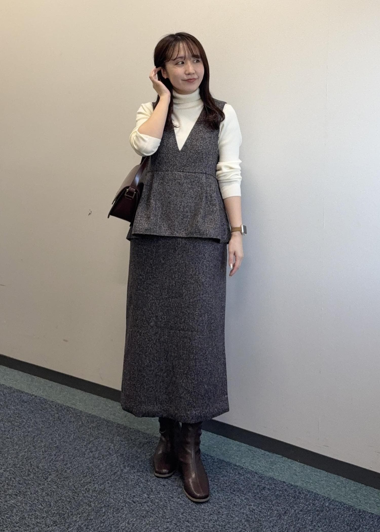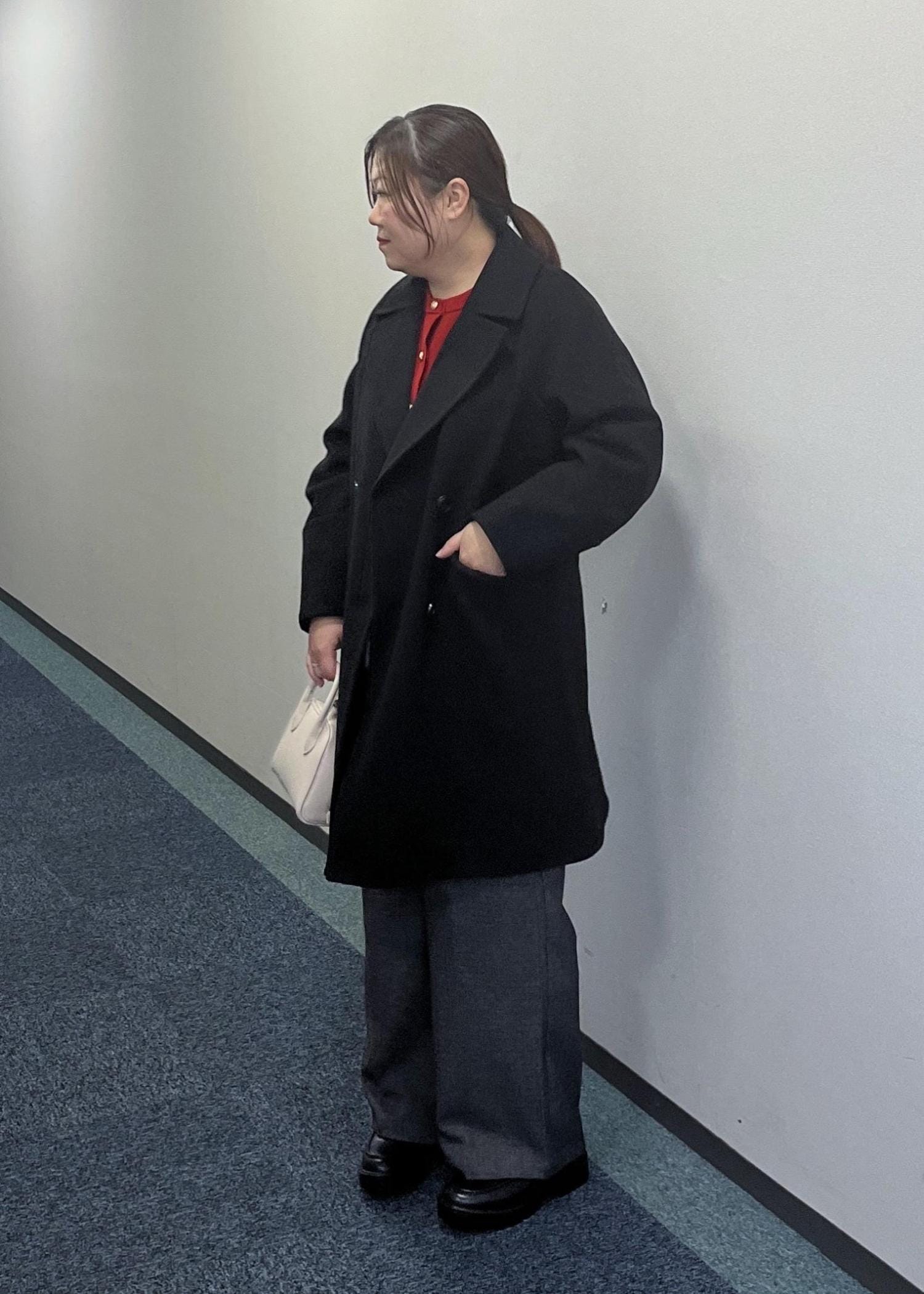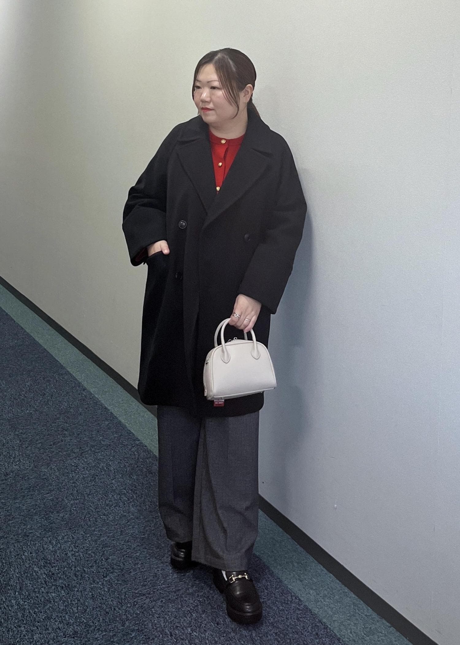 コートを脱ぐとレッドのカーディガンで華やかなのでクリスマスやお正月など冬のお出かけにもピッタリです☺︎