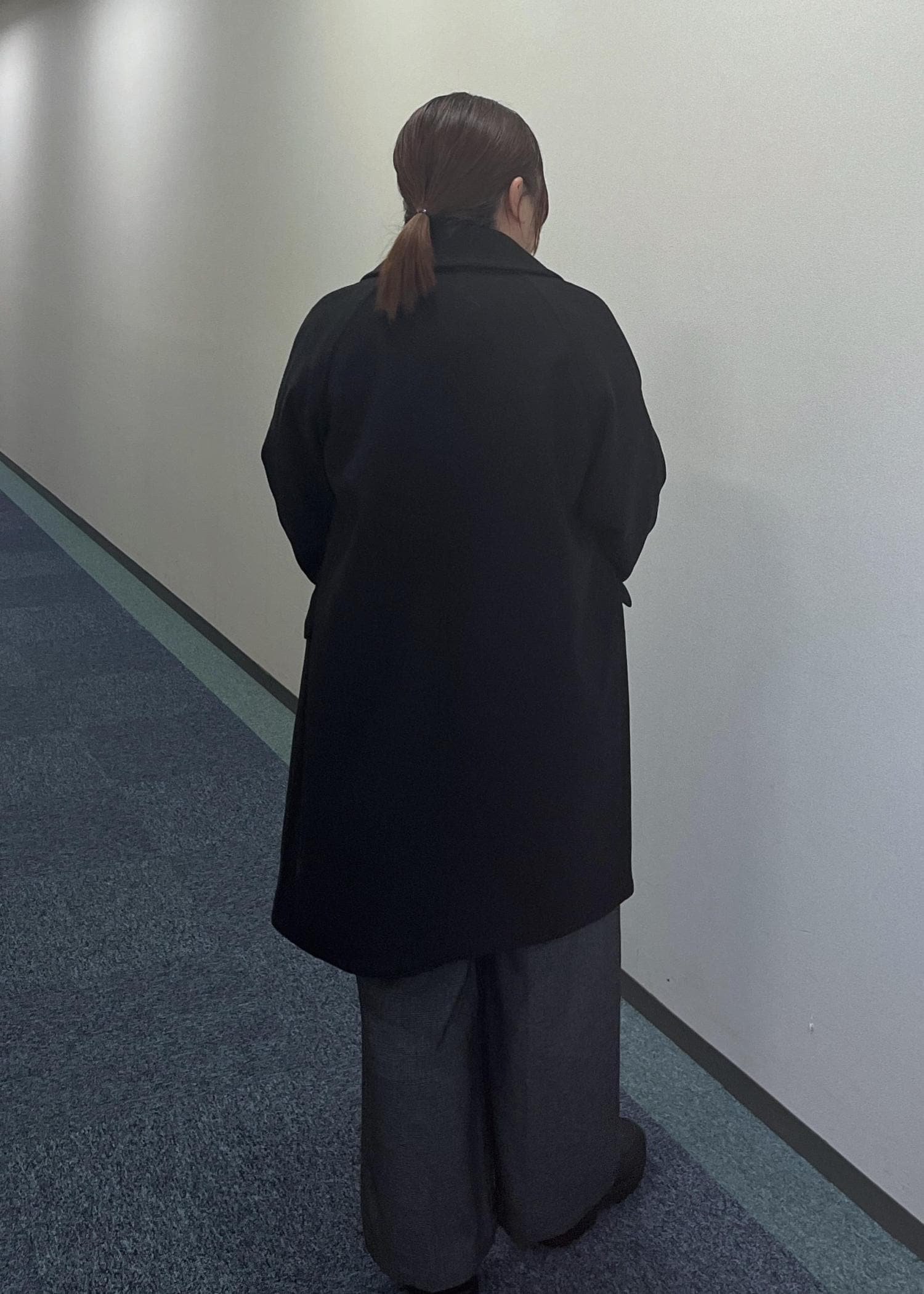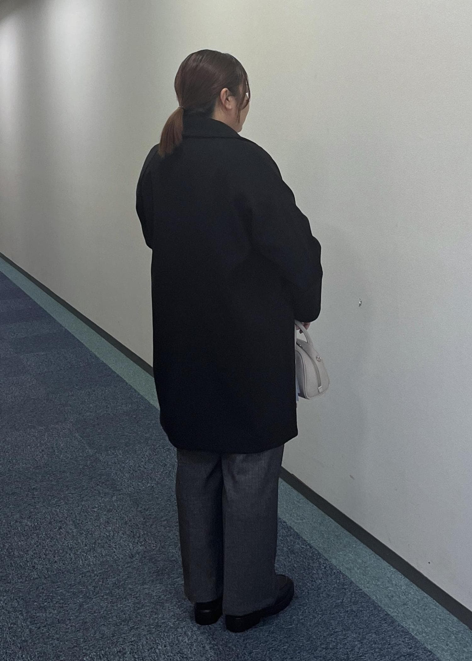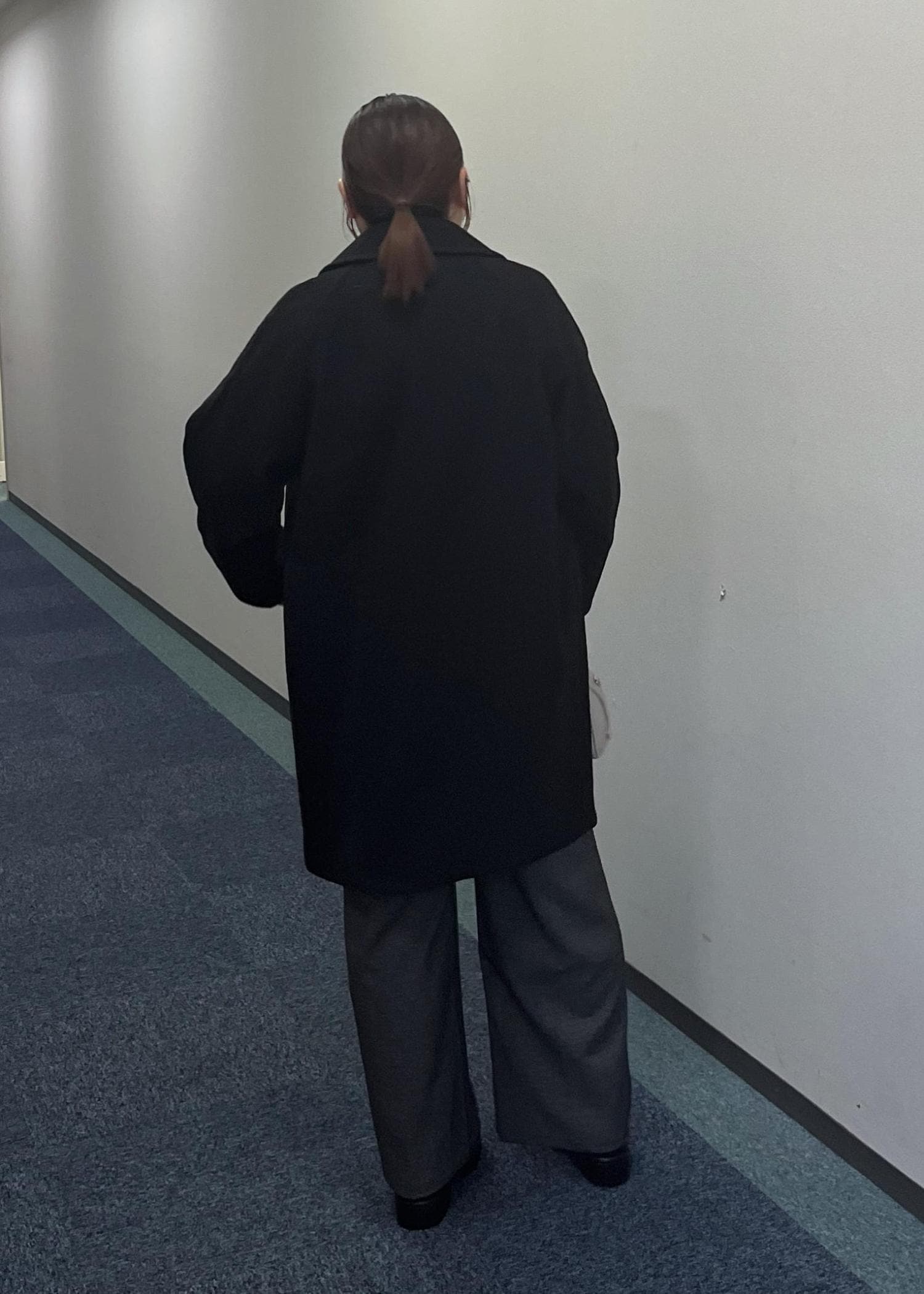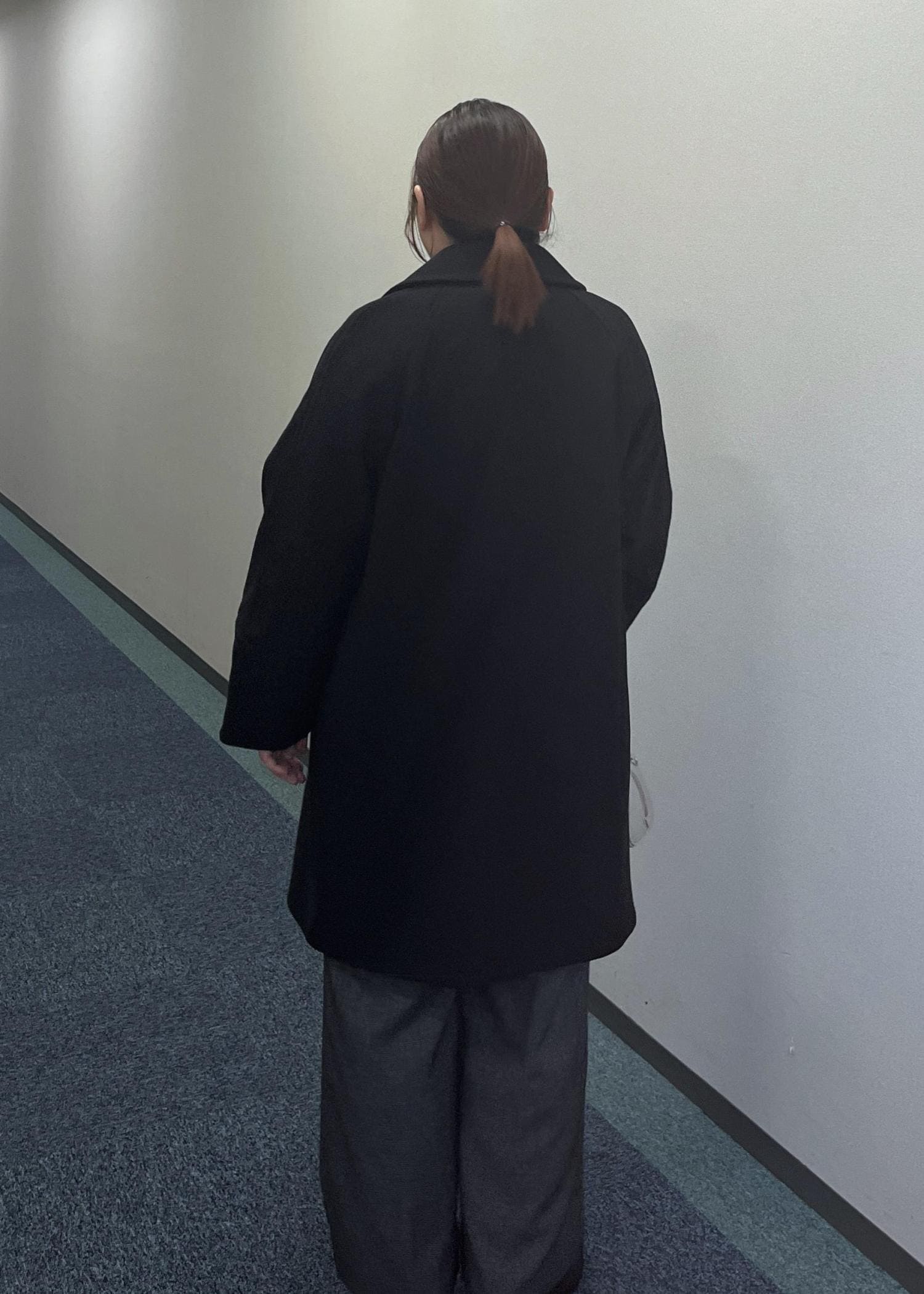ブラックのオーバーPコートにチェック柄パンツを合わせた冬のお出かけコーデです。