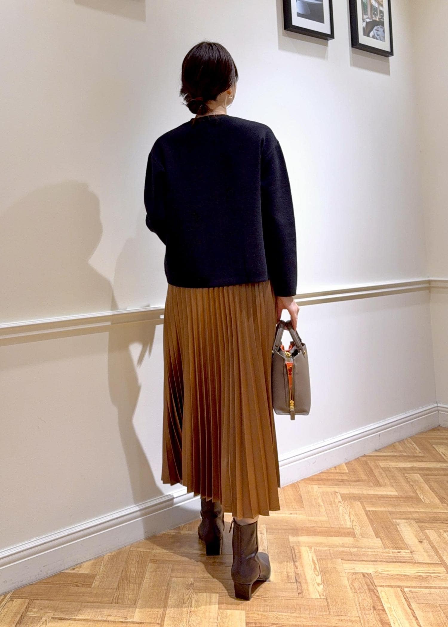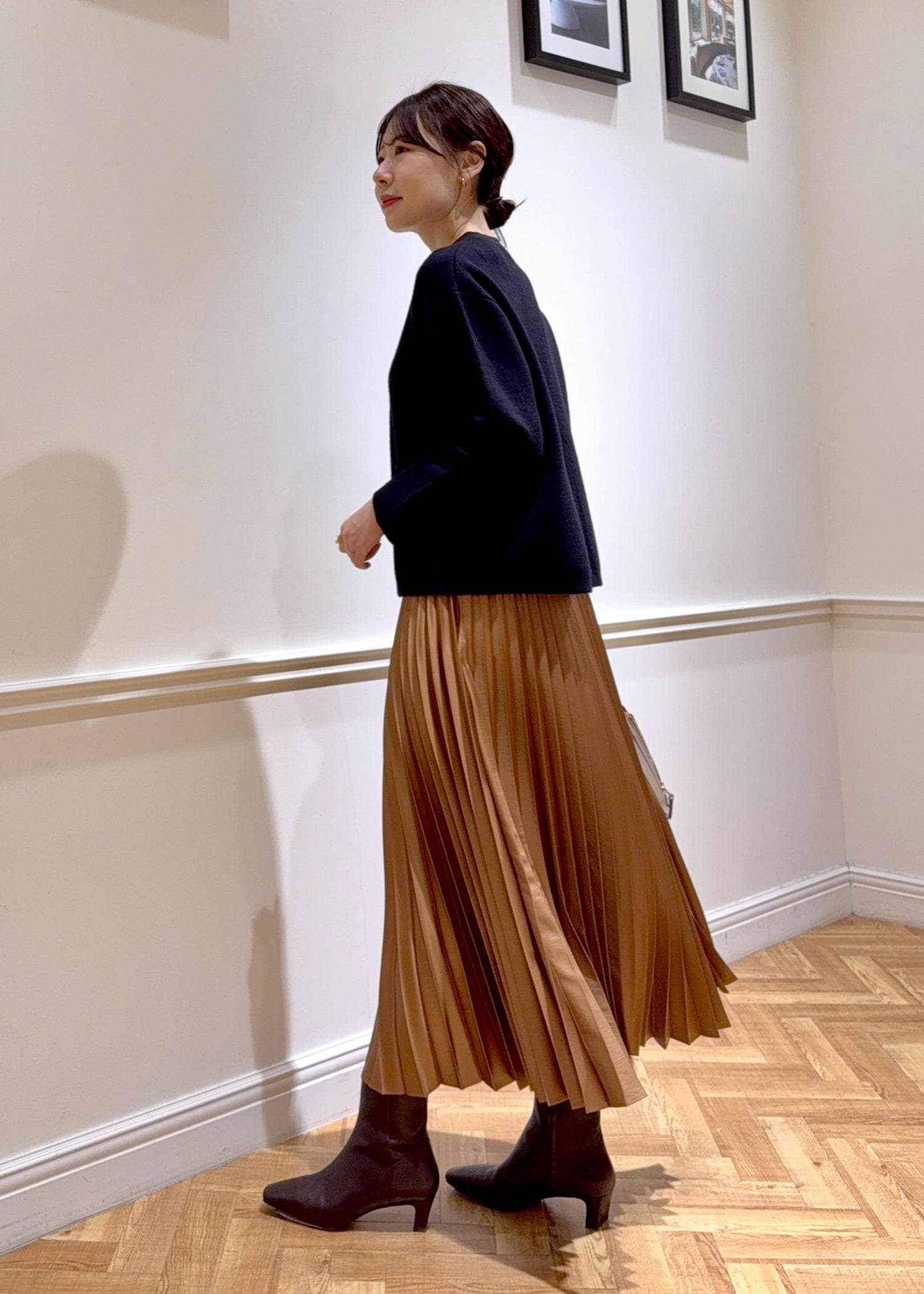 羽織りでも一枚着でもサラッと着やすいニットカーディガンとプリーツスカートを合わせたキレイめコーデです。