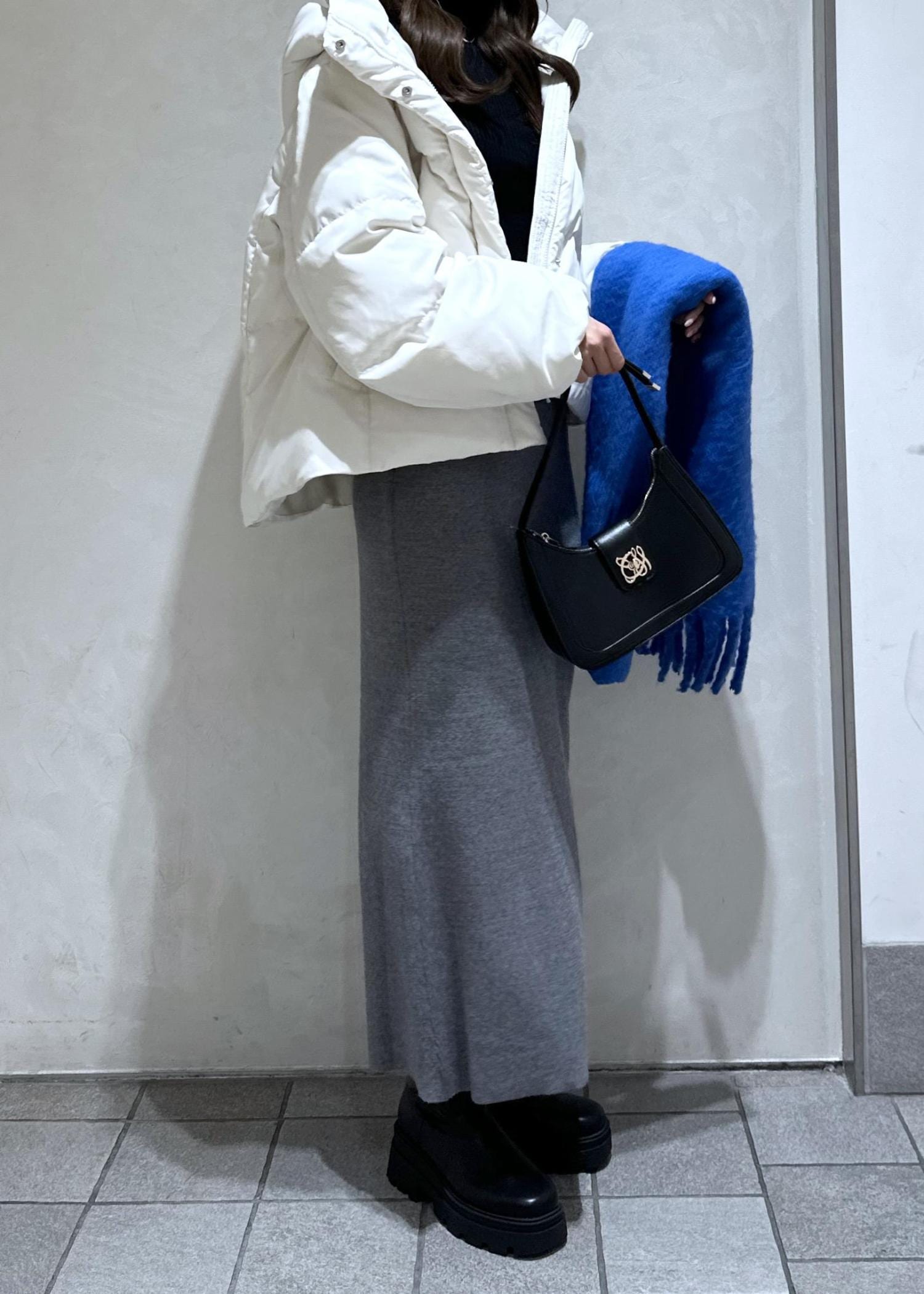 ブルーマフラーで差し色をプラスした大人シンプルコーデ。