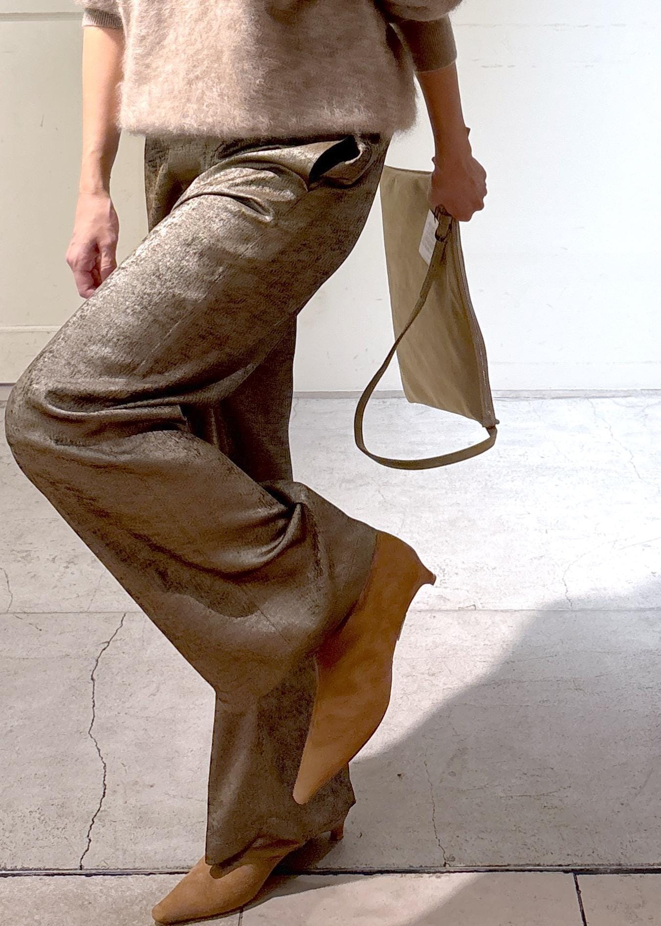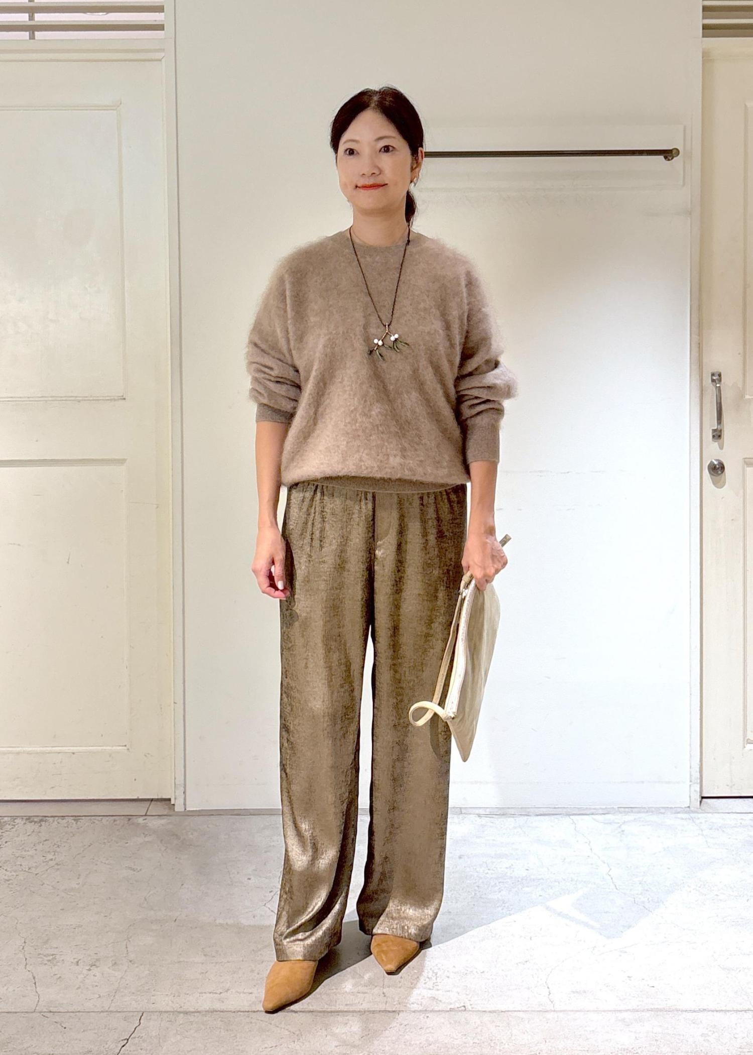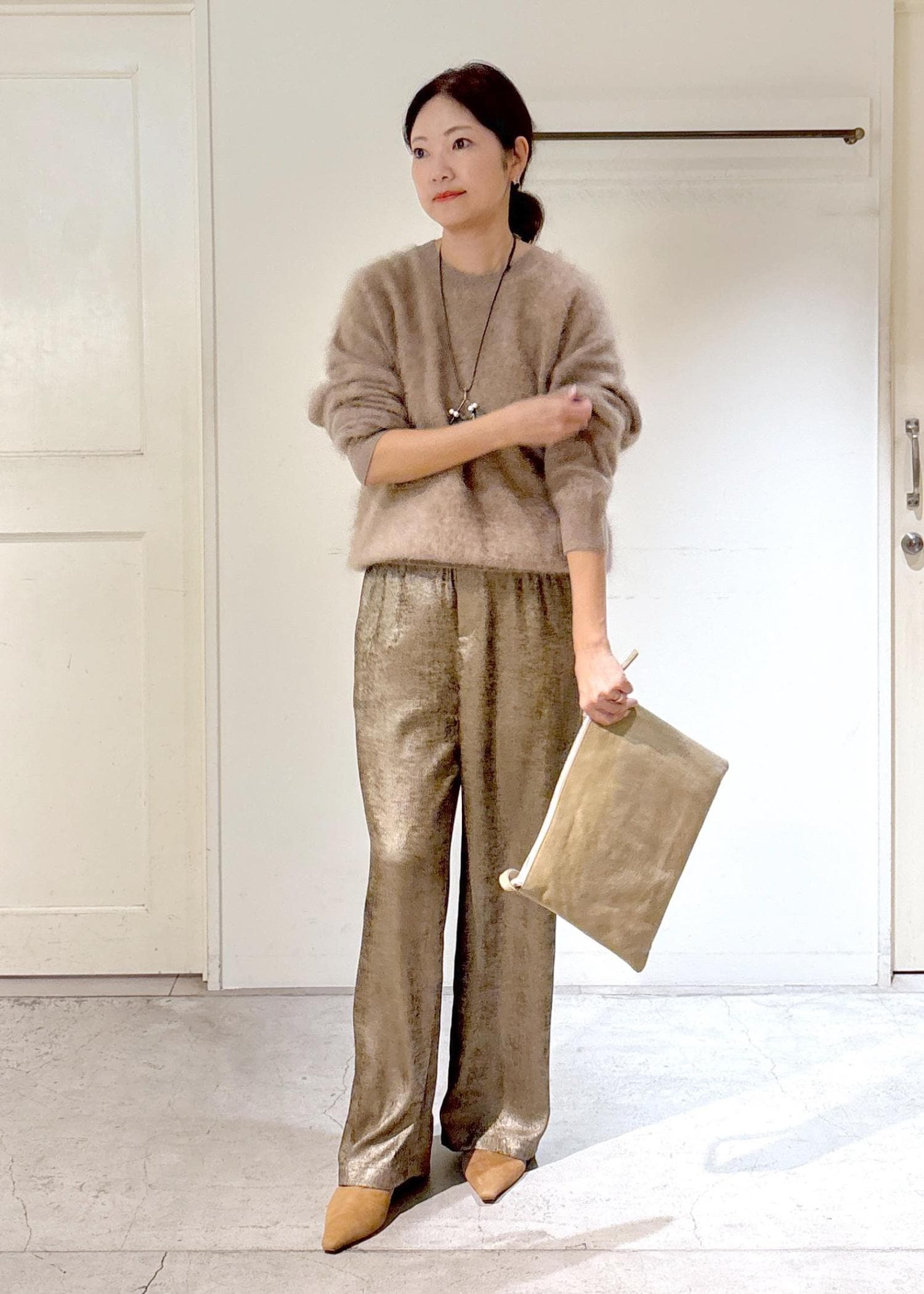 SALON adam et ropéサテンワイドイージーパンツゴールド / M¥20,900レビュー163cmでくるぶし丈です。サラッとしたサテン素材なので、オールシーズンお使いいただけますよ。