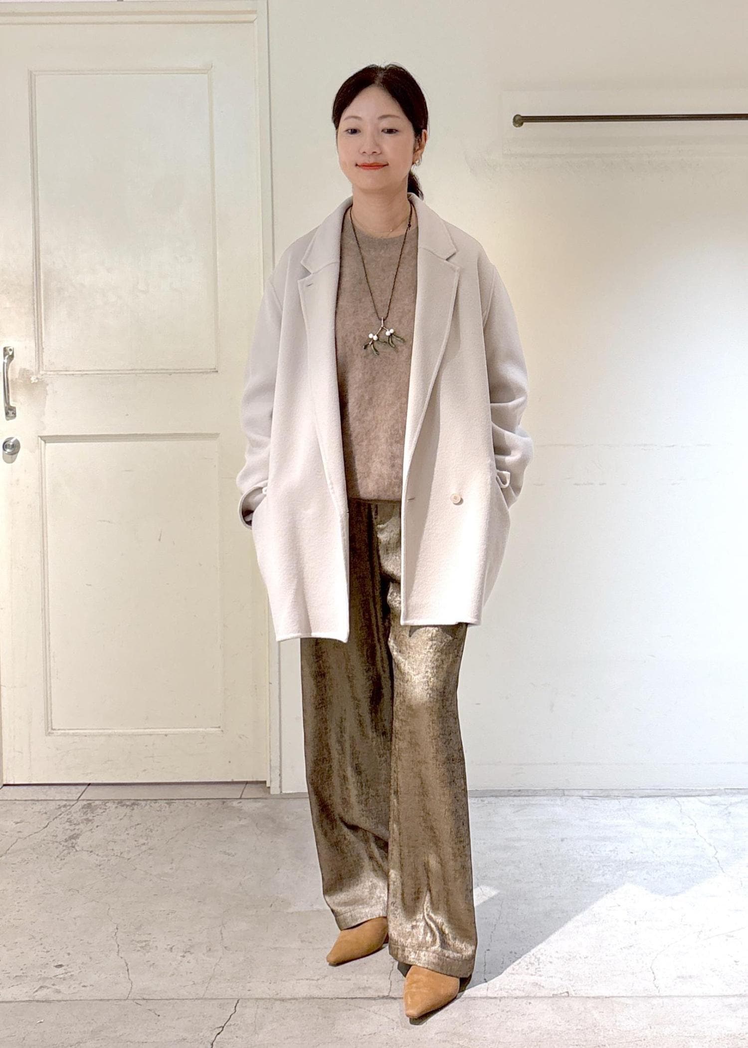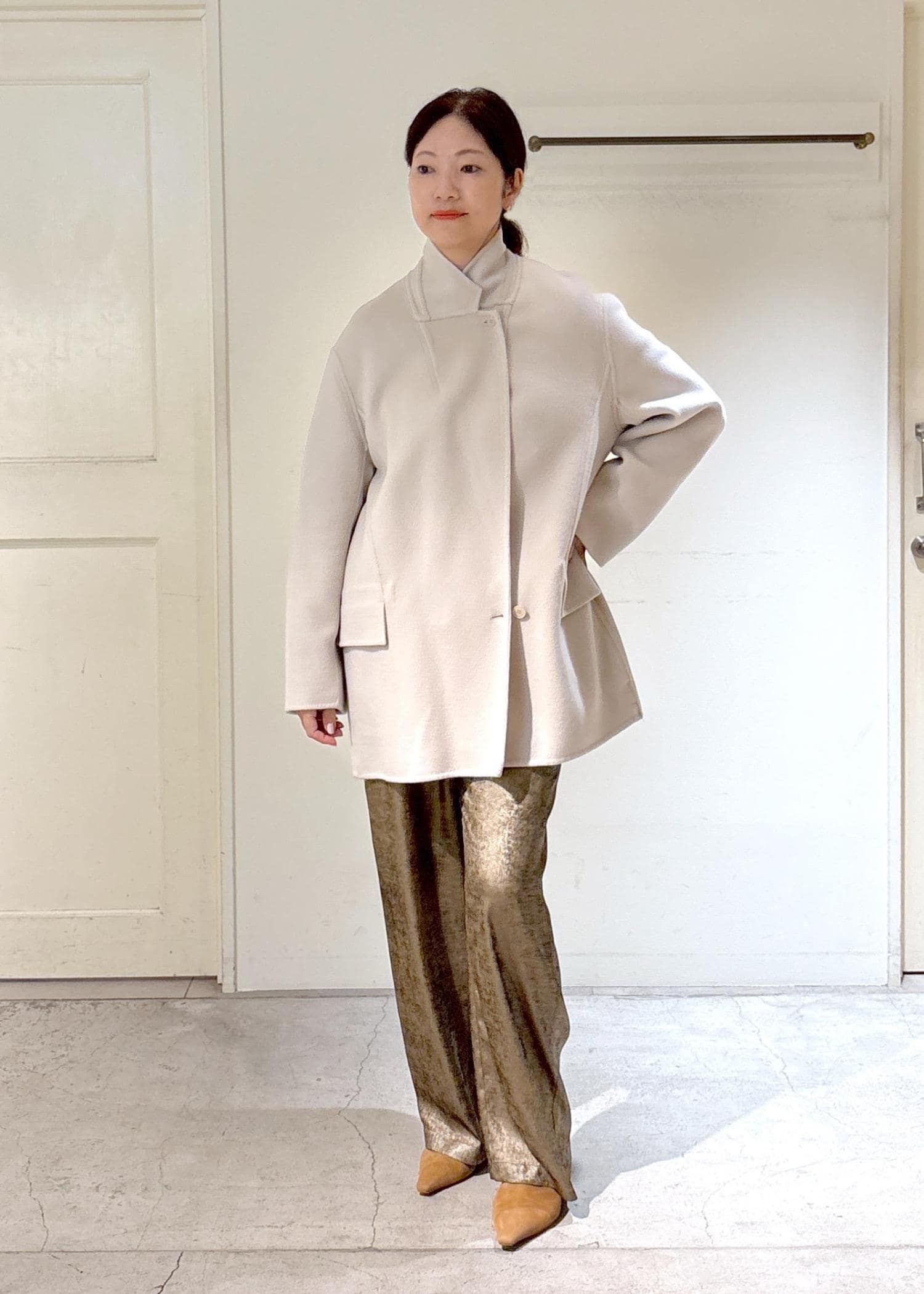 SALON adam et ropéシャルムリバージャケットコート / ミドルウールコートオフホワイト / F¥59,400レビュー163cmでヒップが隠れる着丈です。フリーサイズでゆったりとした身幅です。襟の脇にあるボタンを止めれば胸元を閉められるので、風をよけ暖かく着ていただけます。