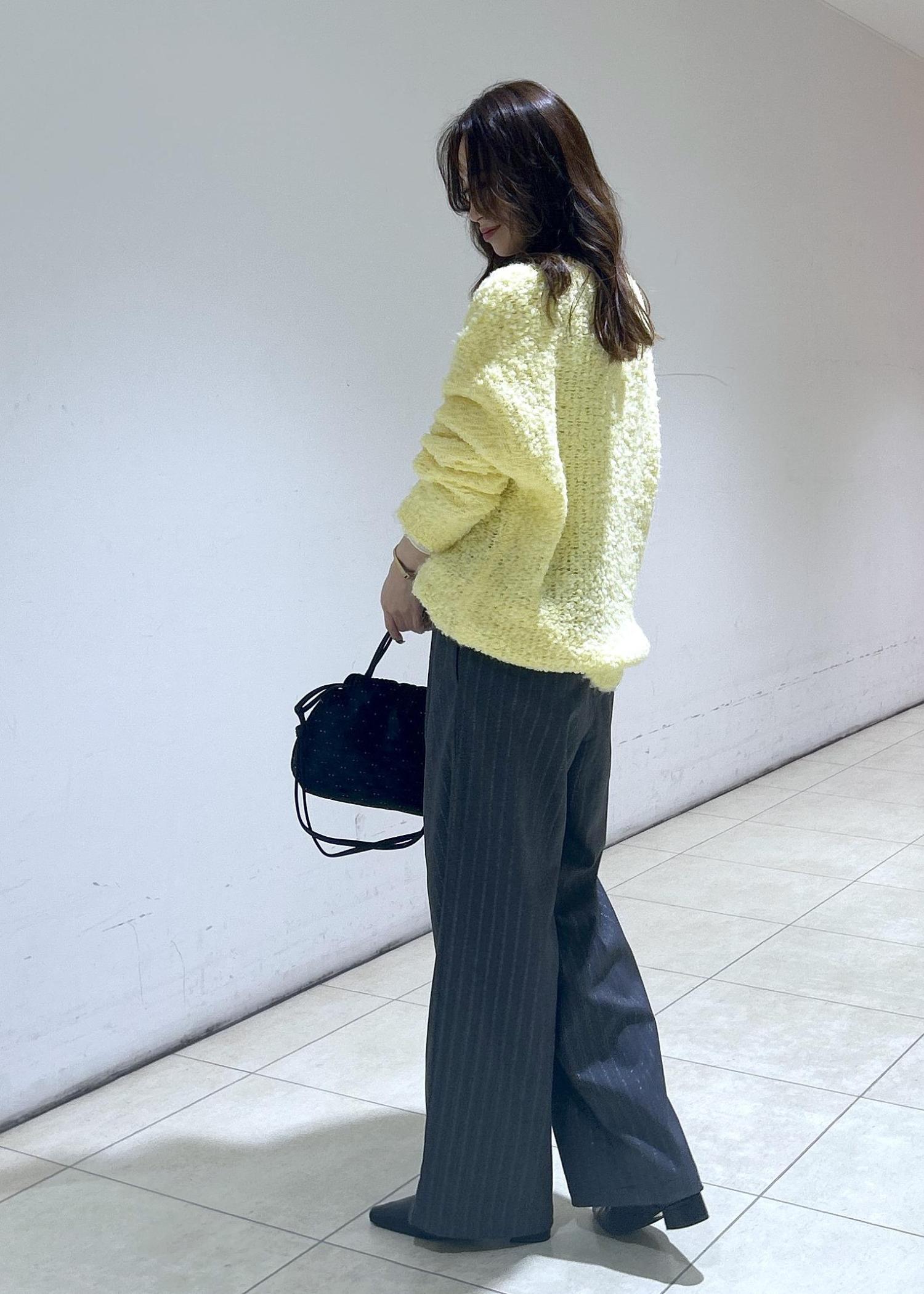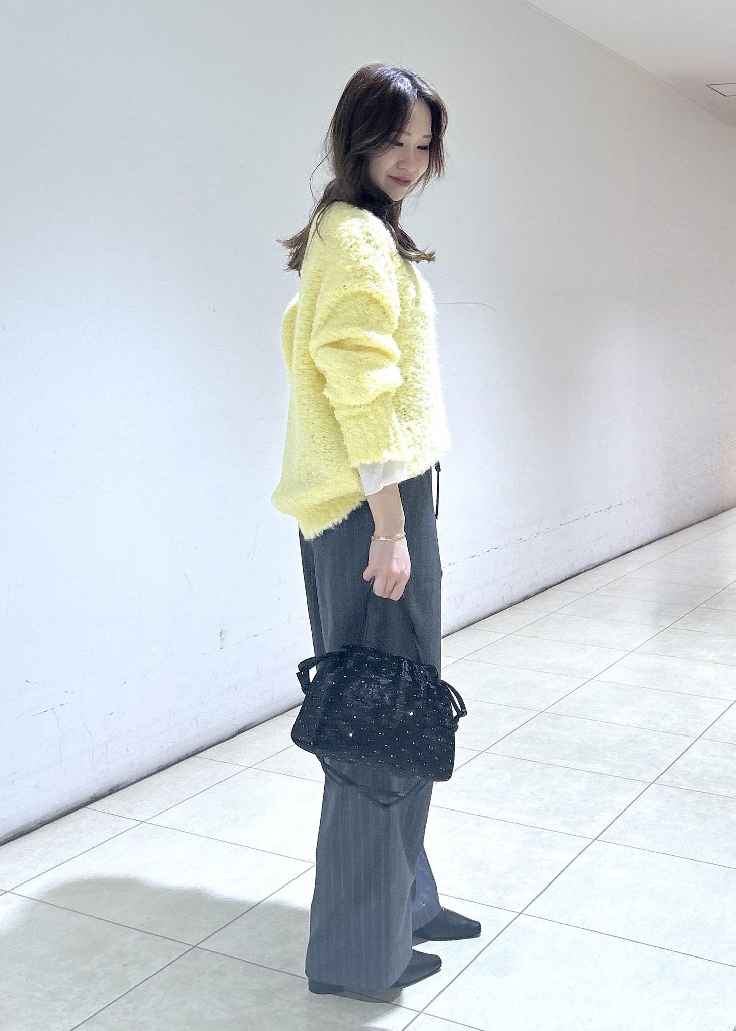 イエローのニットがポイントになるよう他のアイテムはグレーやブラックで統一感を出したスタイリングにしました。