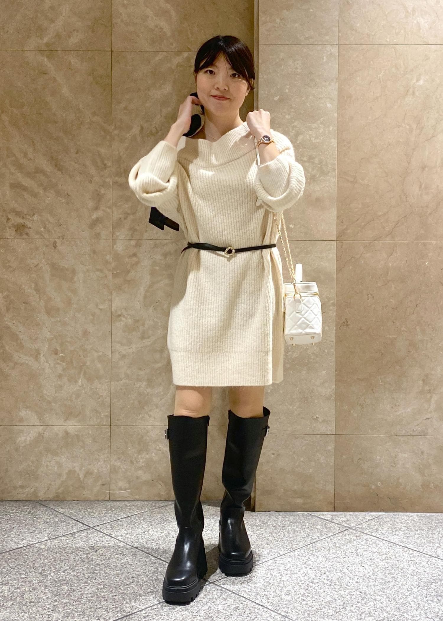 VISねじりショートトップス付きロングニットワンピース/イージーケアキナリ / F¥9,999レビュー150cmでFサイズ着用し、かかとが隠れるぐらいの丈感でした!