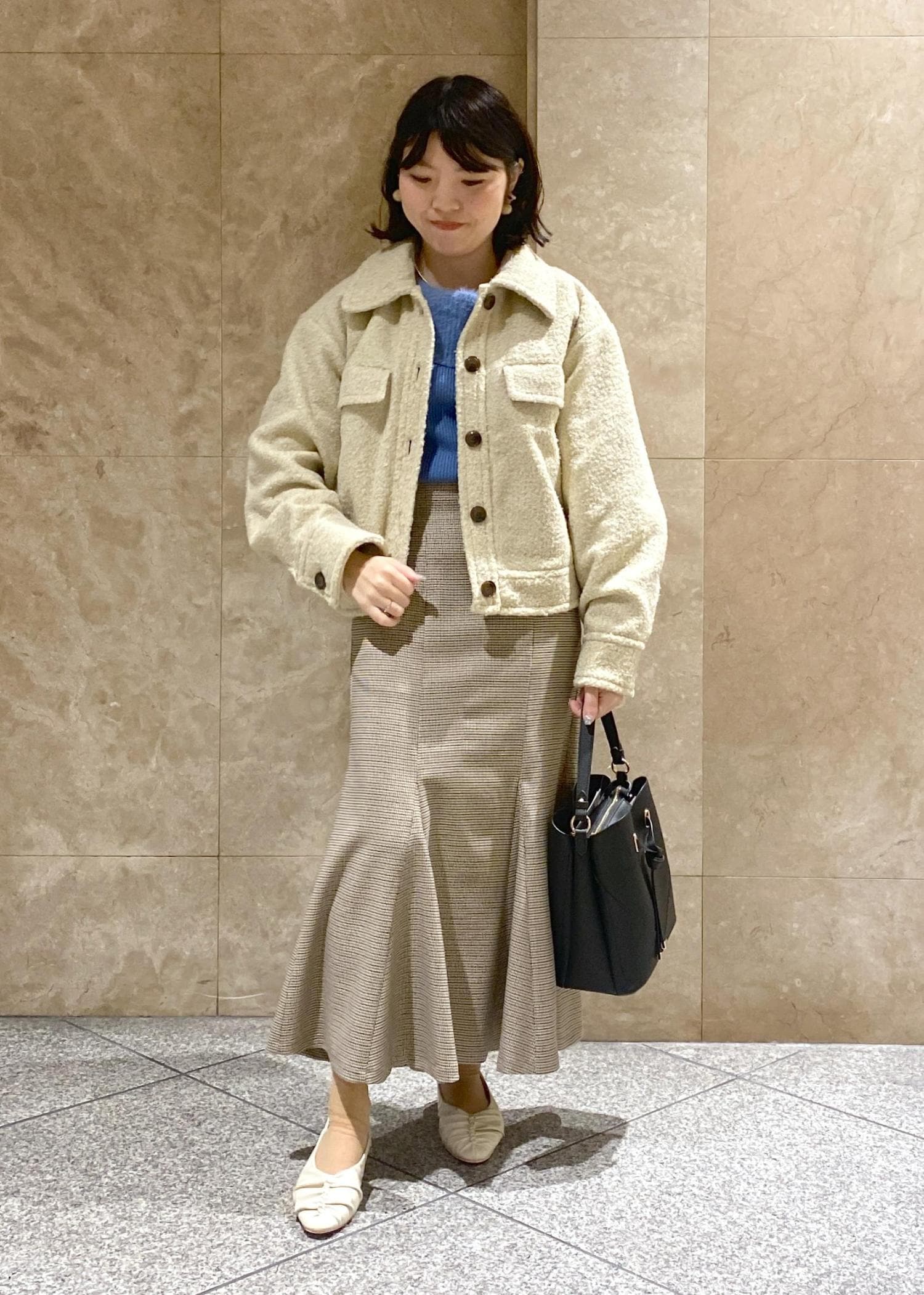 ショート丈なのですが、肩周りや袖は少しゆとりがあったので、中に分厚めのニットやインナー着用しても大丈夫です◎