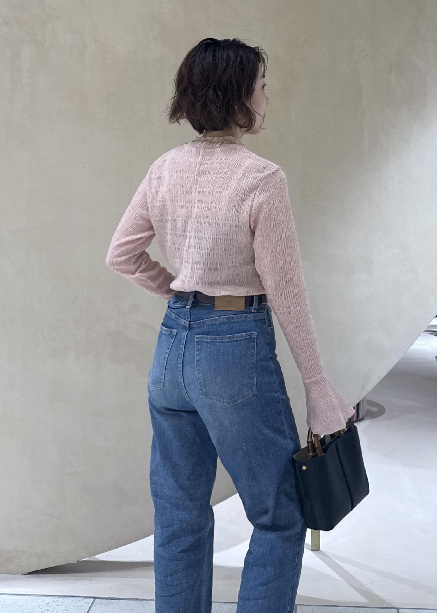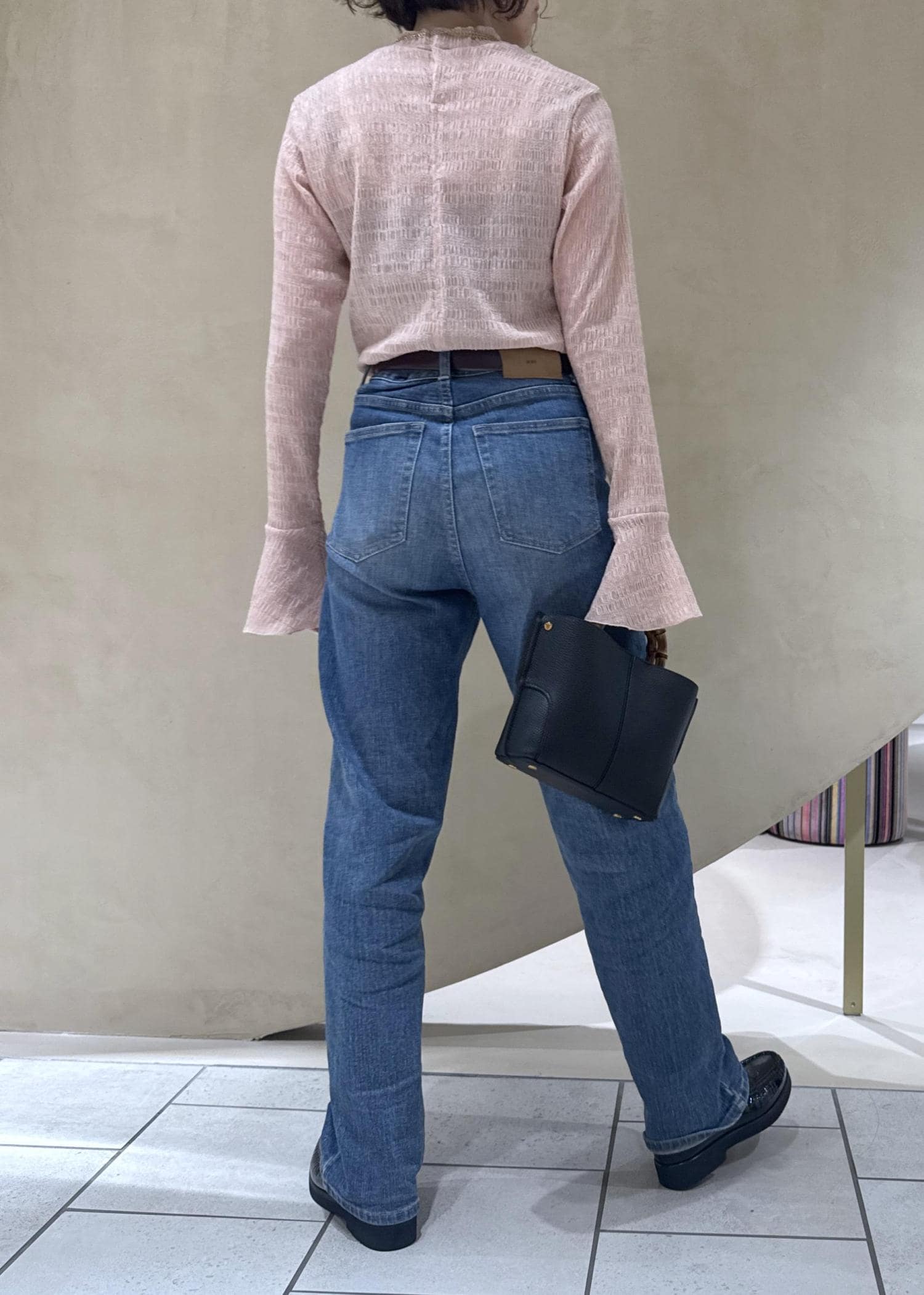 ヒップポケットはiPhone15proが落ちる心配がないくらい大きめですが、高めの位置にあるため後ろ姿も綺麗に見せてくれます。
