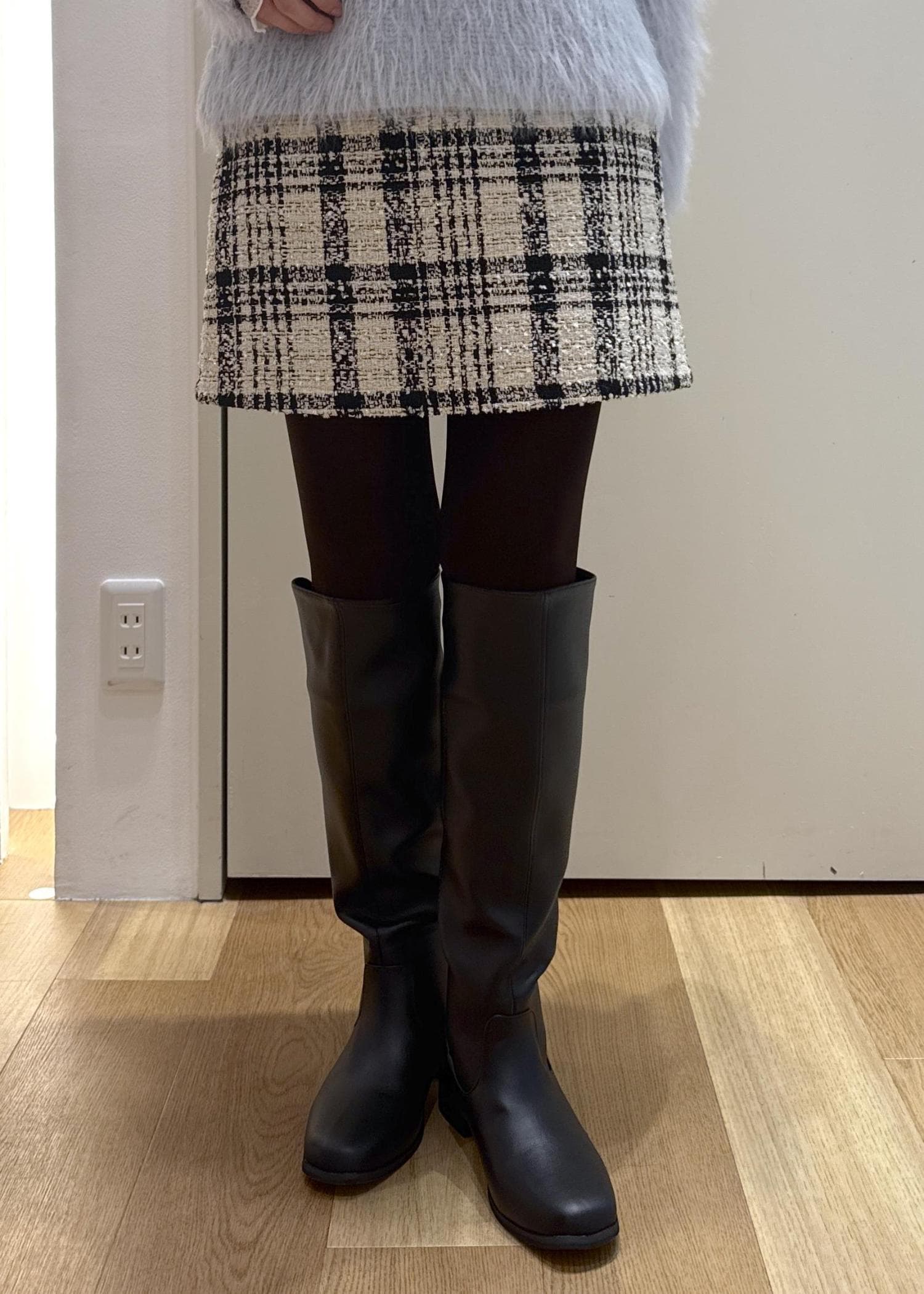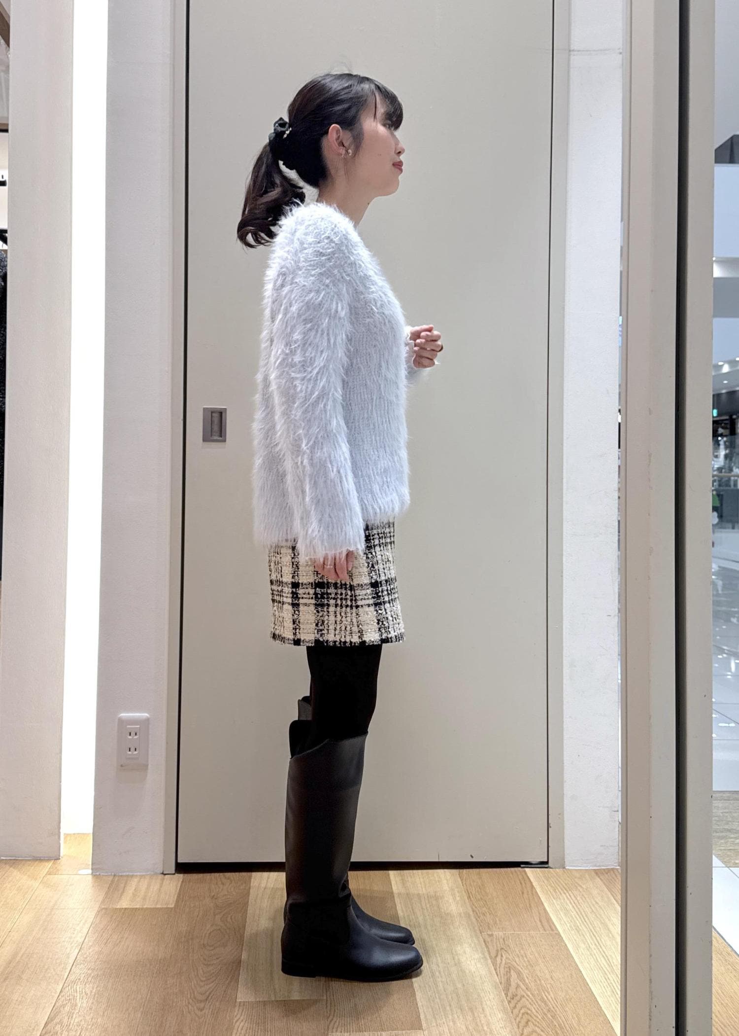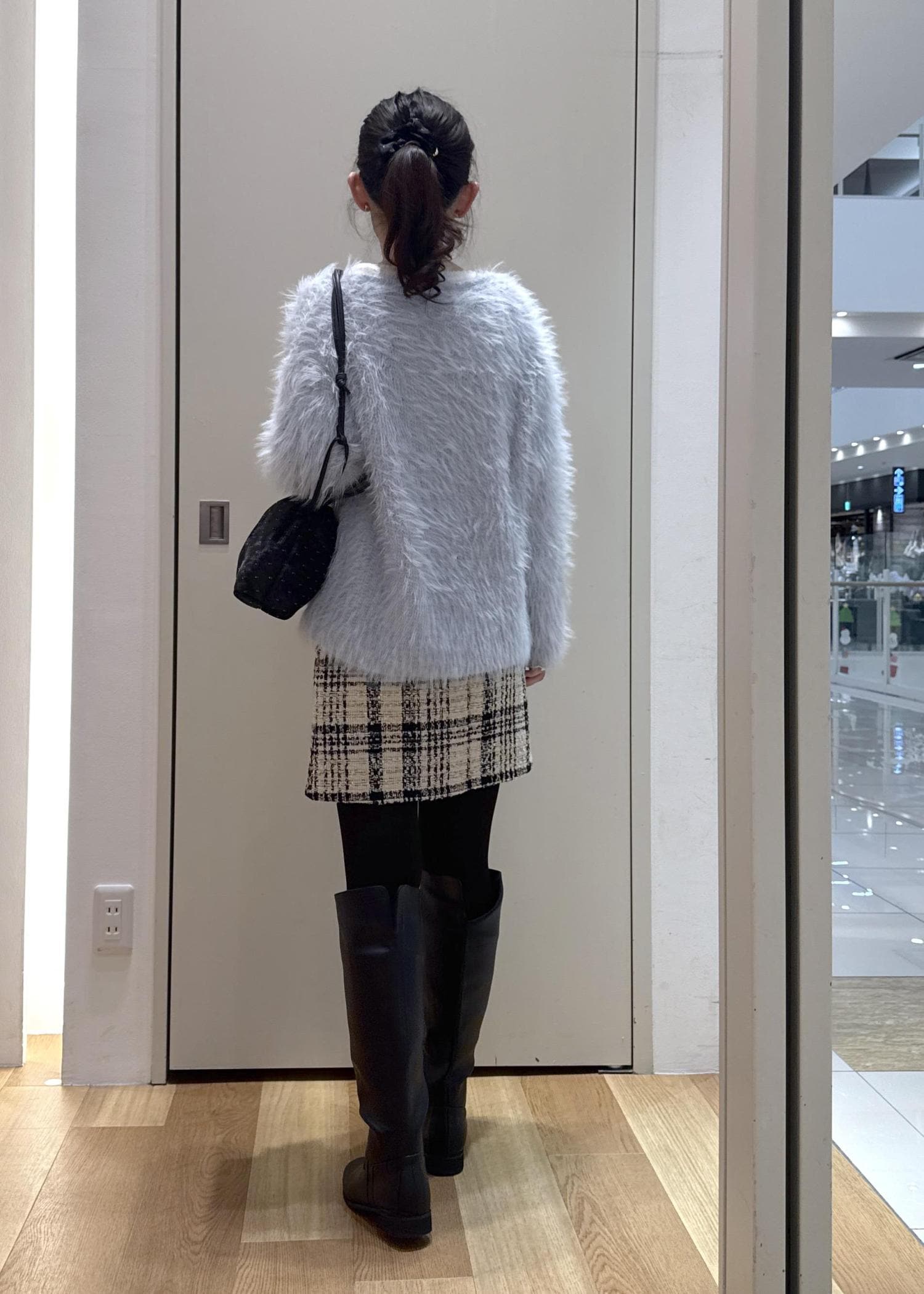 ふわふわなフェザーニットに、ツイード素材のチェックミニスカートを合わせたフェミニンコーデです。