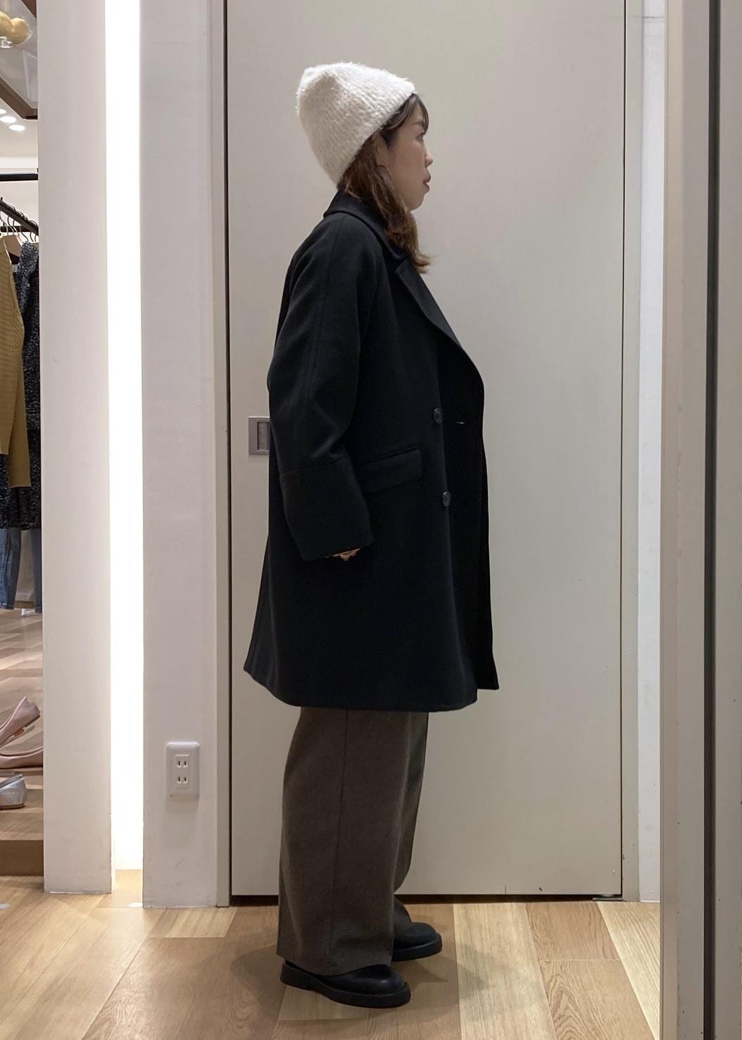 オーバーシルエットのコートで、窮屈感なく動きやすく、おでかけにぴったりなコーディネートです。