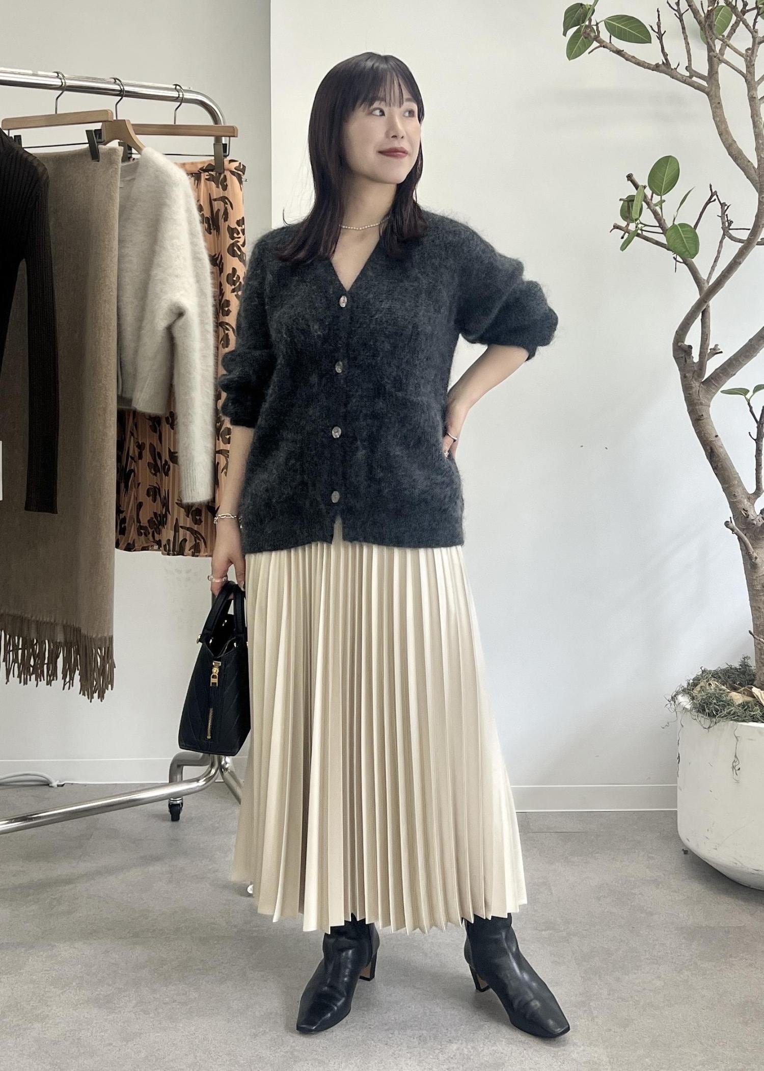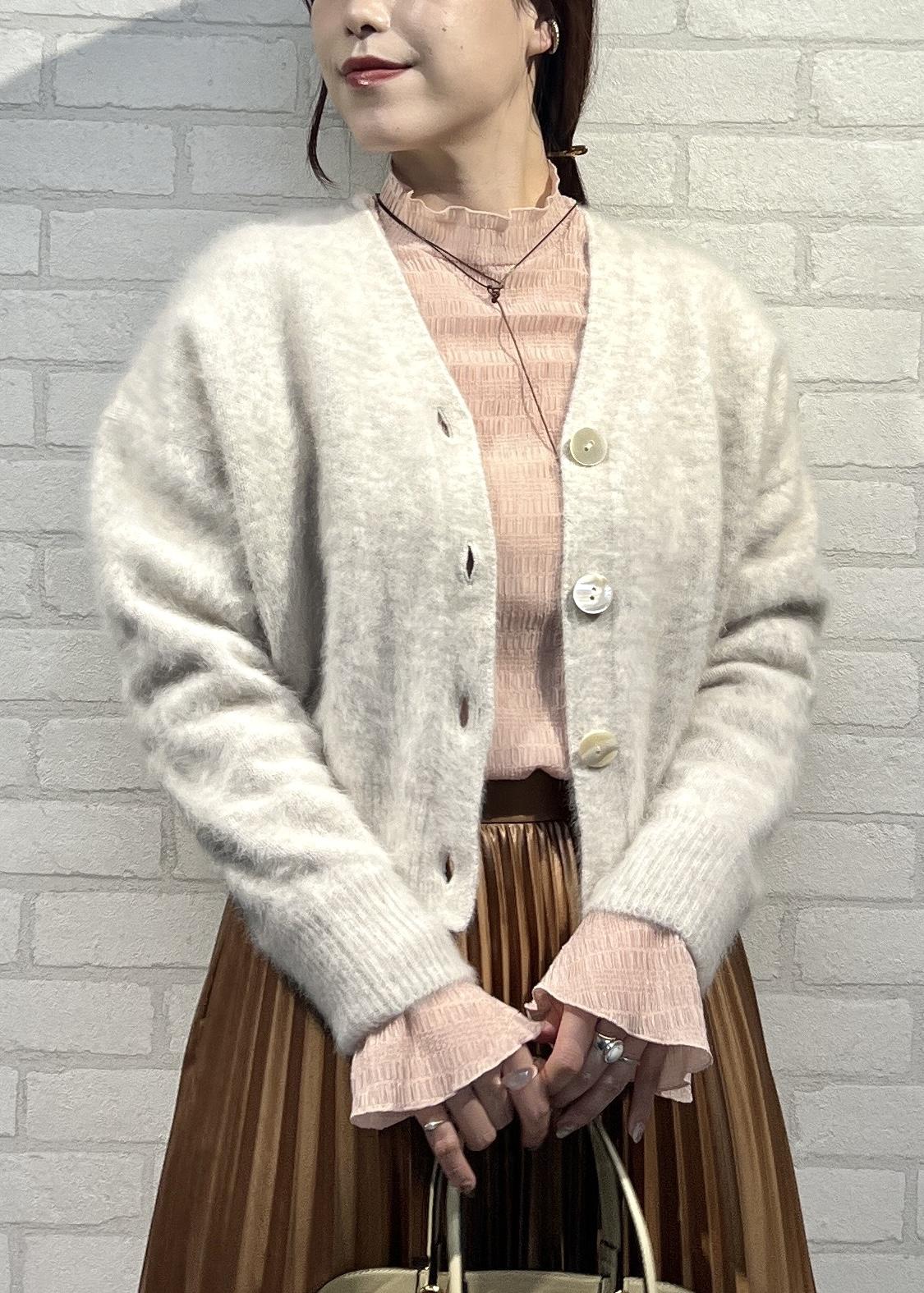 NEW!ROPÉフォックスカシミヤニットカーディガン/イージーケア・アンサンブル対応ホワイト系 / F¥33,000レビュー着丈は腰回りが隠れるくらいの短丈。