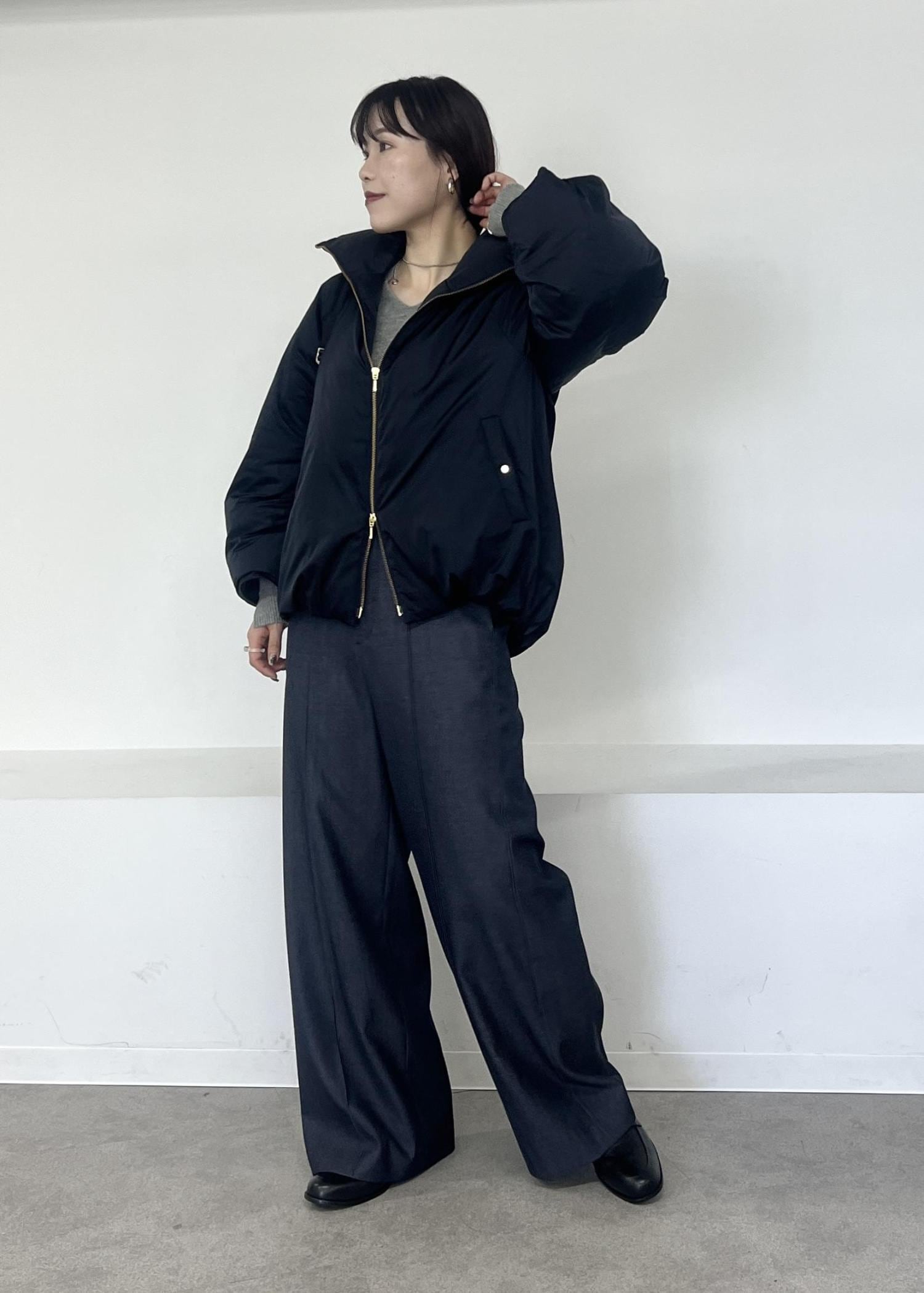身幅は直線的なラインでゆとりがあり、肩も落ちていてルーズなサイズ感のため体のラインは拾わないです。