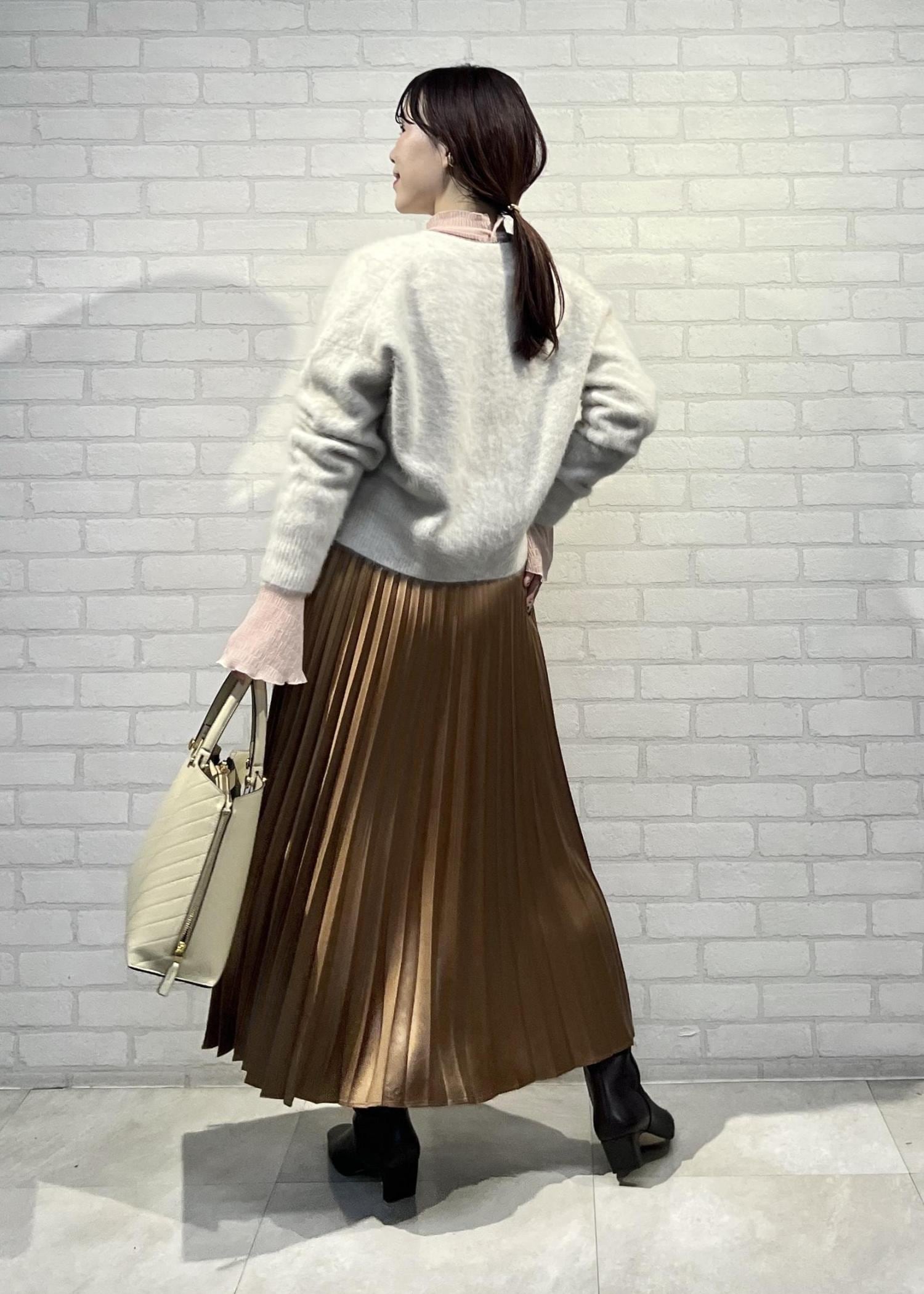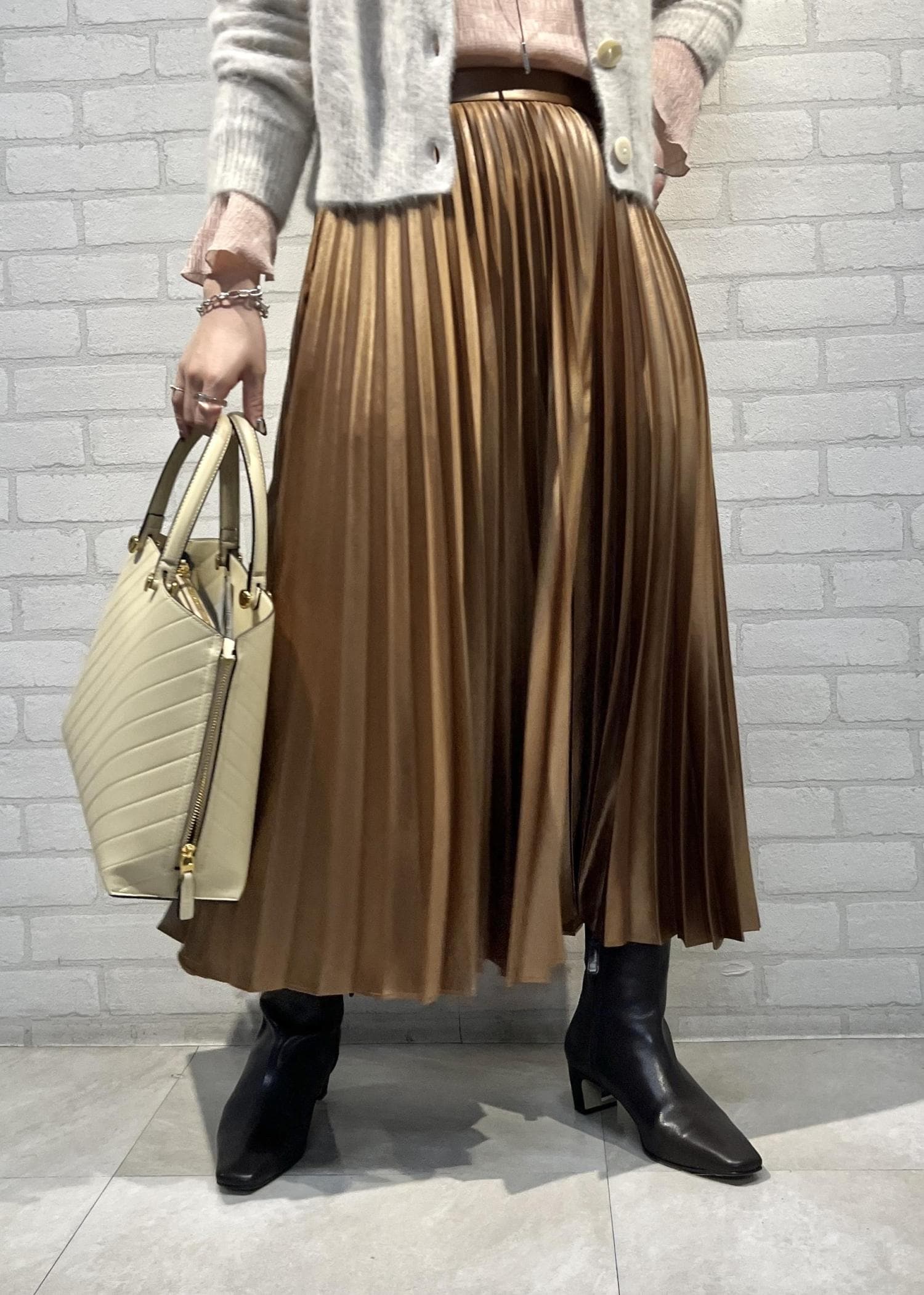 ROPÉシャイニープリーツスカート/イージーケアキャメル / F¥26,400レビュー着丈はふくらはぎの半分くらいで足首はしっかり見えます。