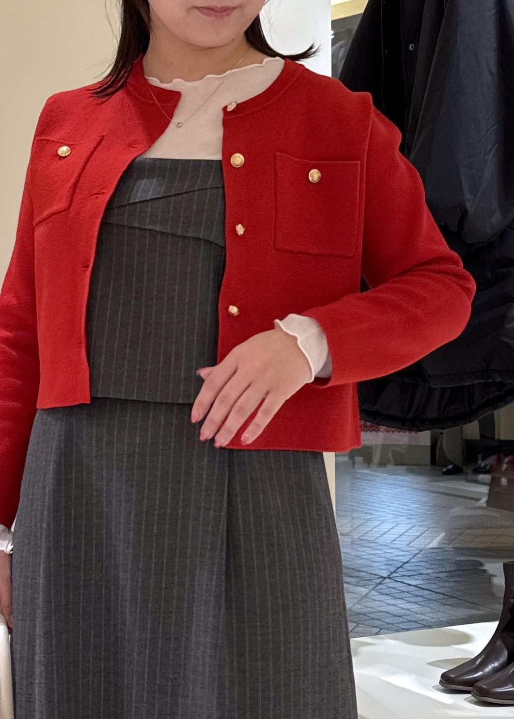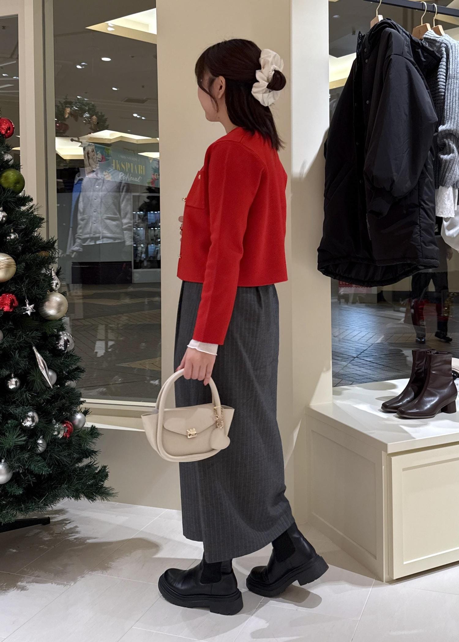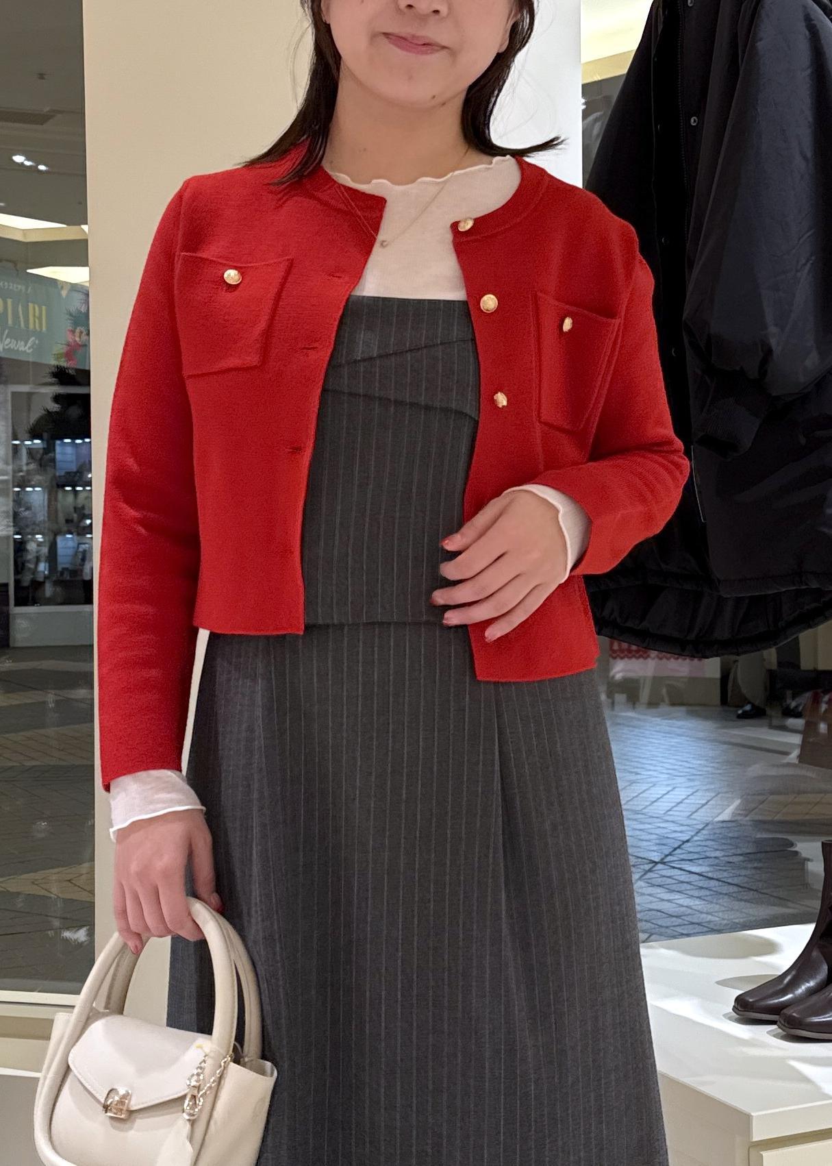 ミラノリブカーディガンの袖口から出る白のシアーインナーがクリスマスの配色でHolidayシーンにおすすめ♡