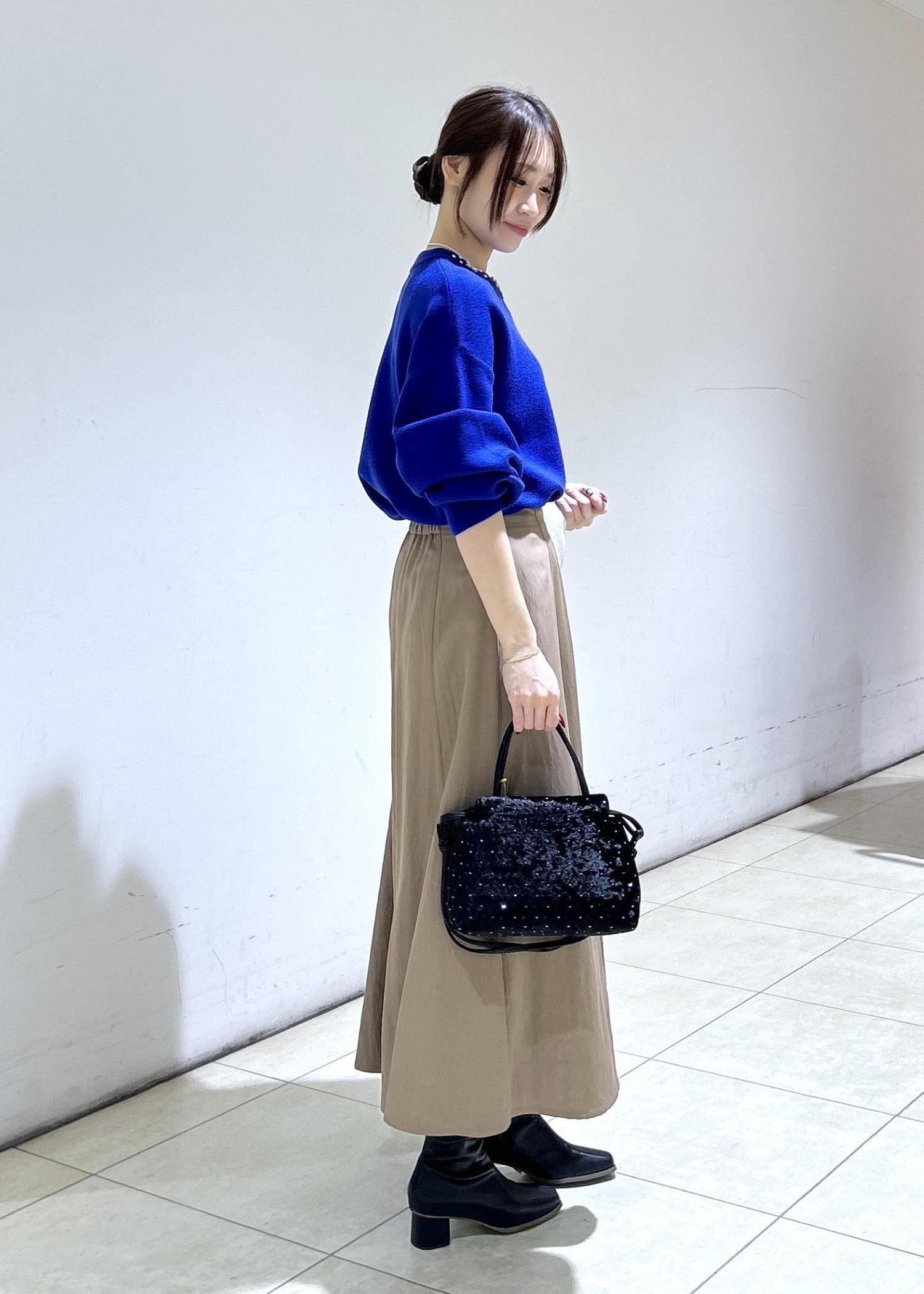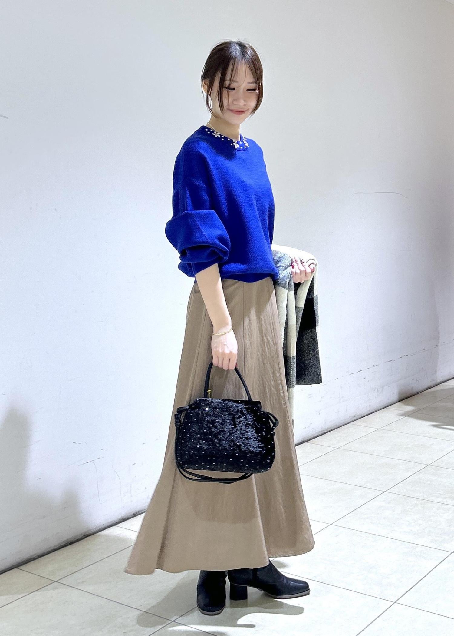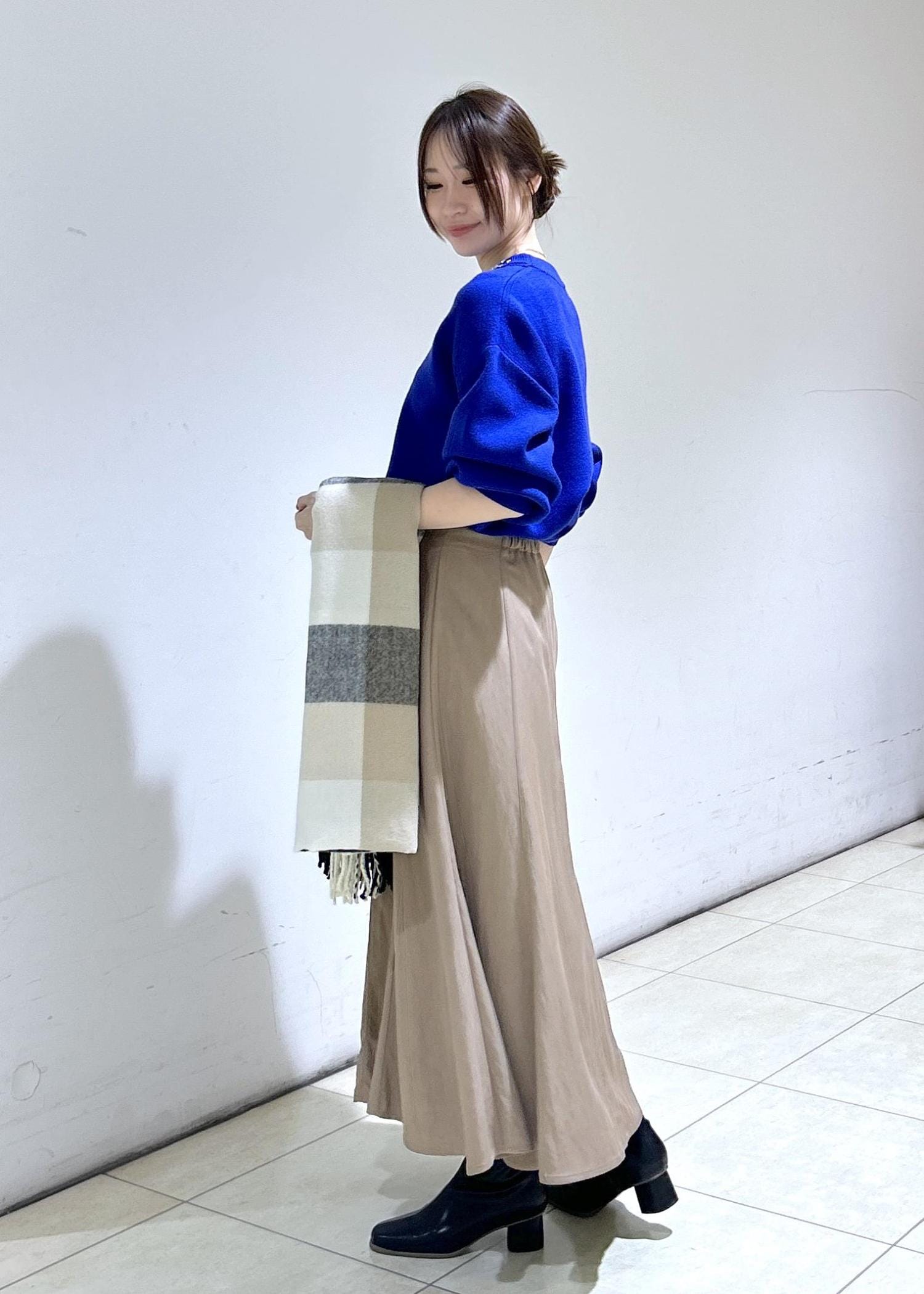 ブルーのニットにスカートを合わせてキレイめな冬スタイリングにしました。