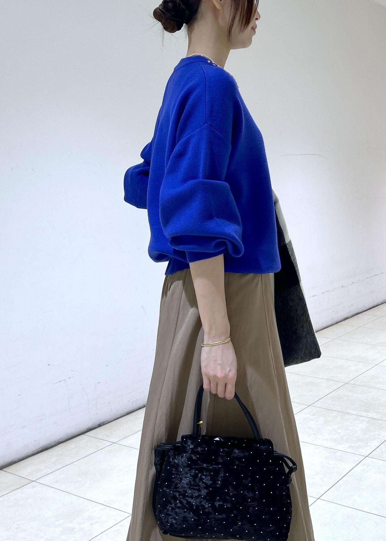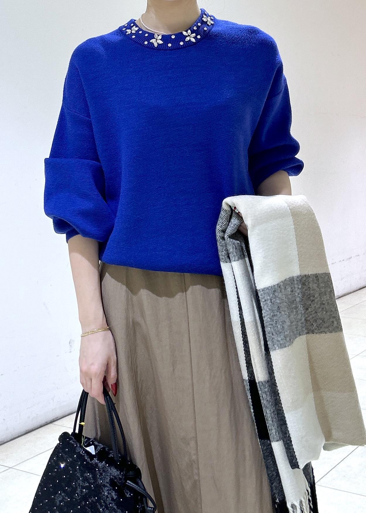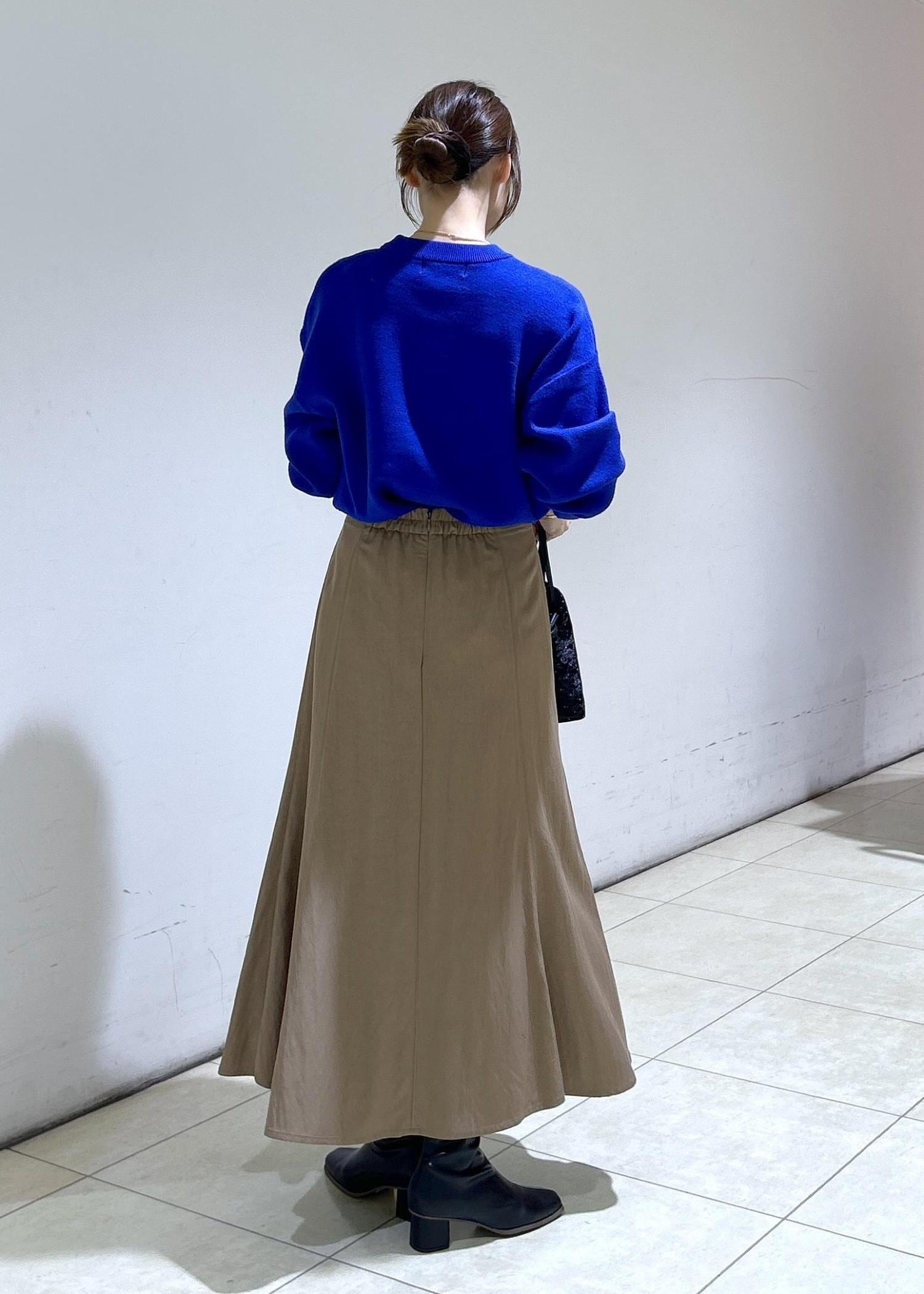 ブルーのニットにスカートを合わせてキレイめな冬スタイリングにしました。