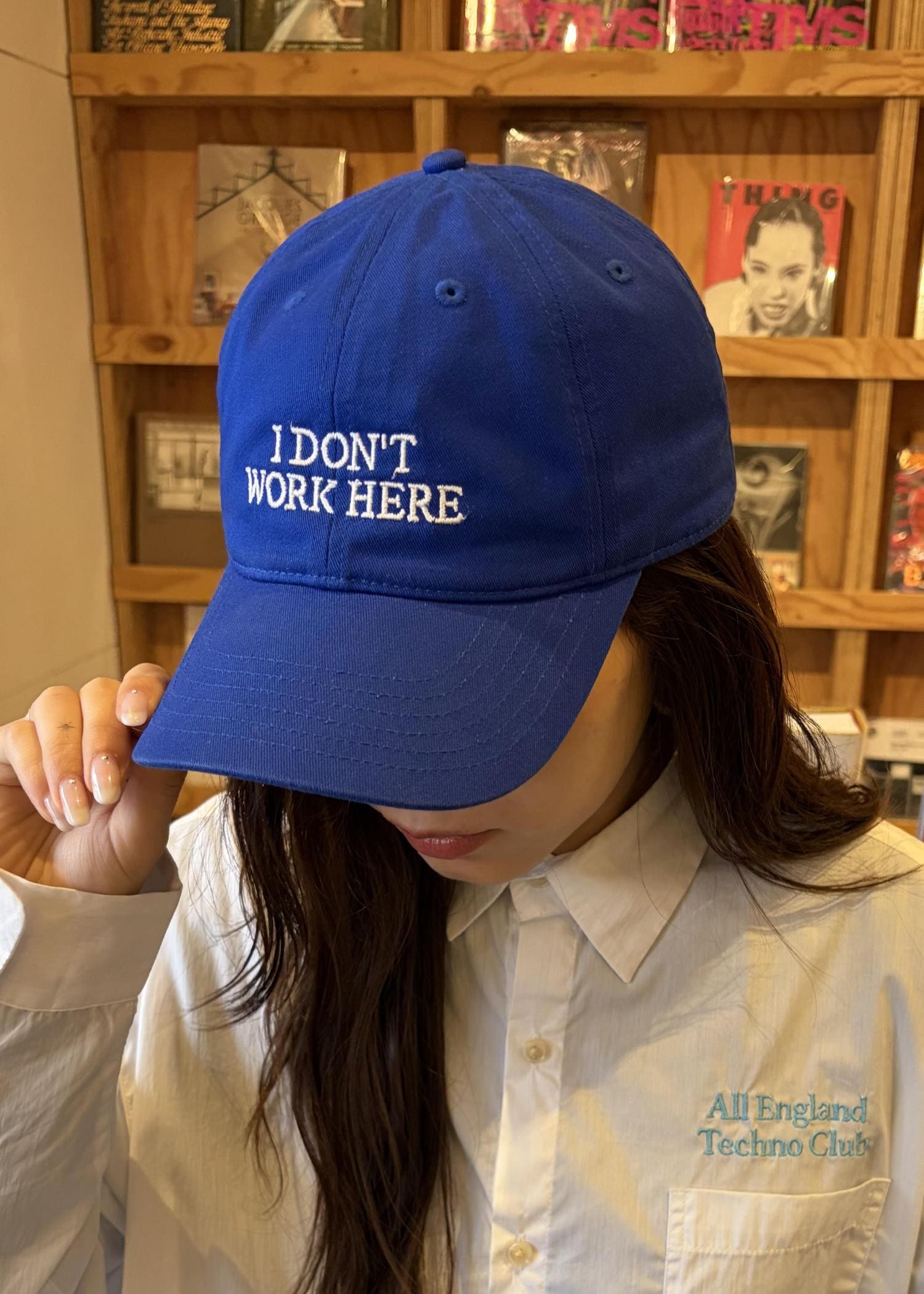 遊び心のある「I DON’T WORK HERE」のブルーのキャップをアクセントに締めました。