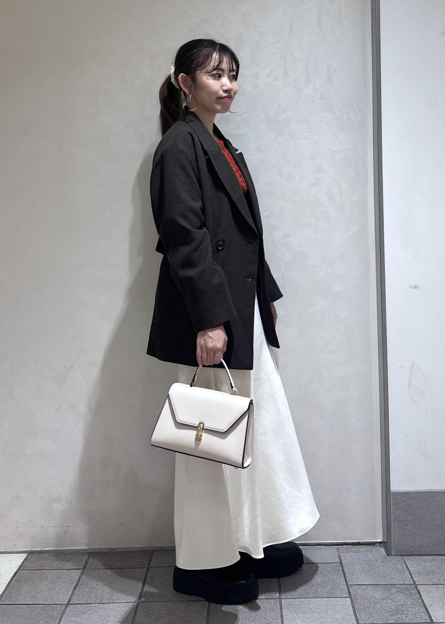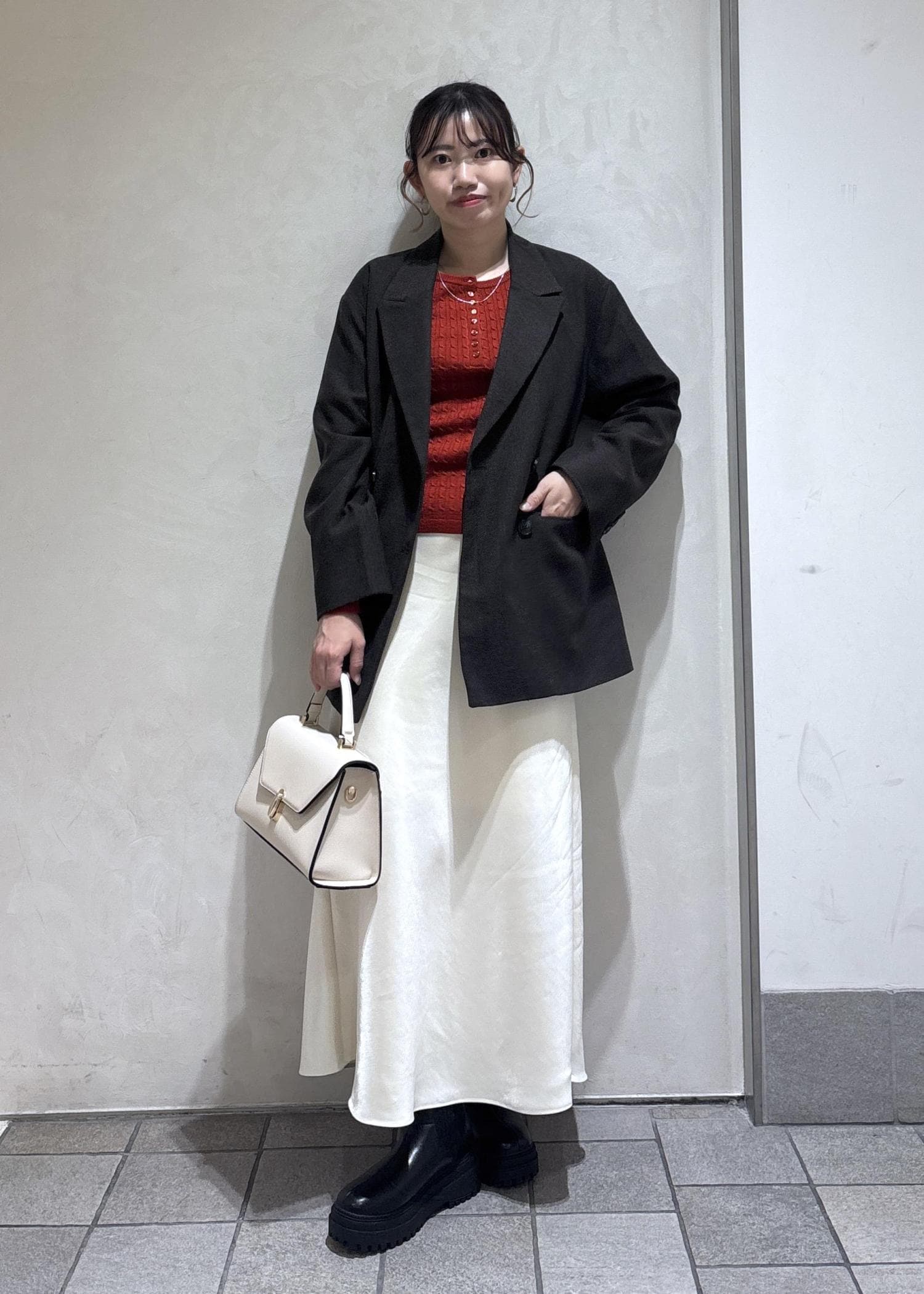brown jacket × red knit × white skirt