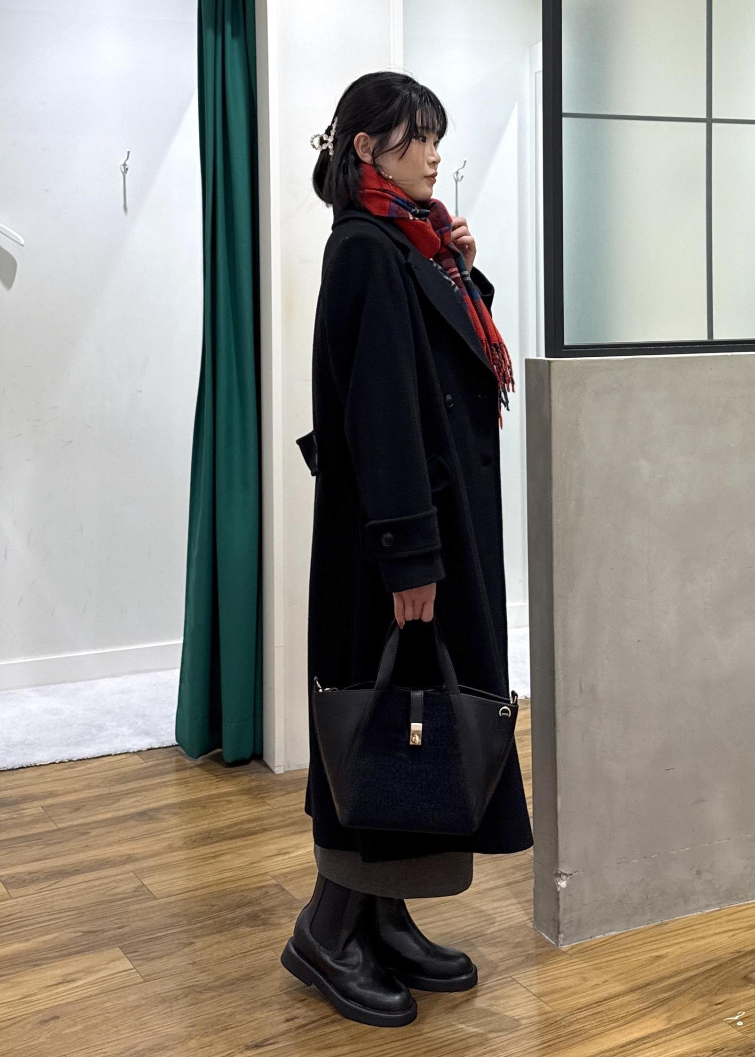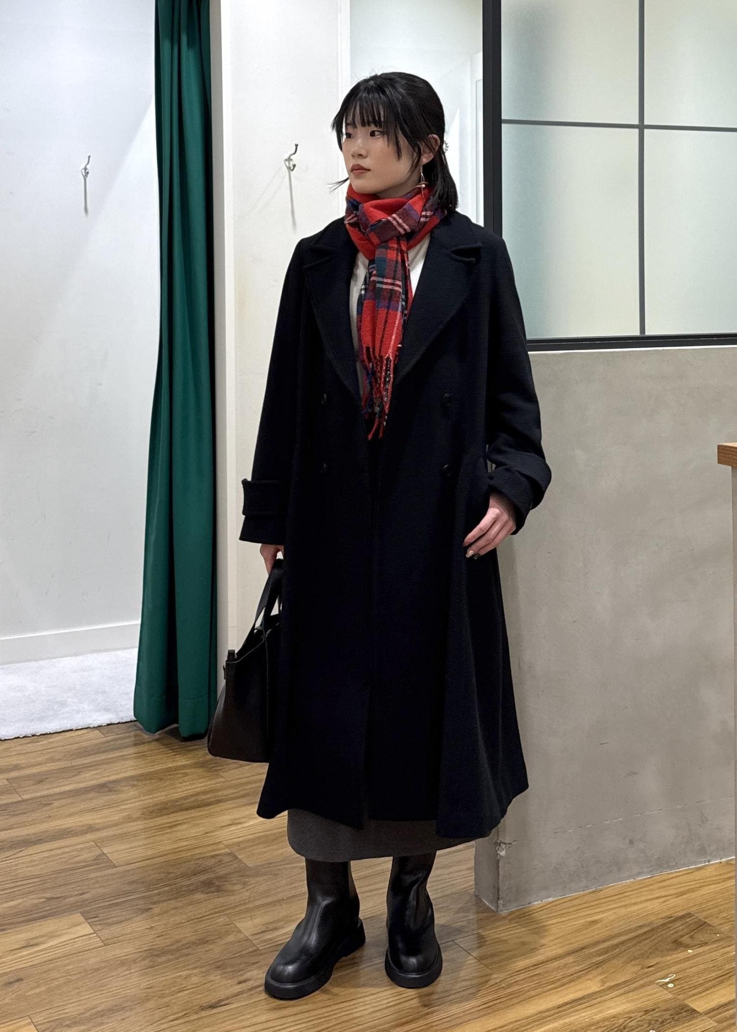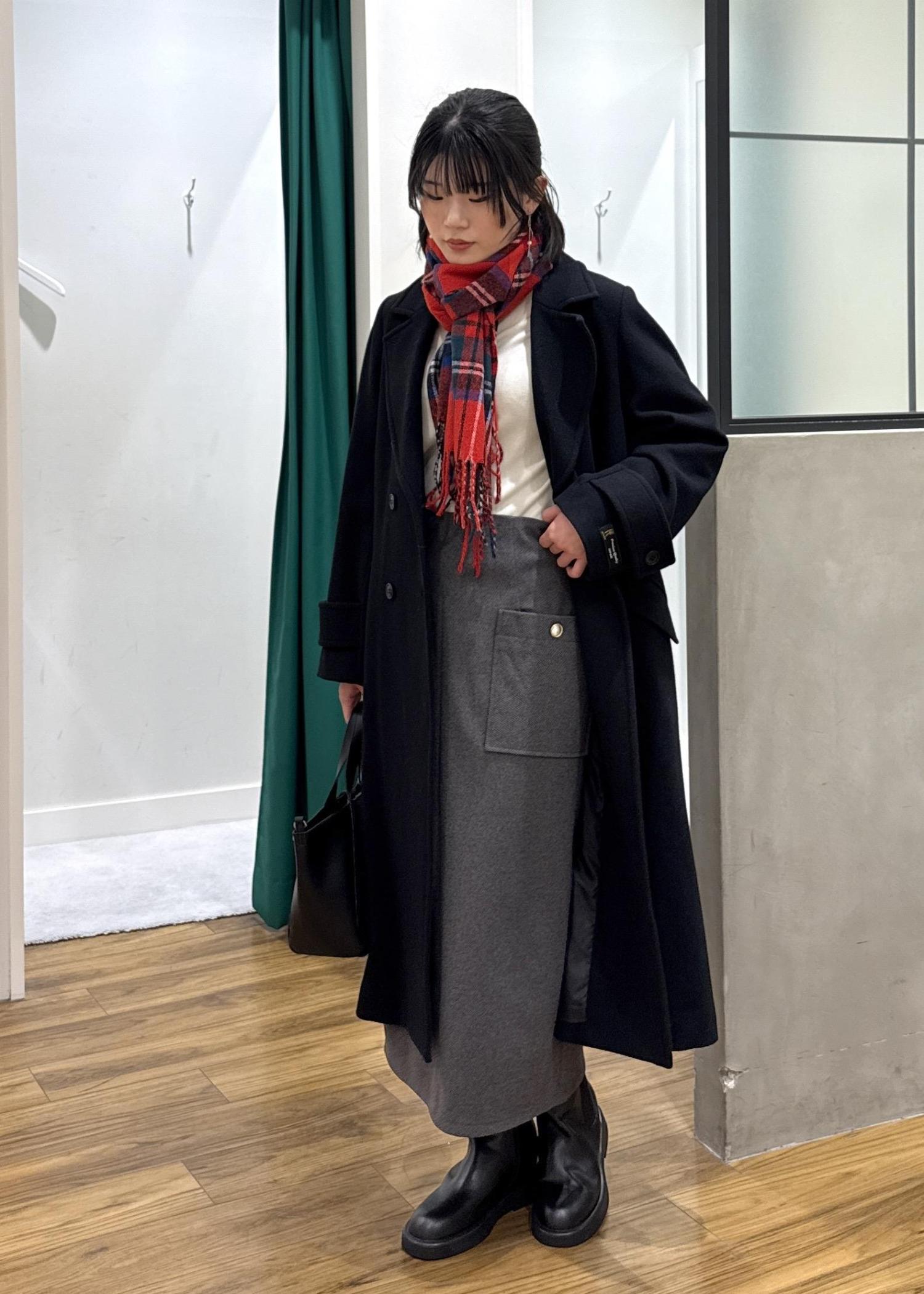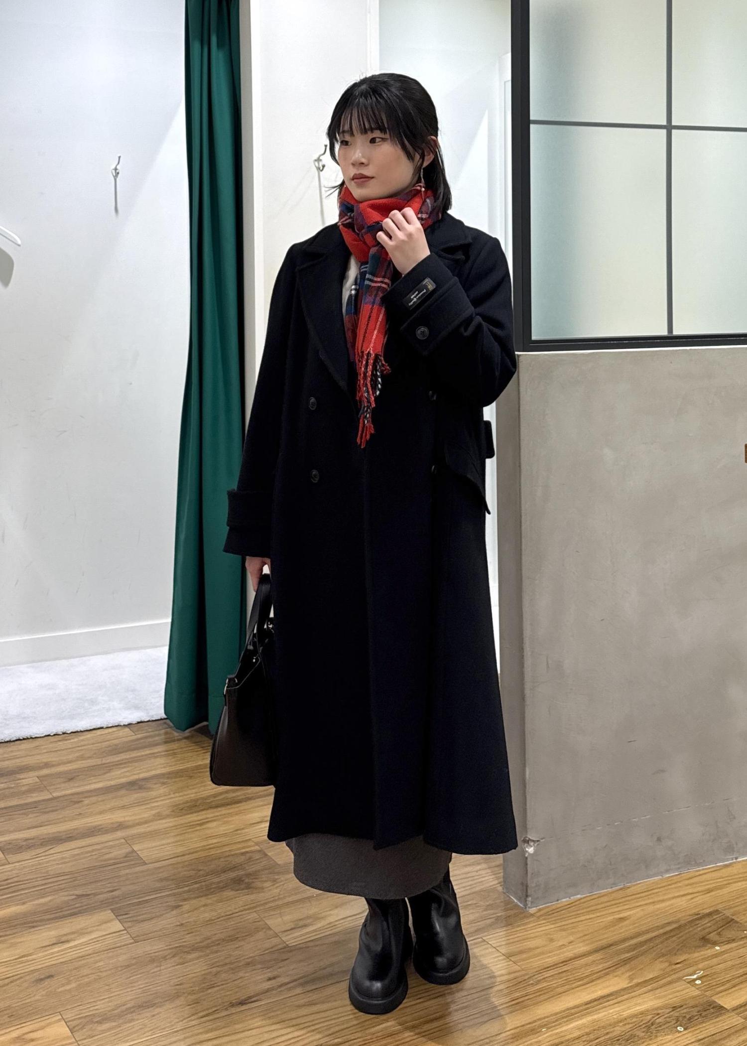 マフラーは、ブラック系にせず赤色でシンプルの中に華やかさを演出しました。