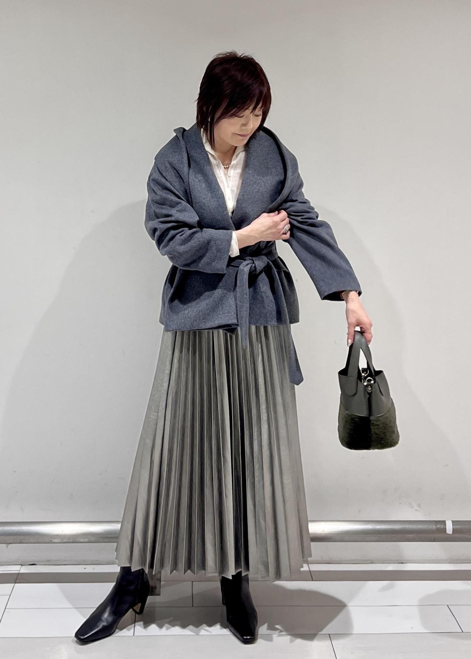 ショールカラーのコートはデニムにもドレスにも合いますが
