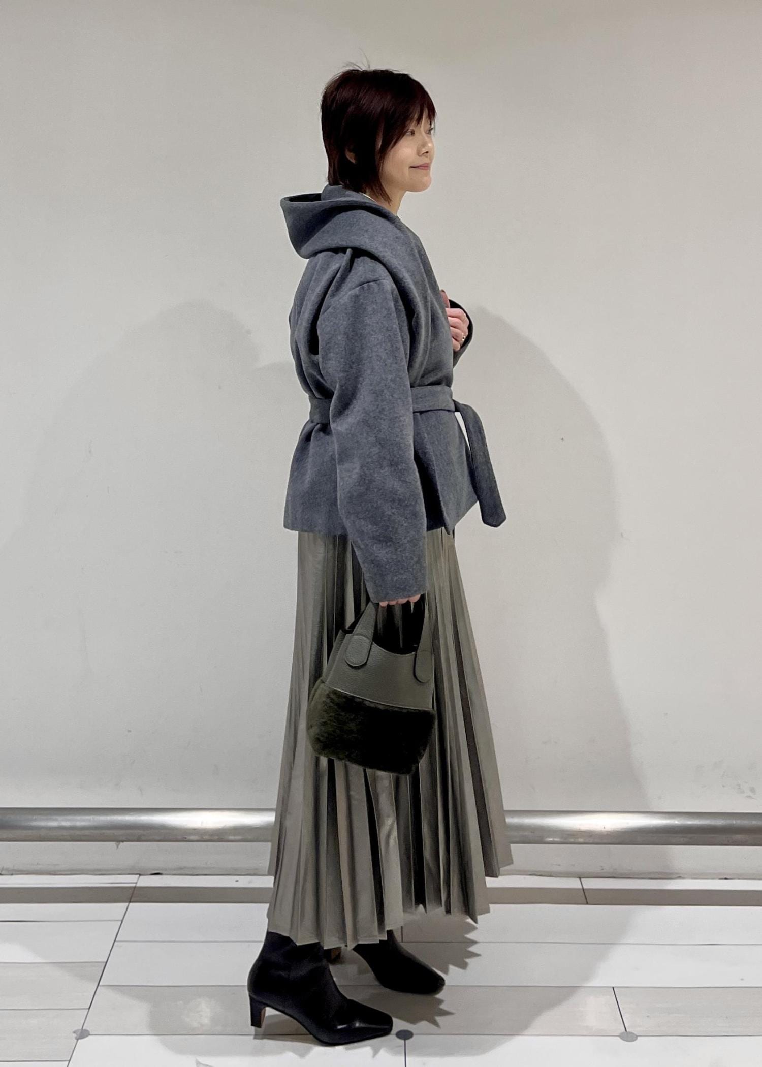 大きな襟をショールのように、時にはフードのように変幻自在です。