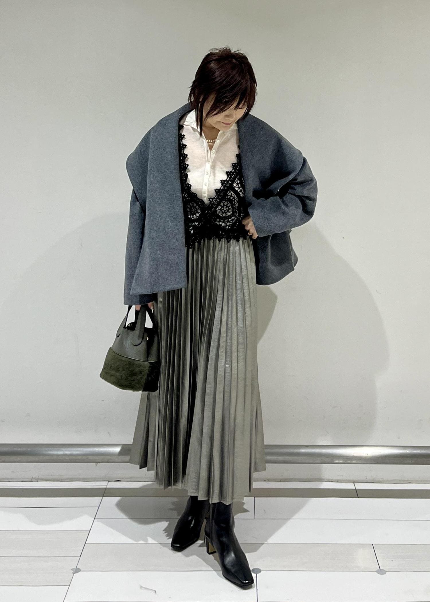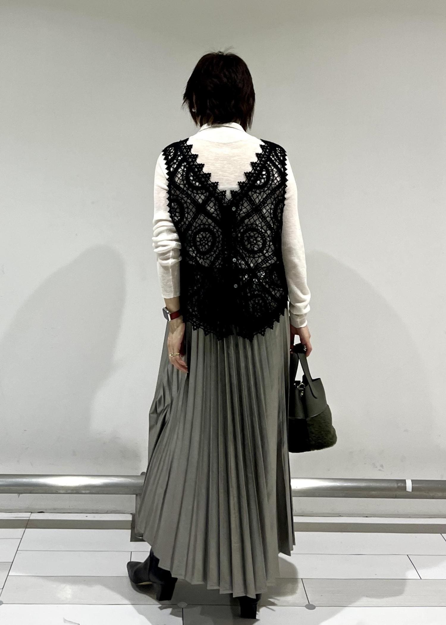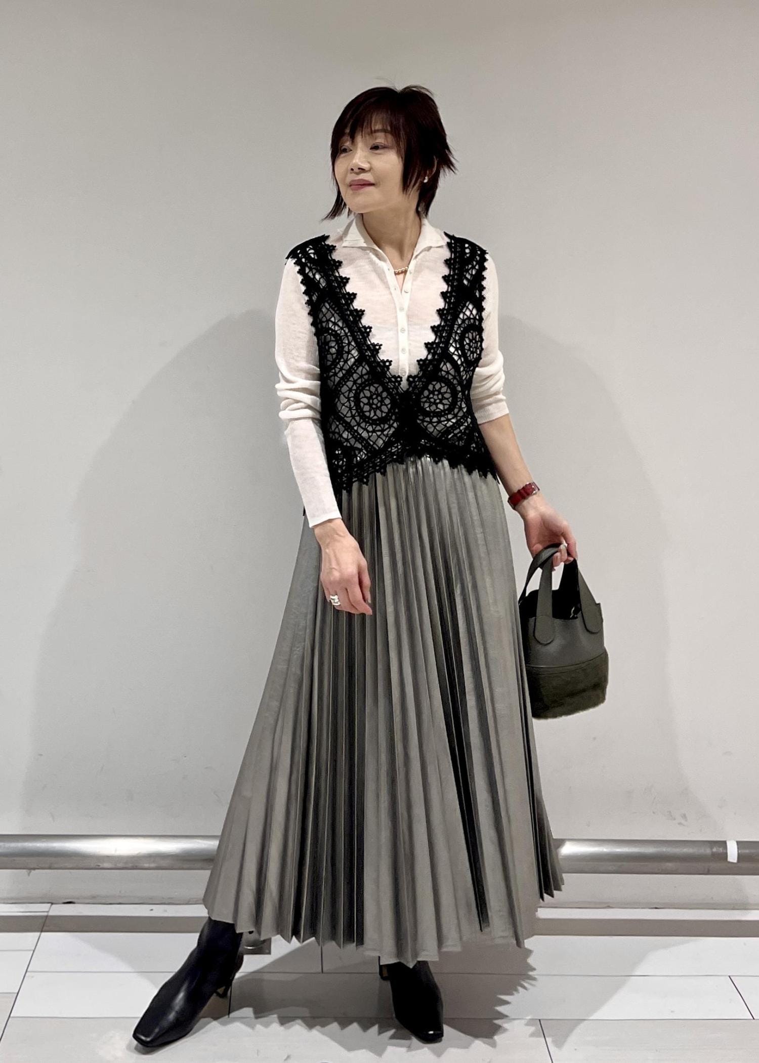 今回は白のシアーニットにレースジレをレイヤードし、目を引くメタリックなプリーツスカートでモノトーンのモードな印象のコーディネートに。