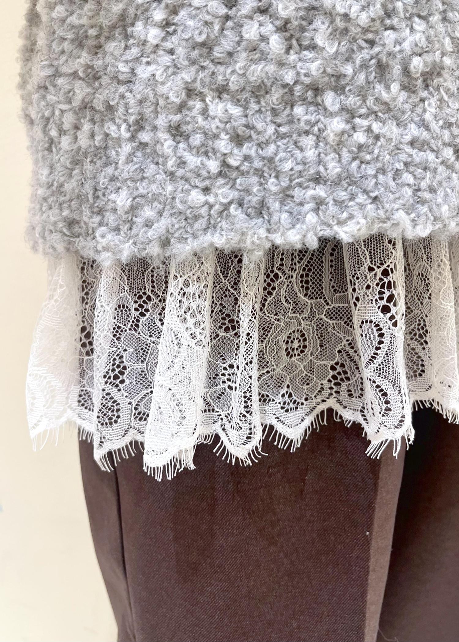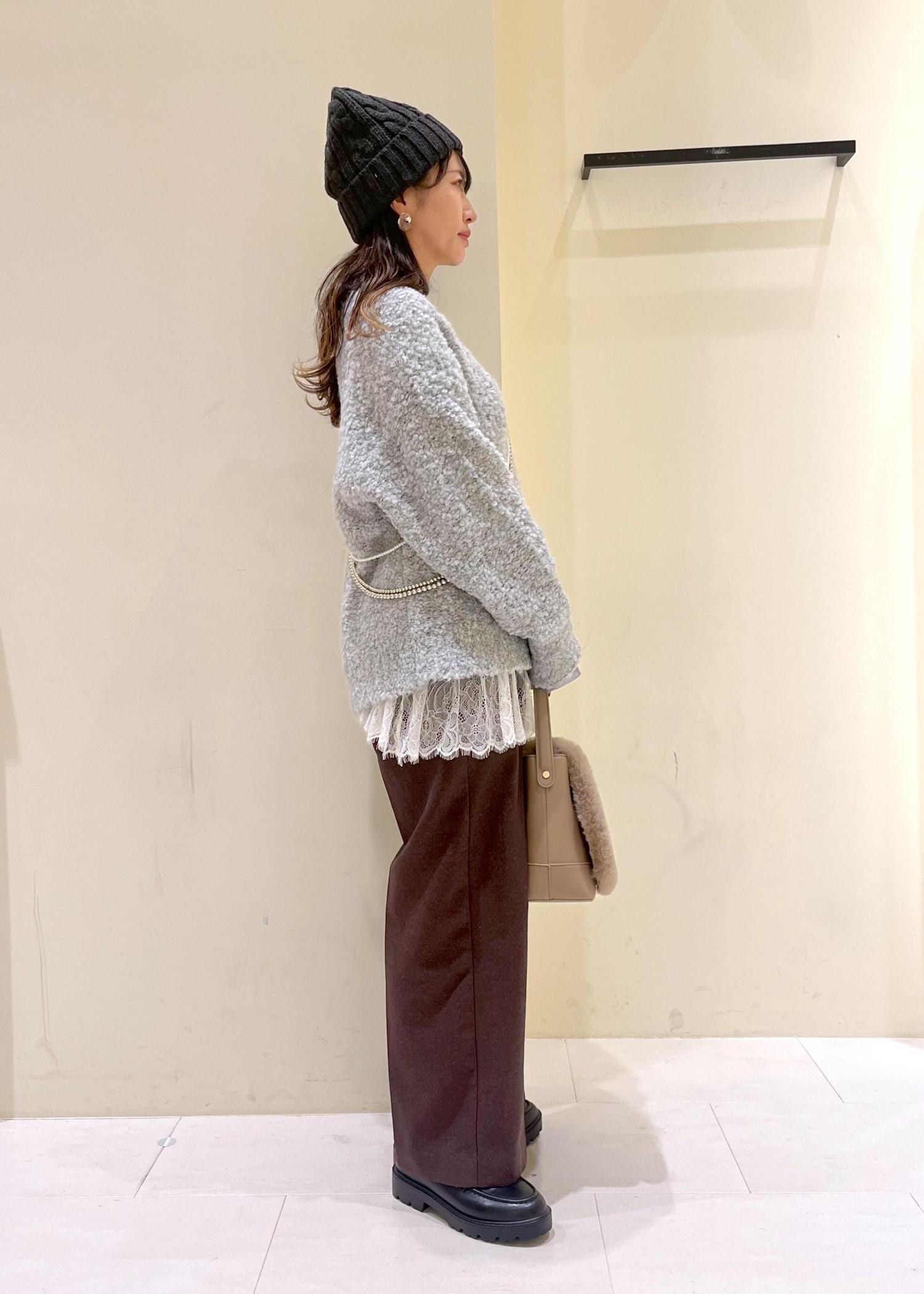 着丈長めのニットからレースビスチェを覗かせた体型カバーコーデ。