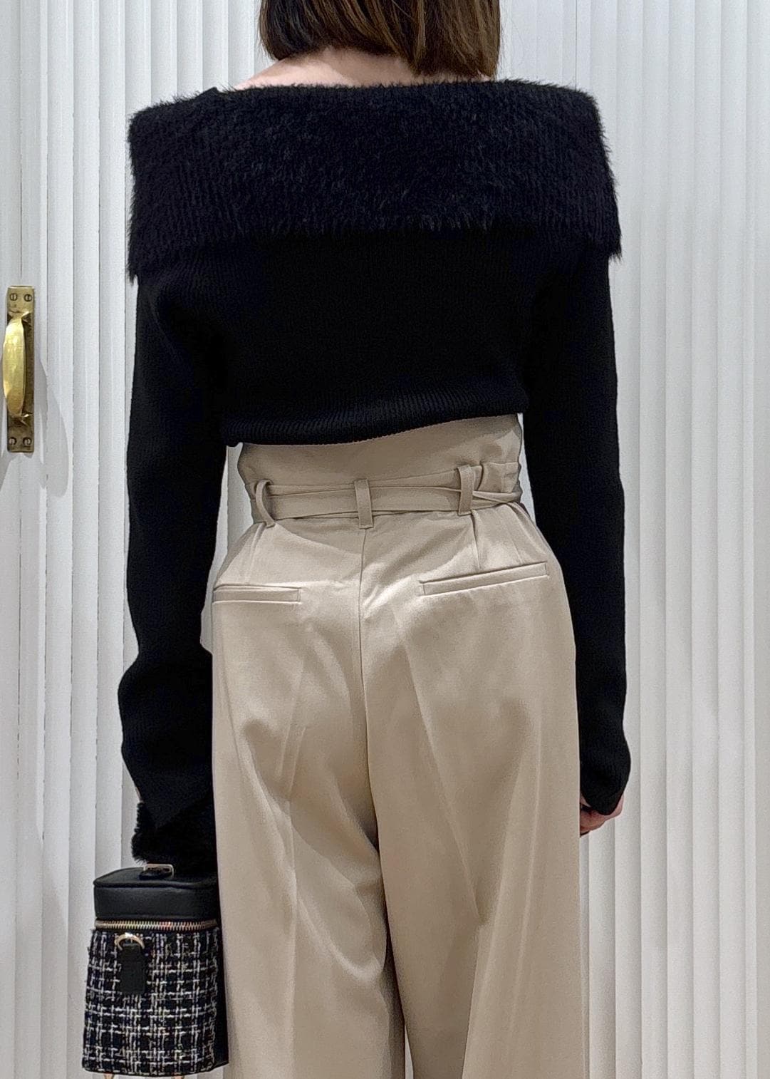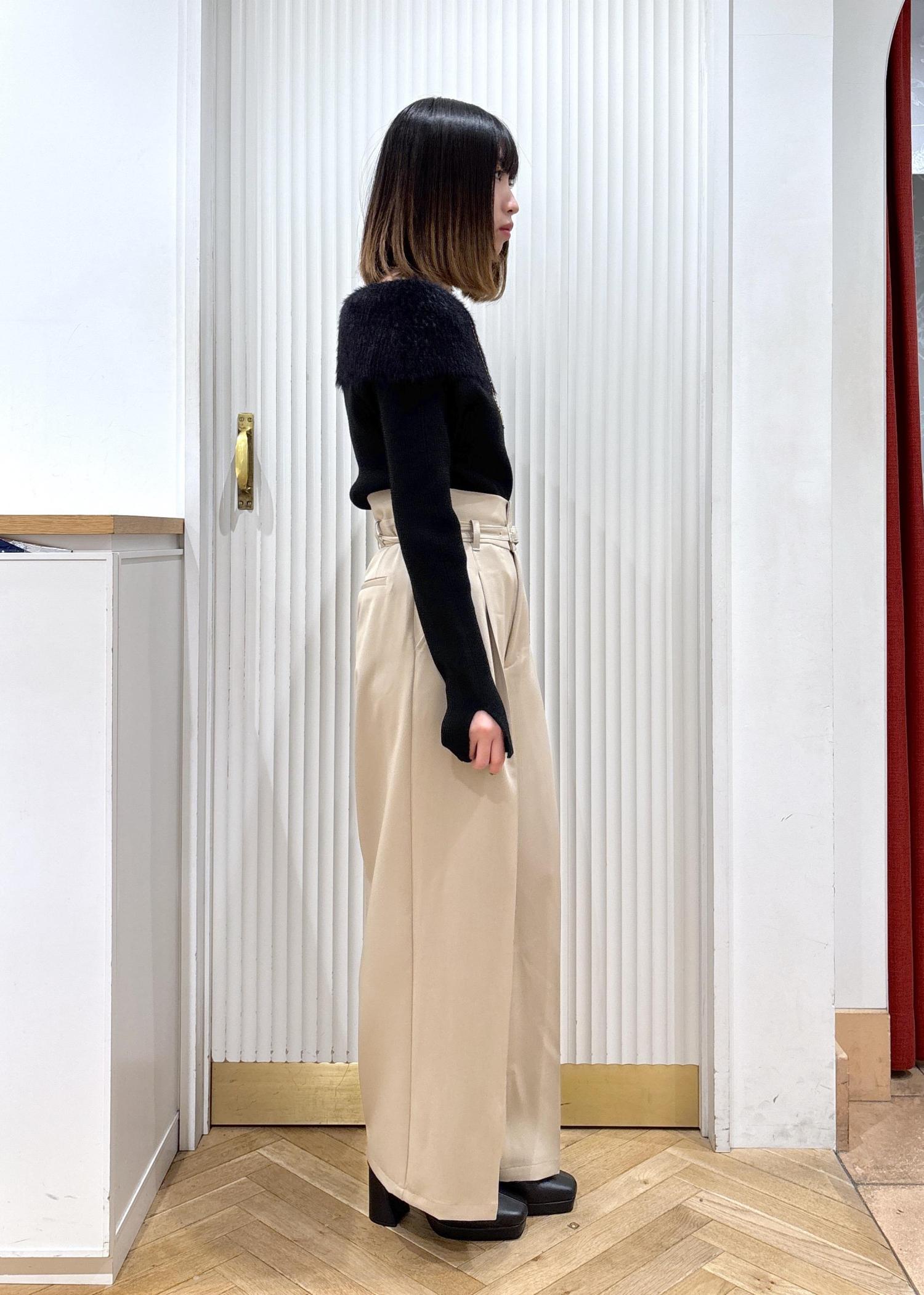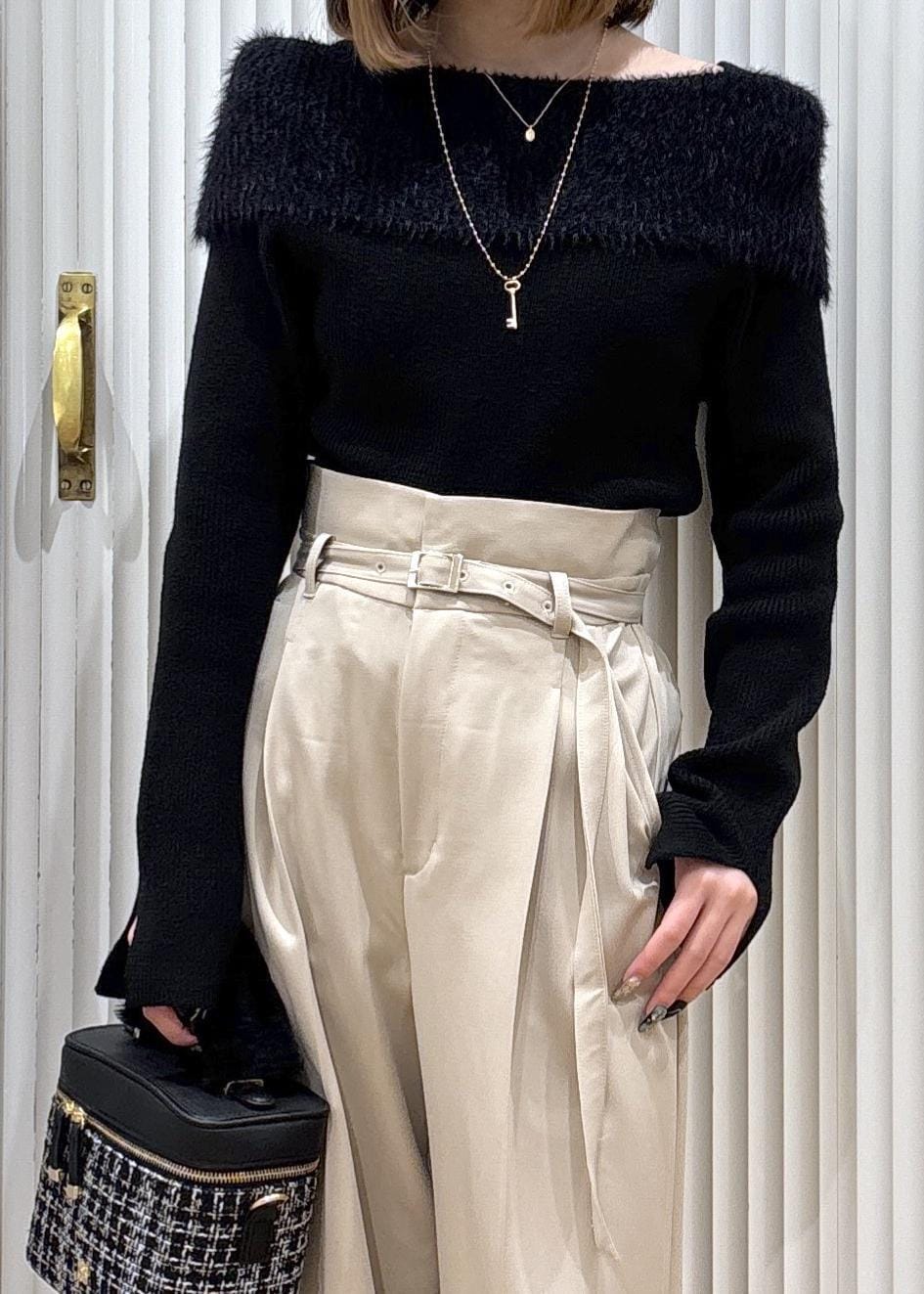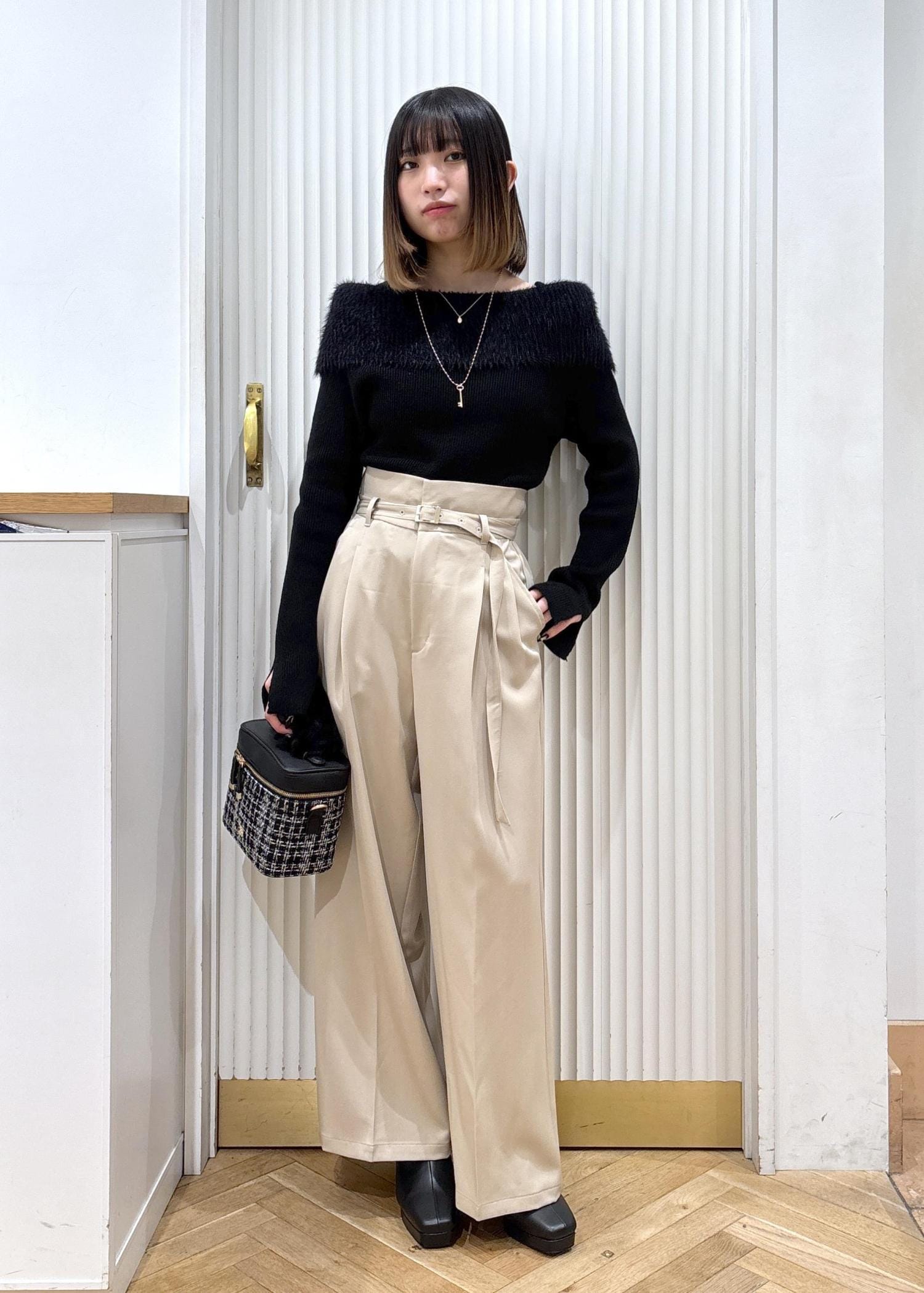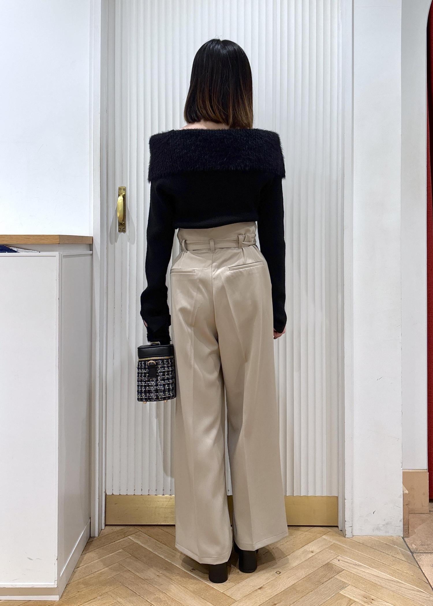 オフショルのニットにハイウエストのパンツを合わせた綺麗めなコーディネートです!パンツ以外を黒にする事でパンツの色味が強調され脚が長く見えやすいです!また上半身がシュッとして見えるため着膨れも防いでくれます!足元はヒールにする事でより脚の面積を増やす事でスタイルアップして見えます☺︎