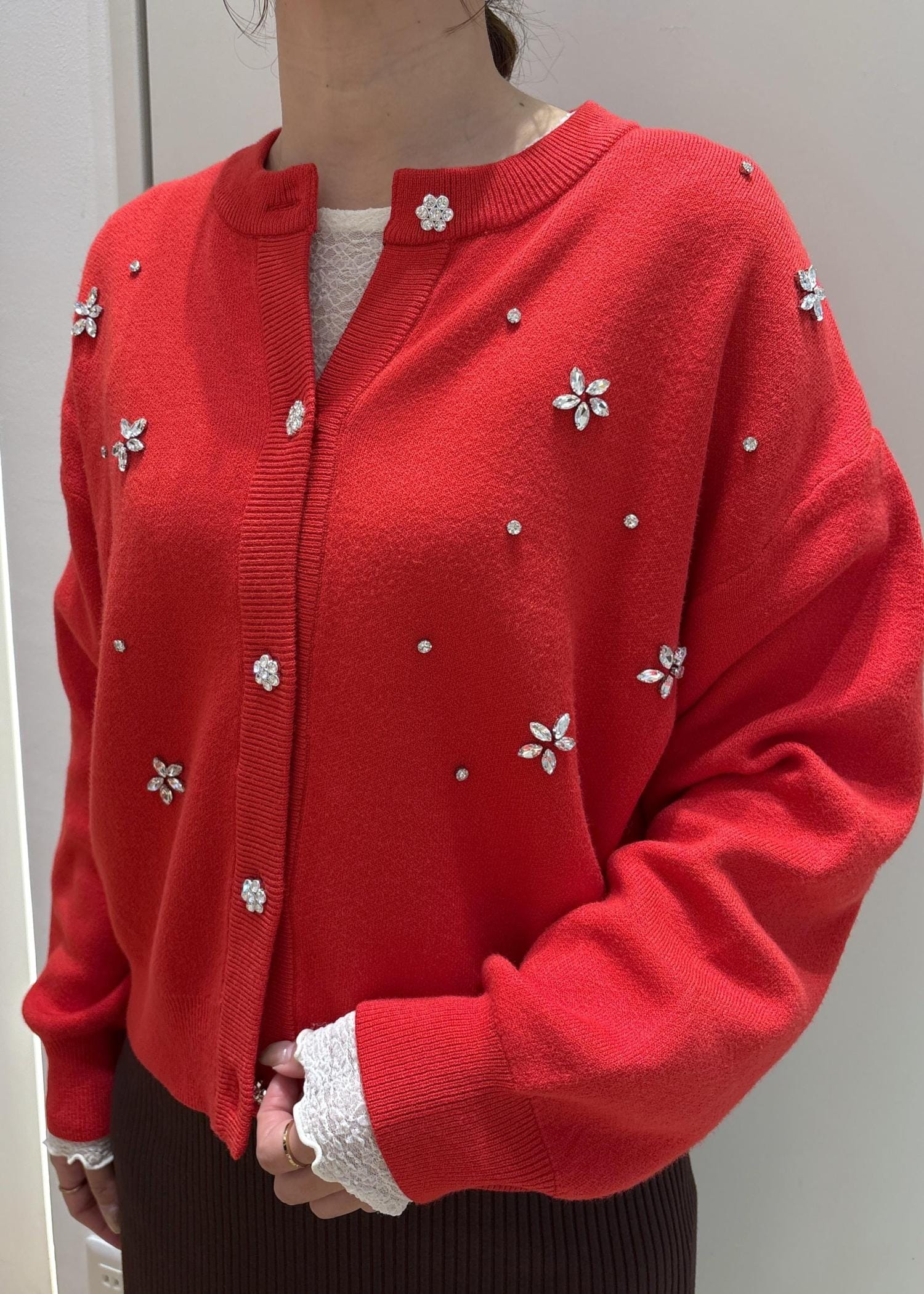 ROPÉ PICNICビジューニットカーディガンレッド / F¥5,995レビュー肉感のあるしっかりとした生地のカーディガン。