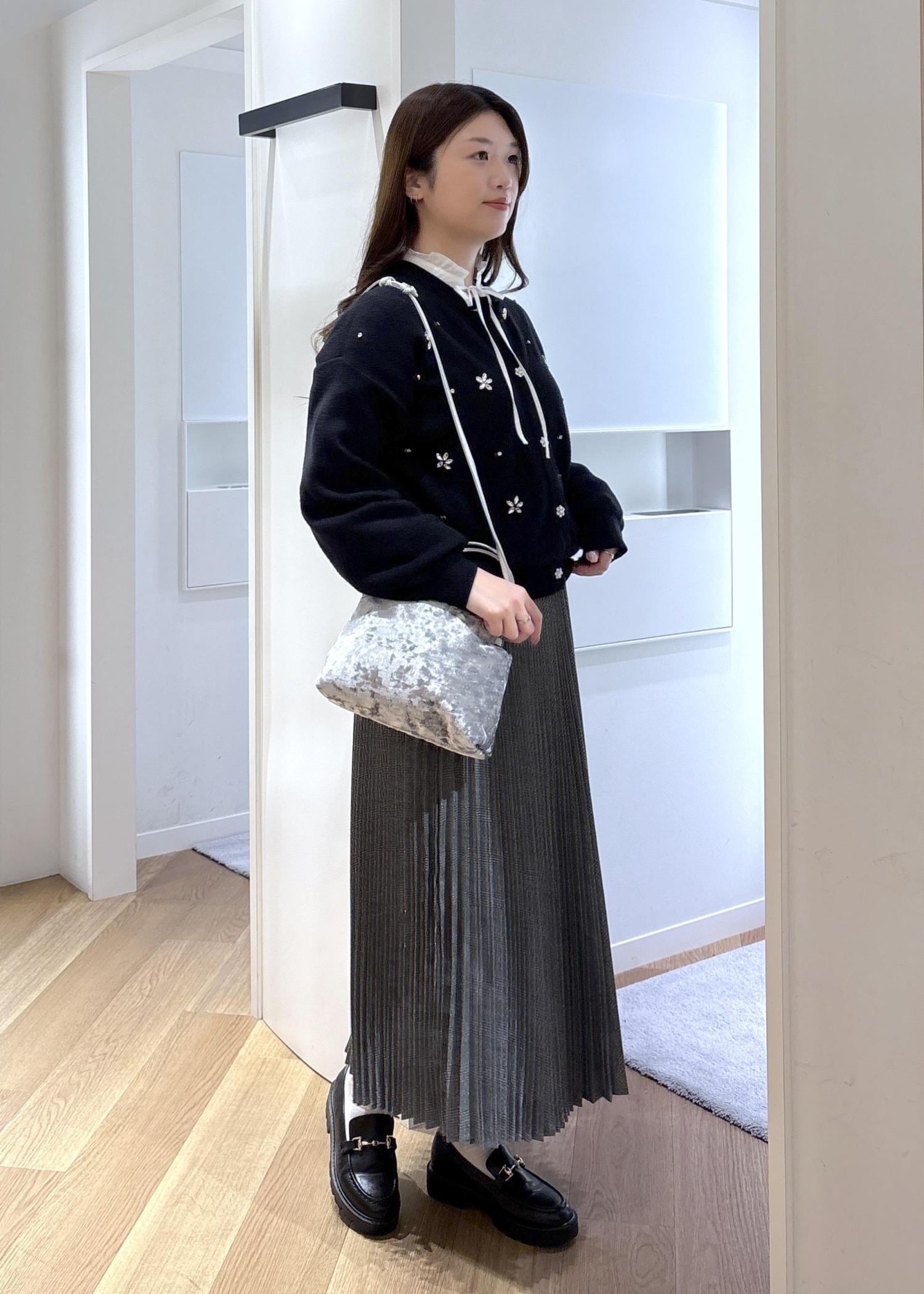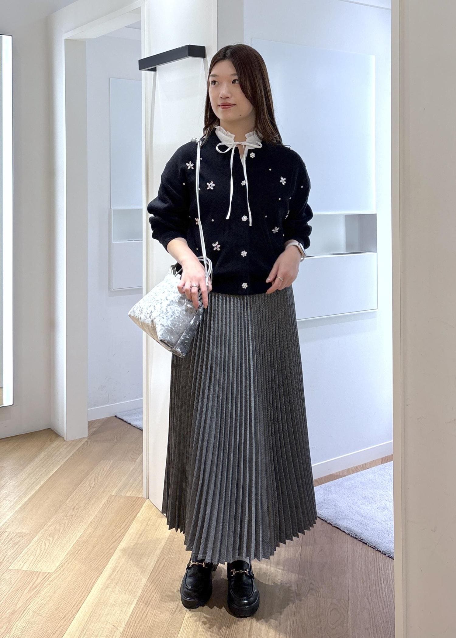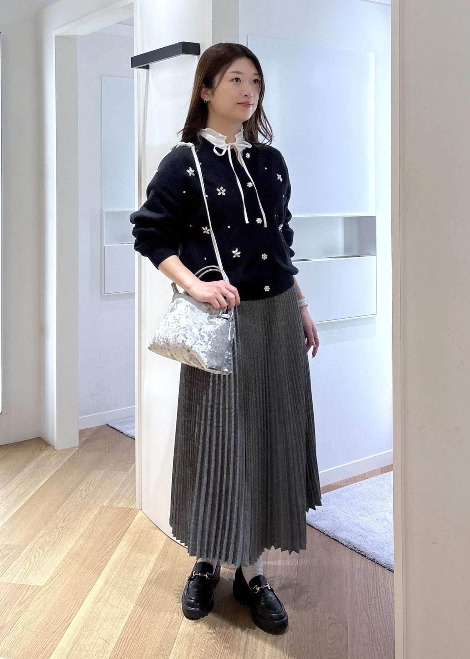 モノトーンカラーでまとめたコーデも地味にならず、華やかな印象ですね◎