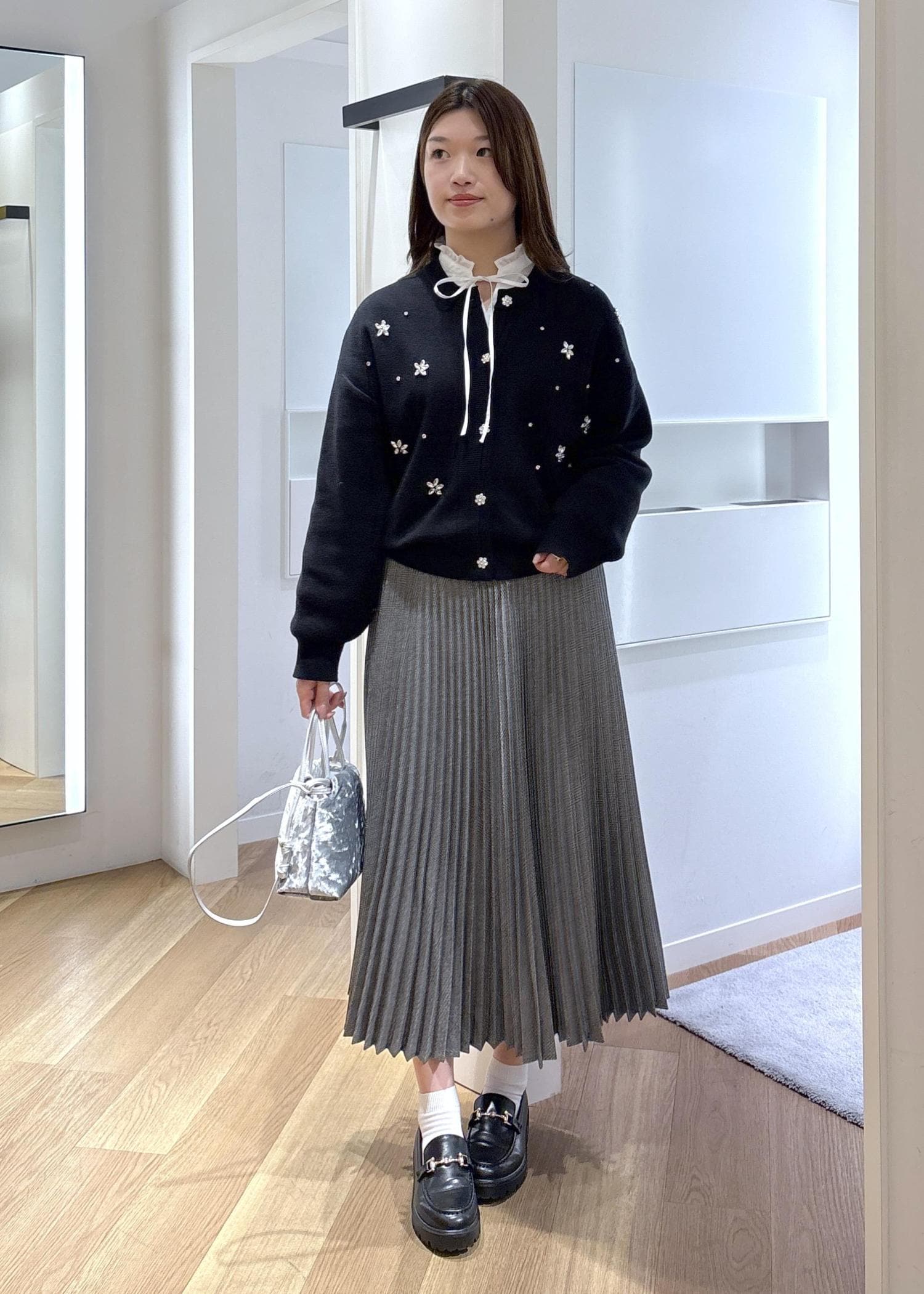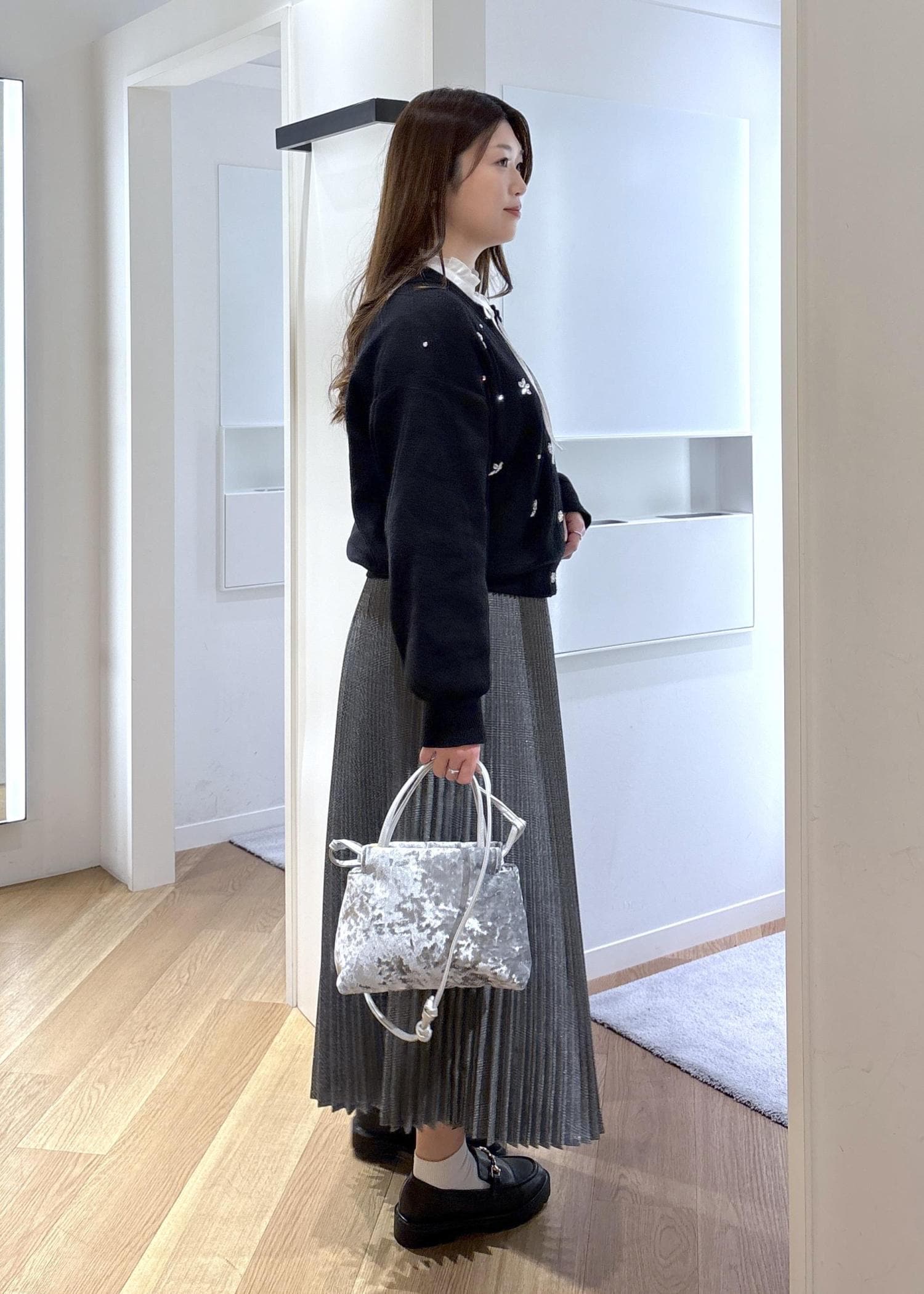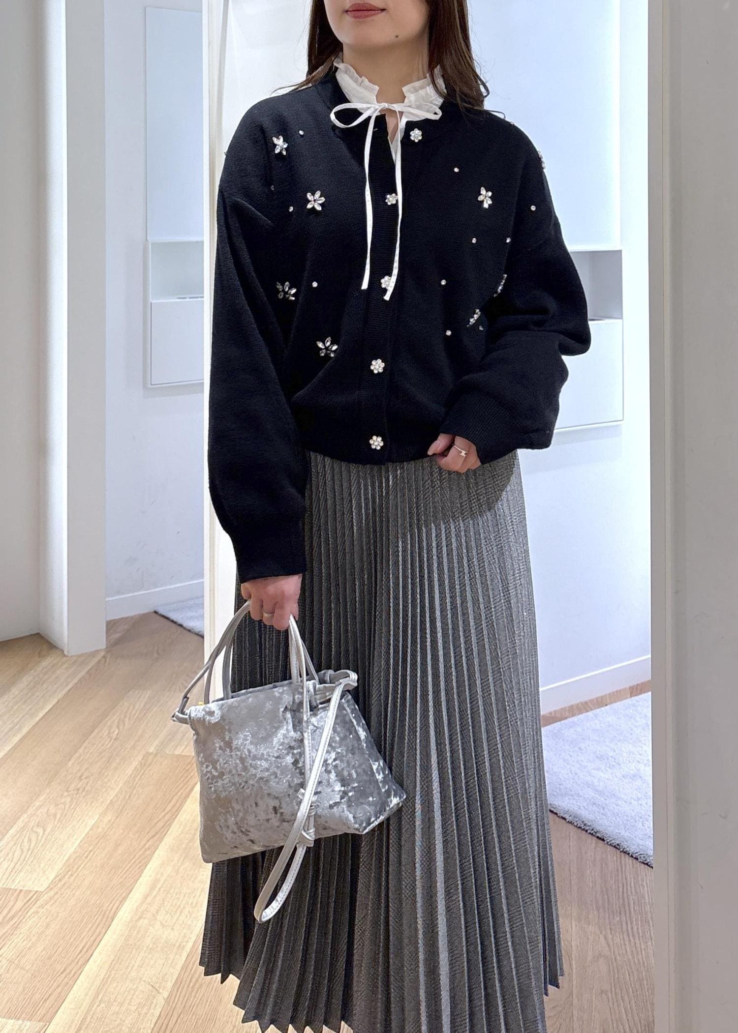 モノトーンカラーでまとめたコーデも地味にならず、華やかな印象ですね◎