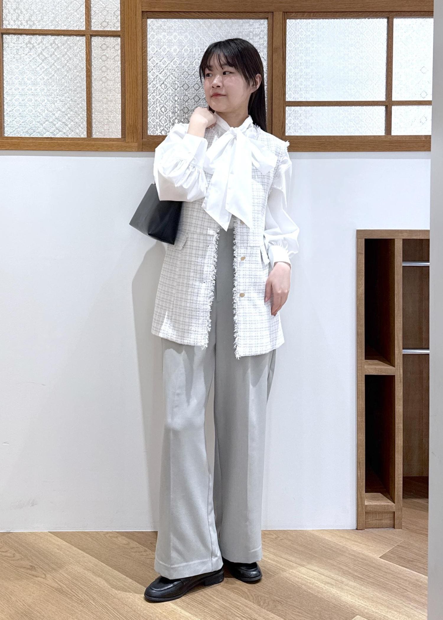 カーディガンのシルエットやボタン、また足がまっすぐ見えるワイドパンツからは綺麗見えする印象を感じられるのでお出かけにも着て頂きやすいです。