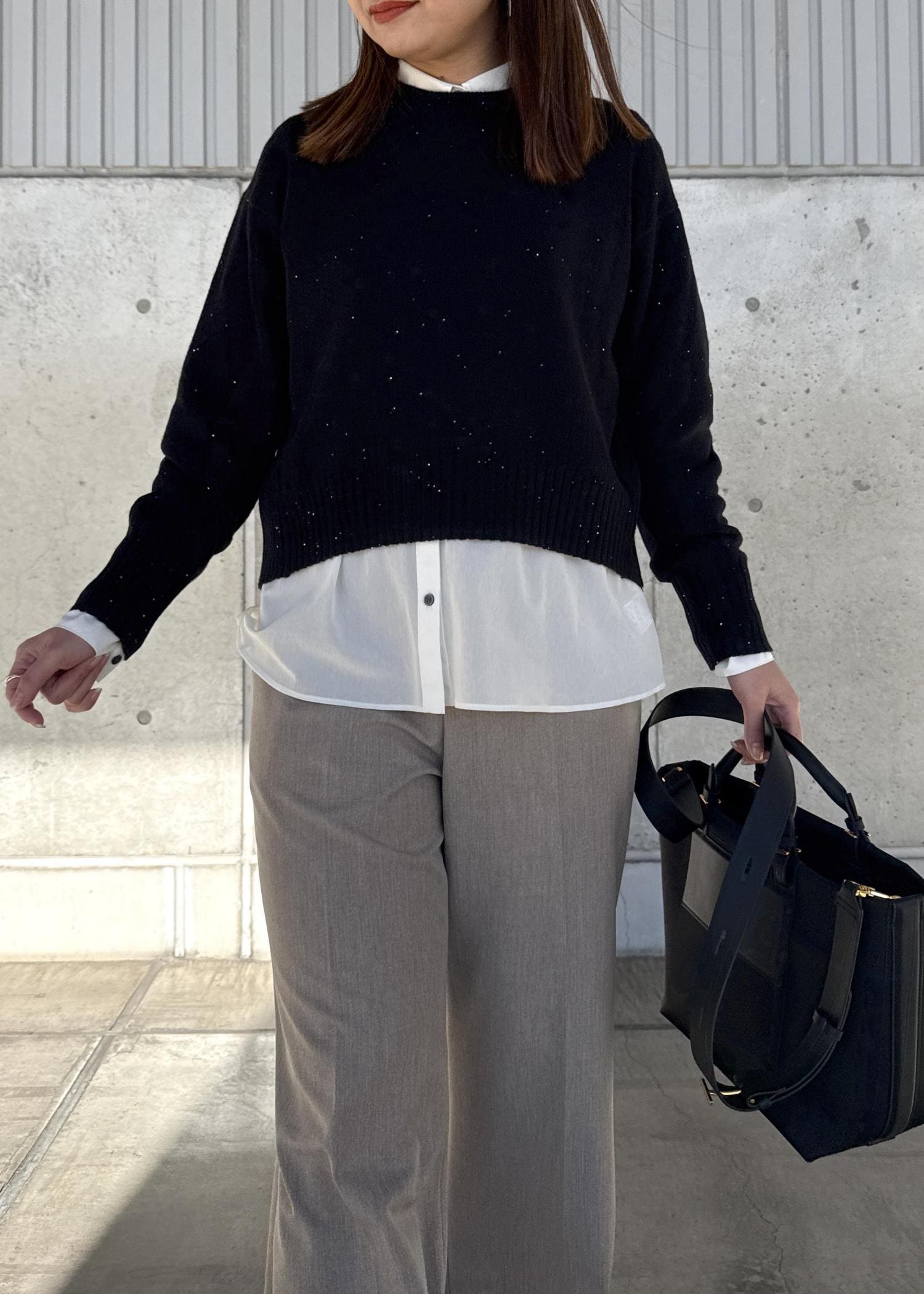 私は161センチなのでパンツで合わせると、フロントはおへそぐらいだったので、ワイドパンツやスカートと合わせる時はそのままでもいいですが、シャツとレイヤードする着方が一押しです。