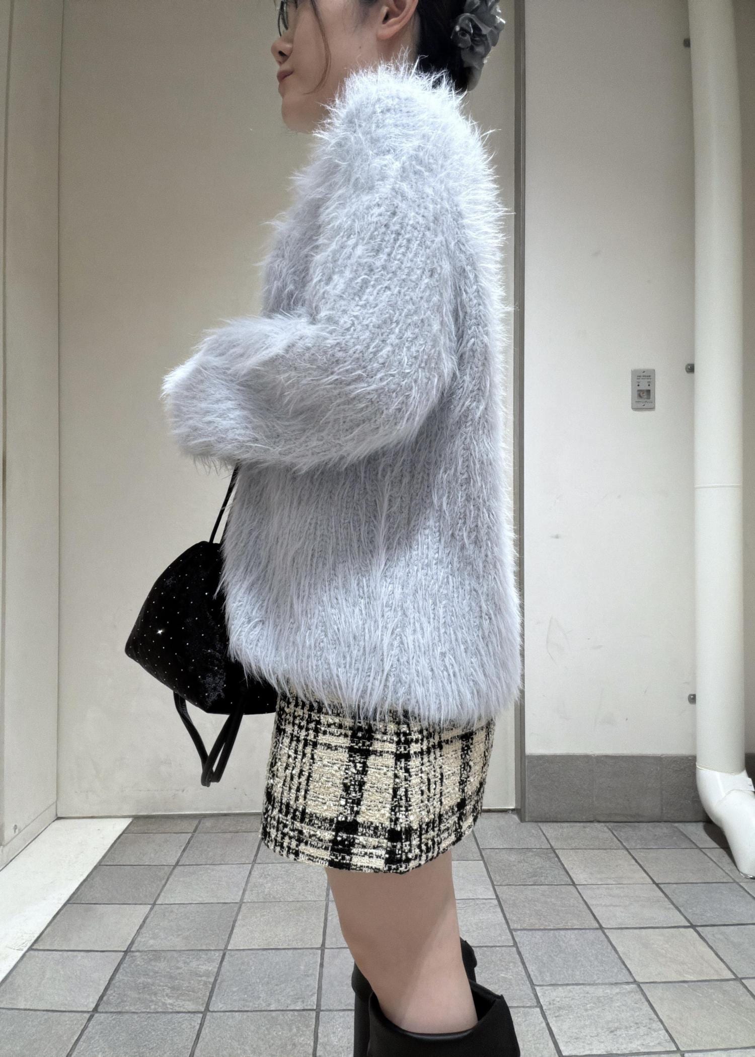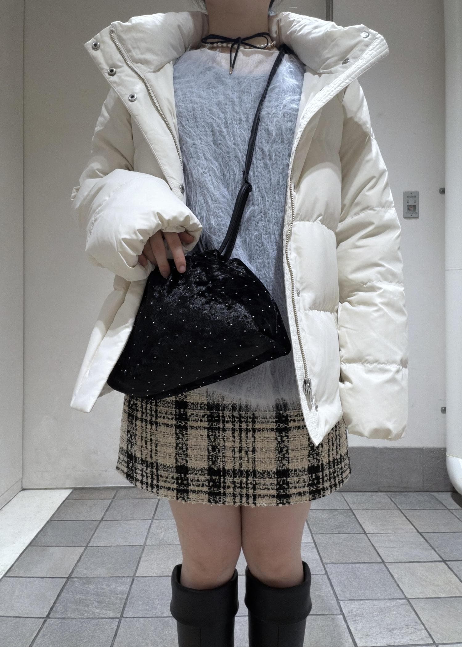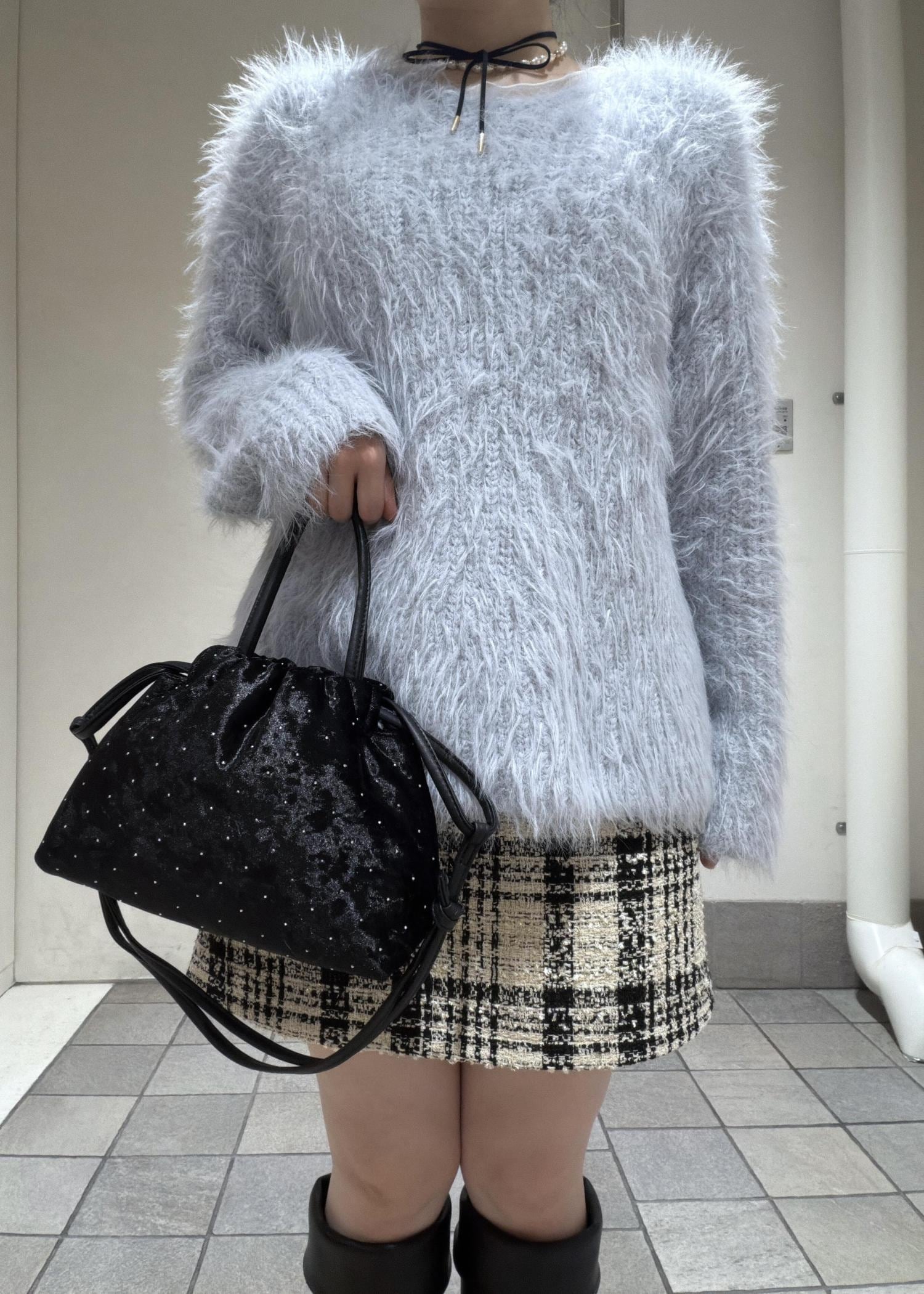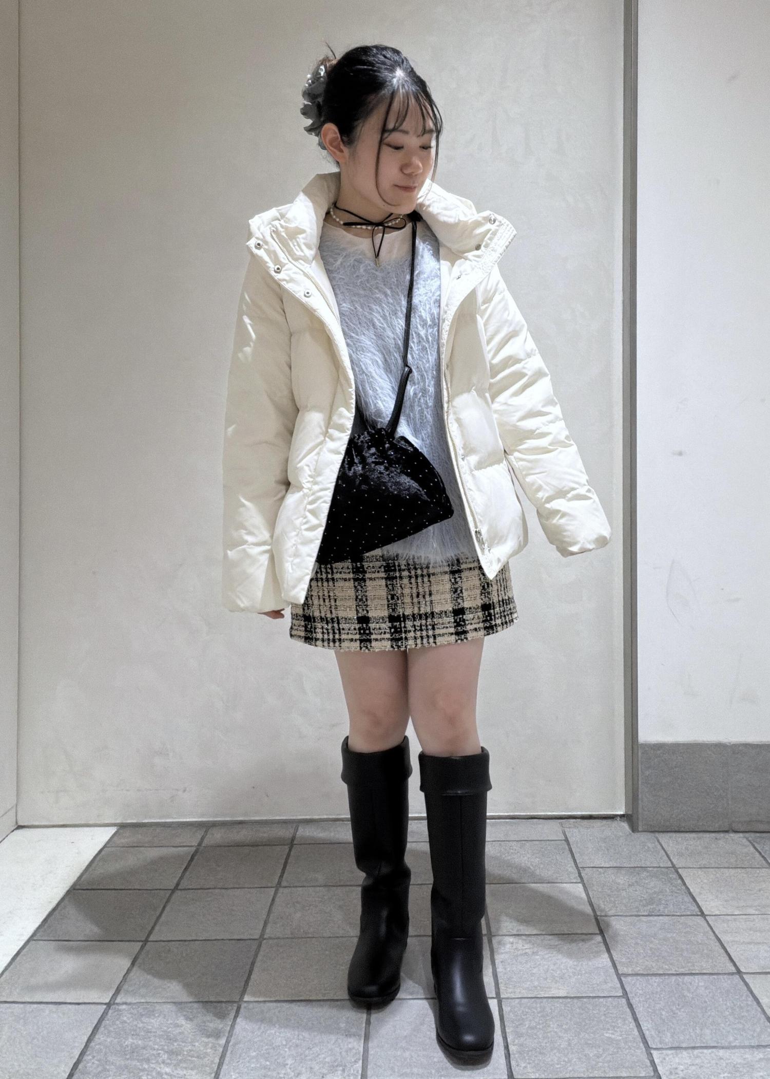クリスマスのお出かけをイメージしてコーディネートしてみました!スカートやバッグにキラキラを取り入れて、トップスは冬を感じるフェザー素材で、大好きな水色をメインにしました!小物は黒で揃えましたが、アウターは白にしてかわいさをプラスしたところがポイントです◎