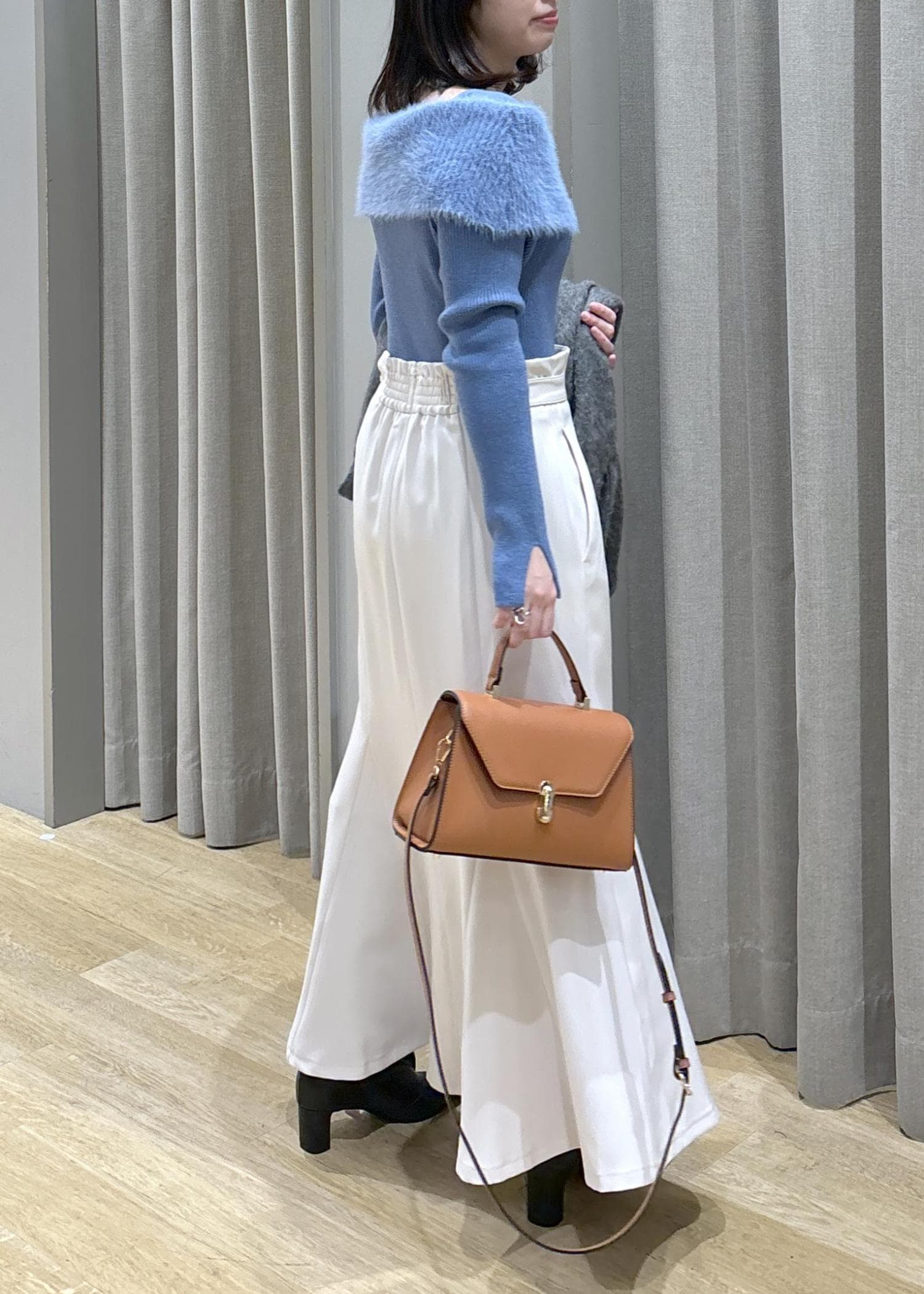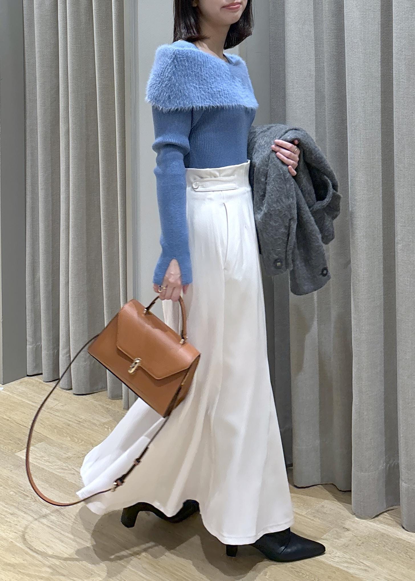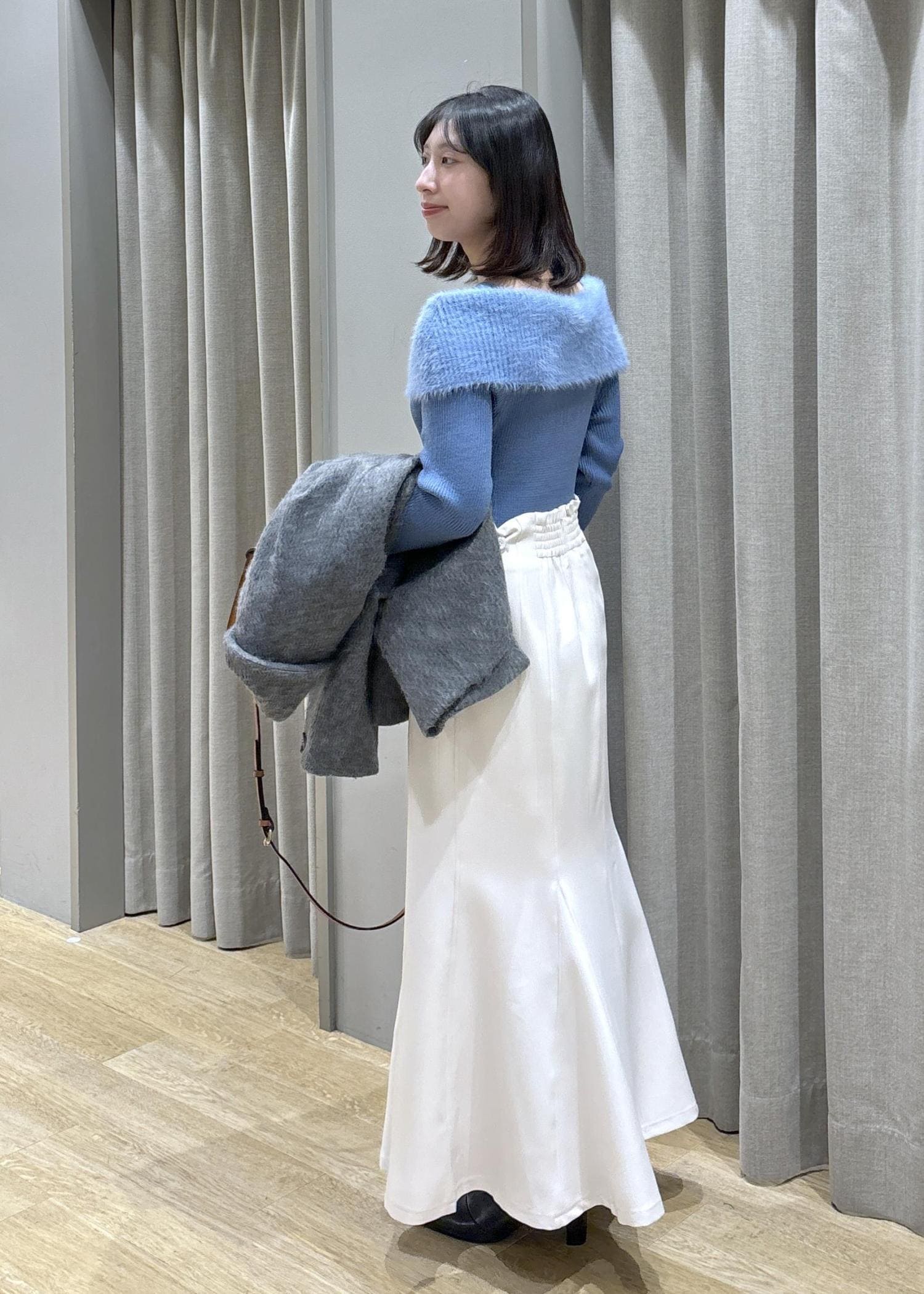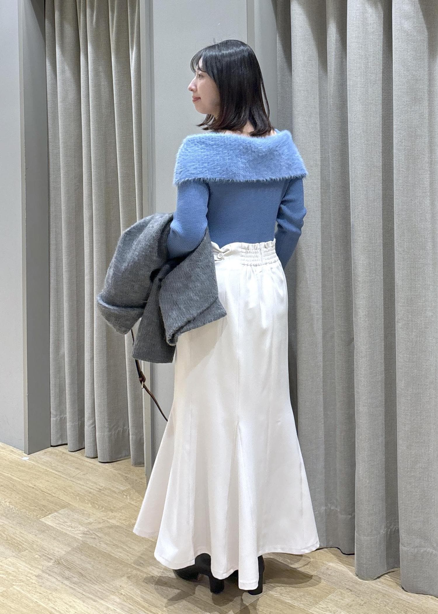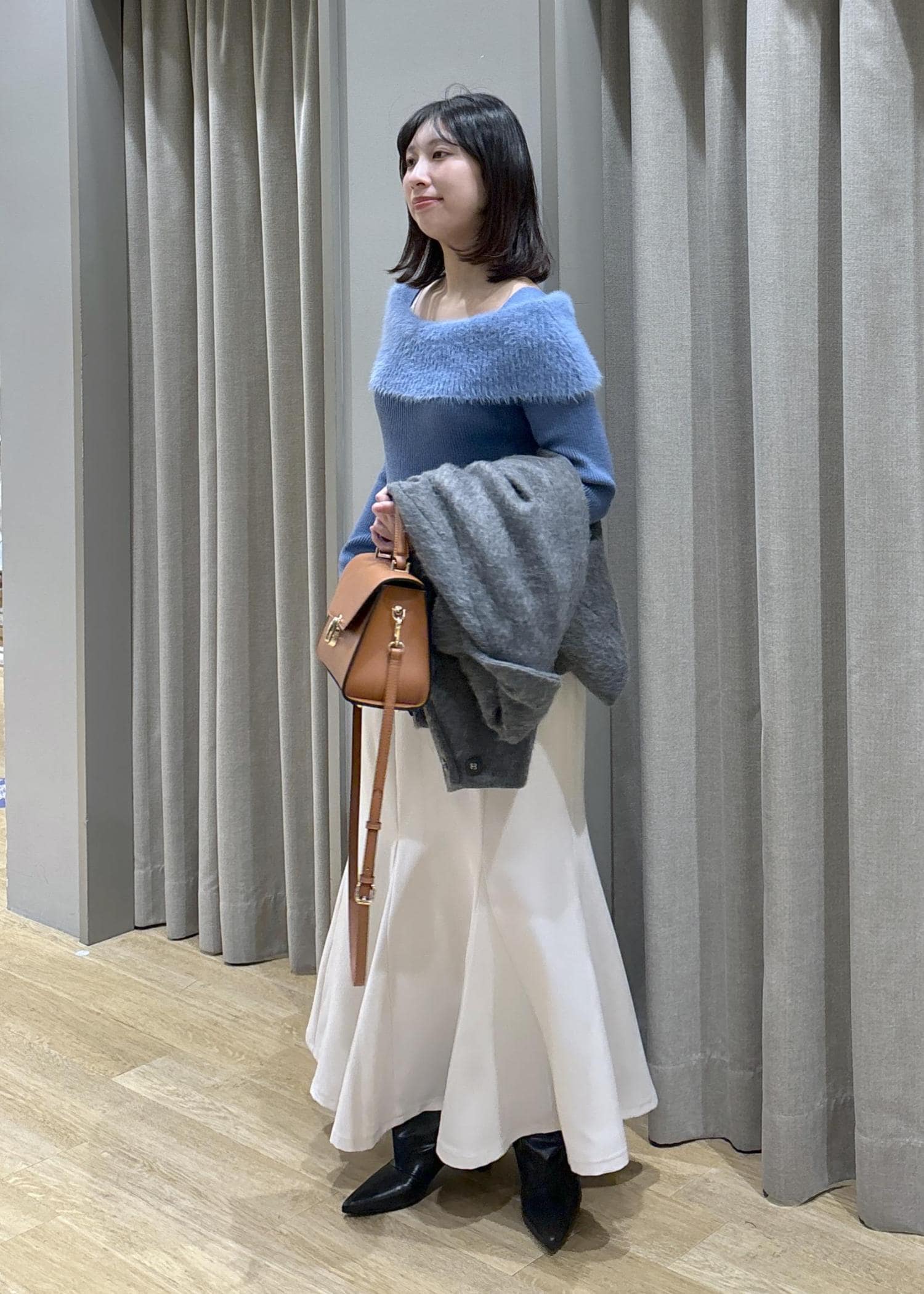NEW!VISフェザーヤーンオフショルもちもちリブニット/イージーケアブルー系 / F¥5,929レビュー身長158cm、Fサイズ着用。