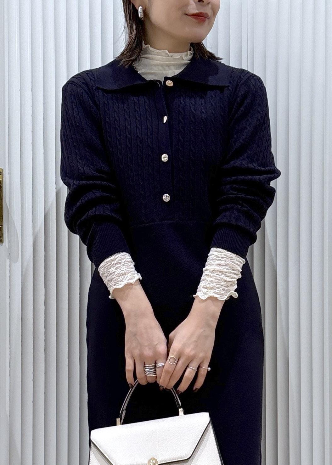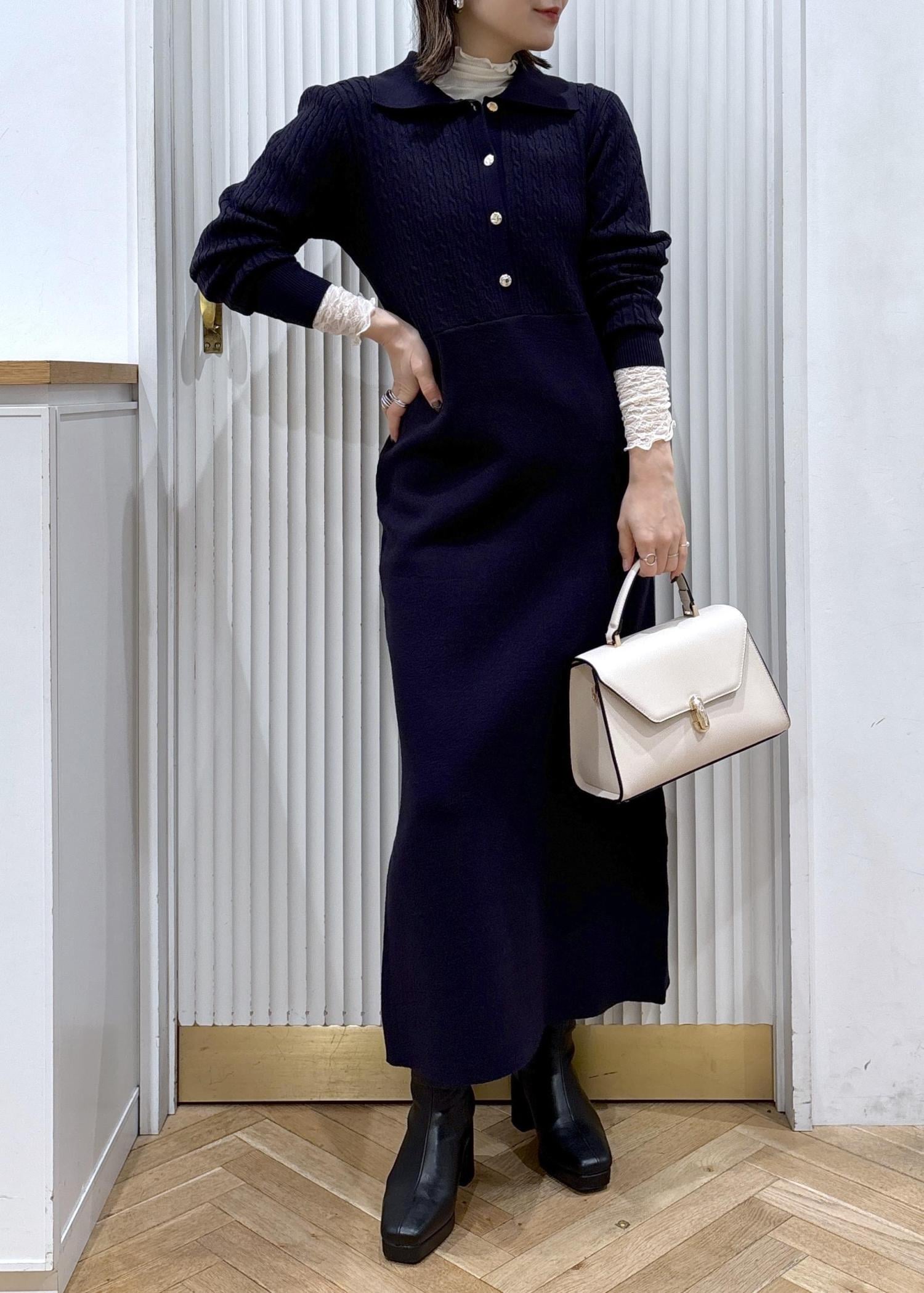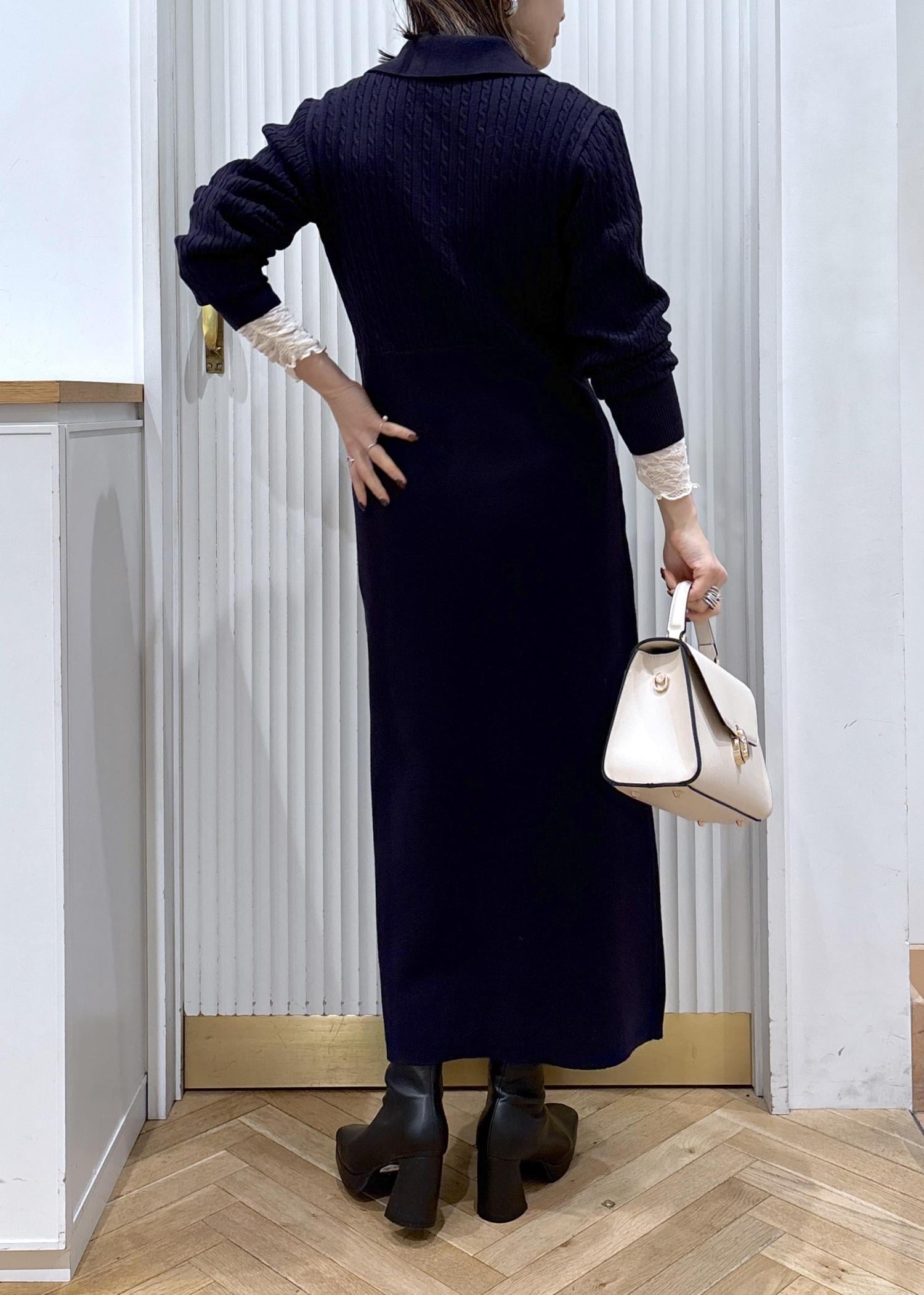 もっちりとした肌触りの素材で、柔らかく身体に添う女性らしいラインが着るだけでキマるワンピース。ミニケーブル編みの切り替えデザインがシンプル過ぎず着映えしてくれます。